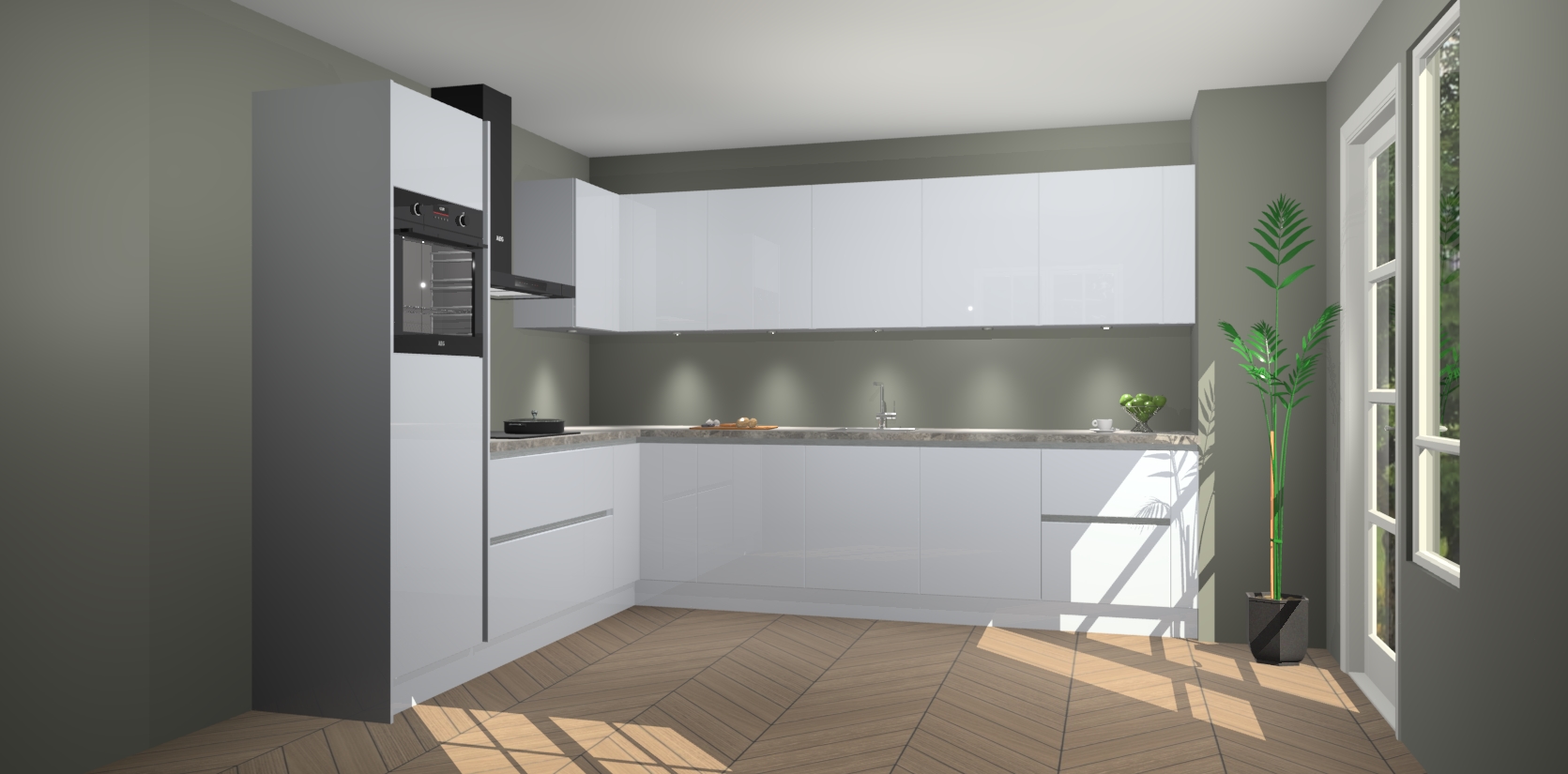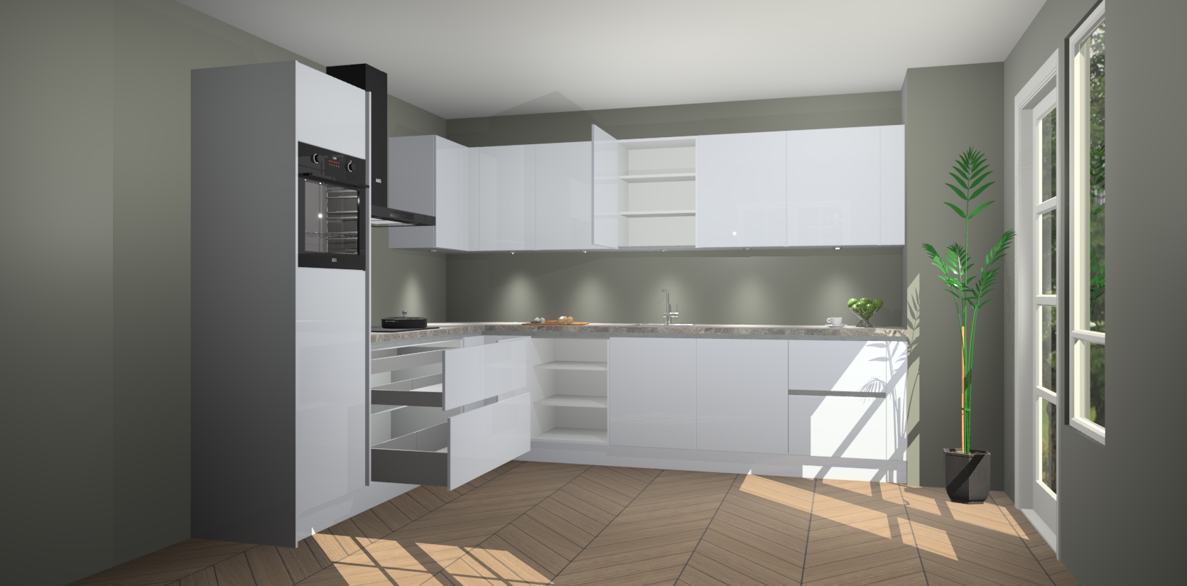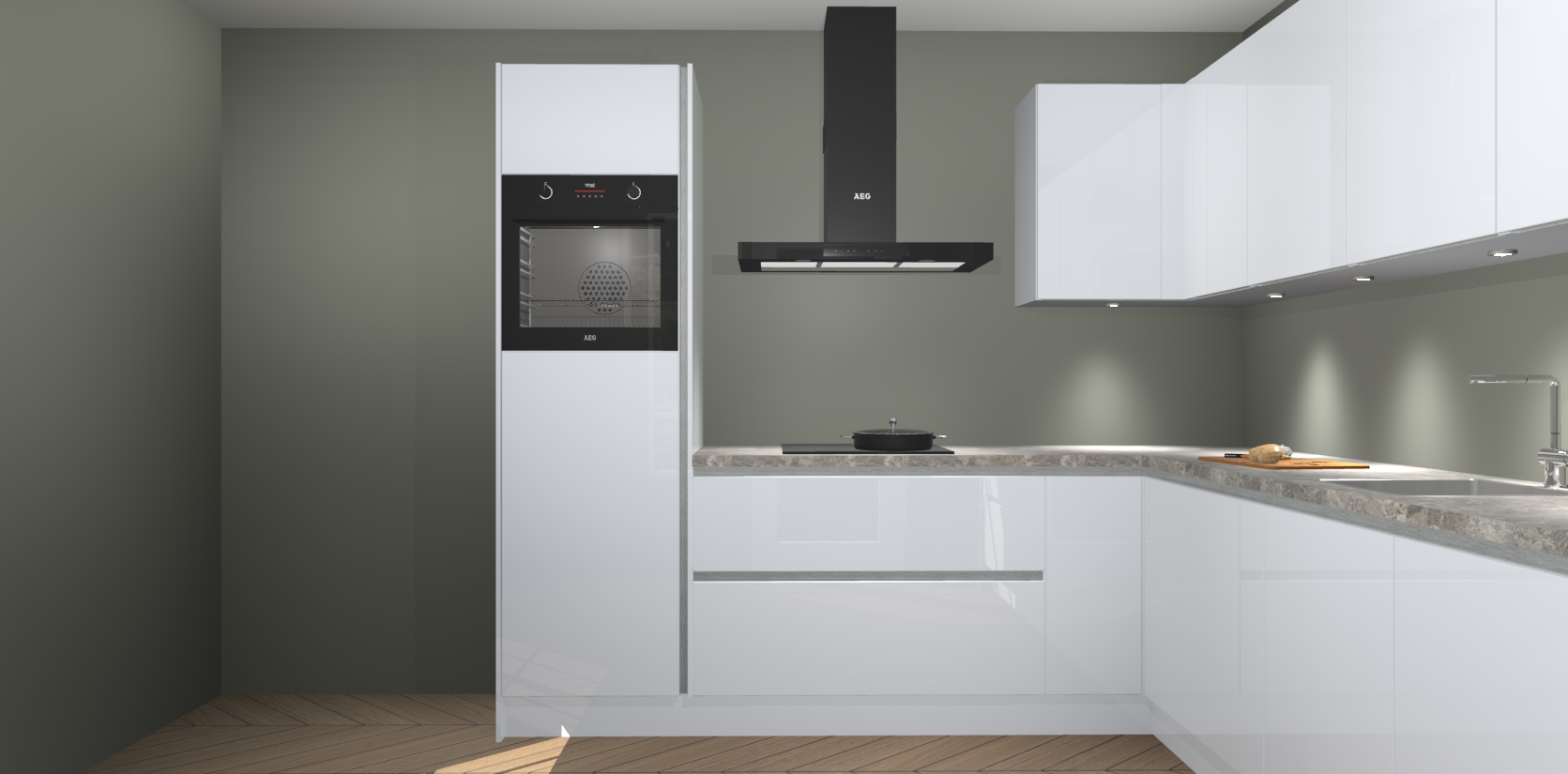 De Sneeuwwitte hoogglans greeploze keuken Debar is uitgerust met vijf inbouwapparaten die elke kooktaak handig en efficiënt maken. Een oven, inductiekookplaat, afzuigkap, vaatwasser en koelkast zijn standaard, maar kunnen na bestelling eenvoudig worden geupgrade naar AEG. Profiteer vervolgens van de softclose deuren voor snelle toegang en geruisloze toegang.