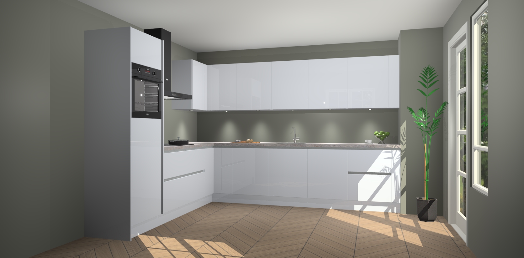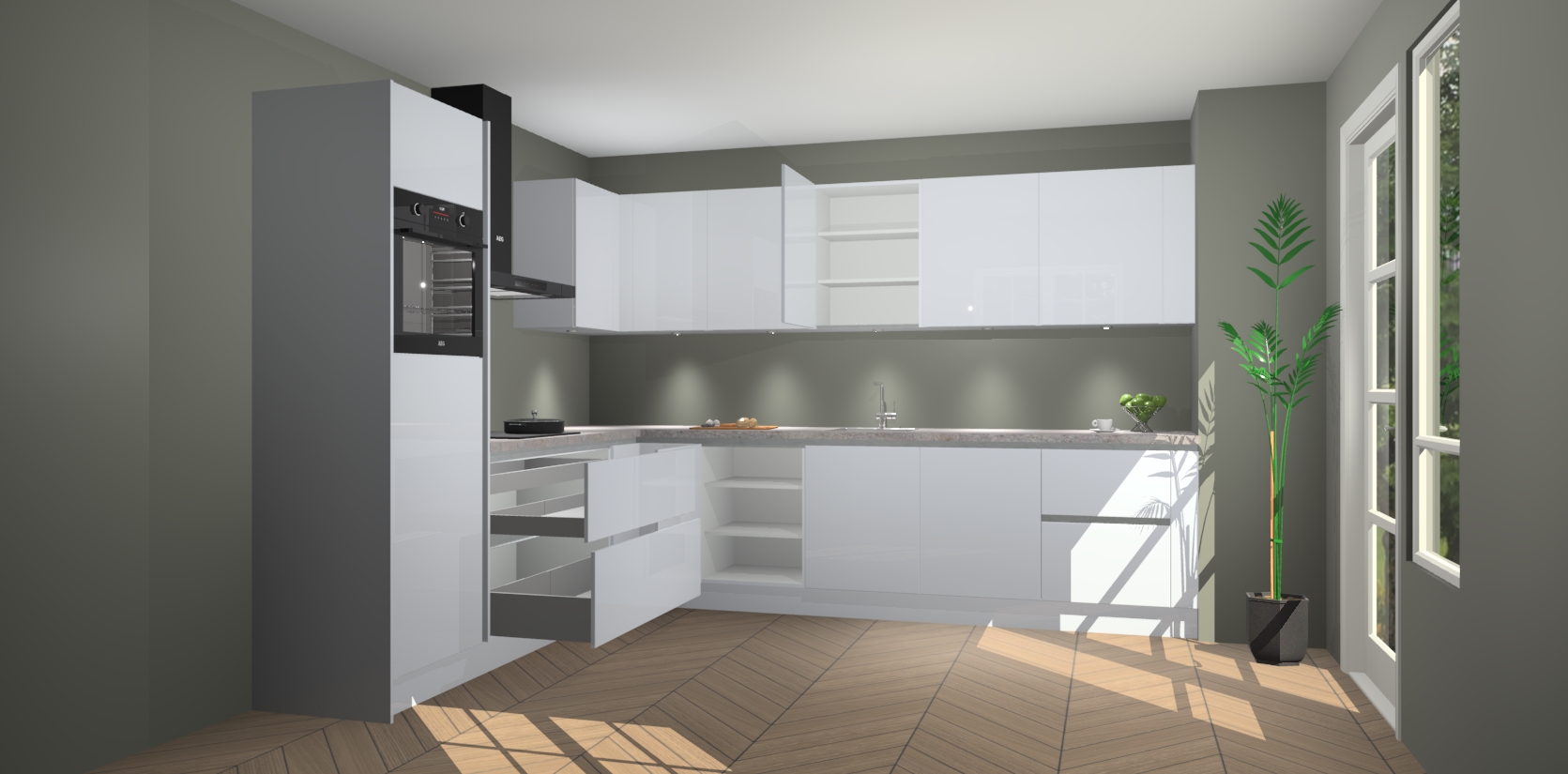 De Sneeuwwitte hoogglans greeploze keuken Debar is uitgerust met vijf inbouwapparaten die elke kooktaak handig en efficiënt maken. Een oven, inductiekookplaat, afzuigkap, vaatwasser en koelkast zijn standaard, maar kunnen na bestelling eenvoudig worden geupgrade naar AEG. Profiteer vervolgens van de softclose deuren voor snelle toegang en geruisloze toegang.