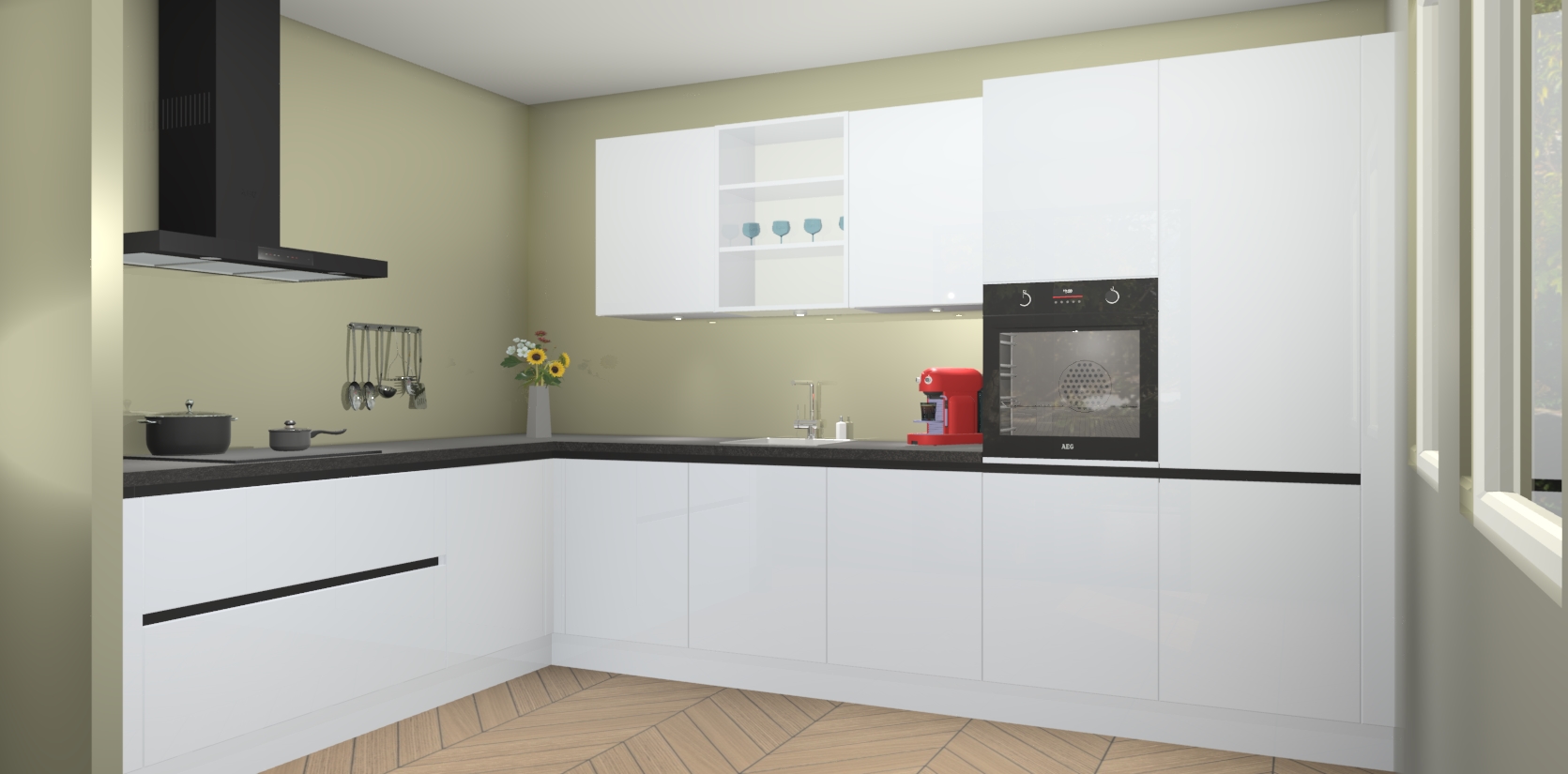 De Sneeuwwitte hoogglans greeploze keuken Gotenburg is zo ontworpen dat u alle mogelijke vormen van opslagruimte kunt genieten. Bovendien heeft u meteen toegang tot vijf ingebouwde apparaten: een oven, inductiekookplaat, afzuigkap, vaatwasser en koelkast. Gewoon upgraden naar AEG na bestelling? Dit kan heel gemakkelijk worden geregeld. De deuren sluiten zacht dankzij zachtsluitende scharnieren en ze houden warmte vast terwijl ze uitzonderlijk stil blijven wanneer ze worden geopend of gesloten.