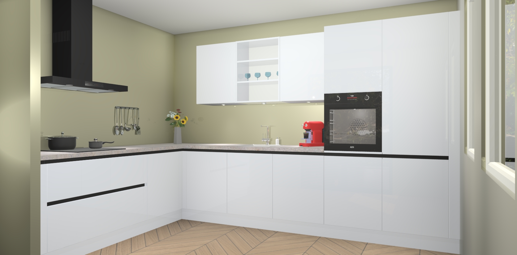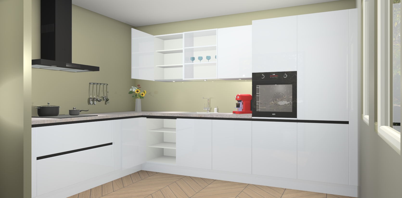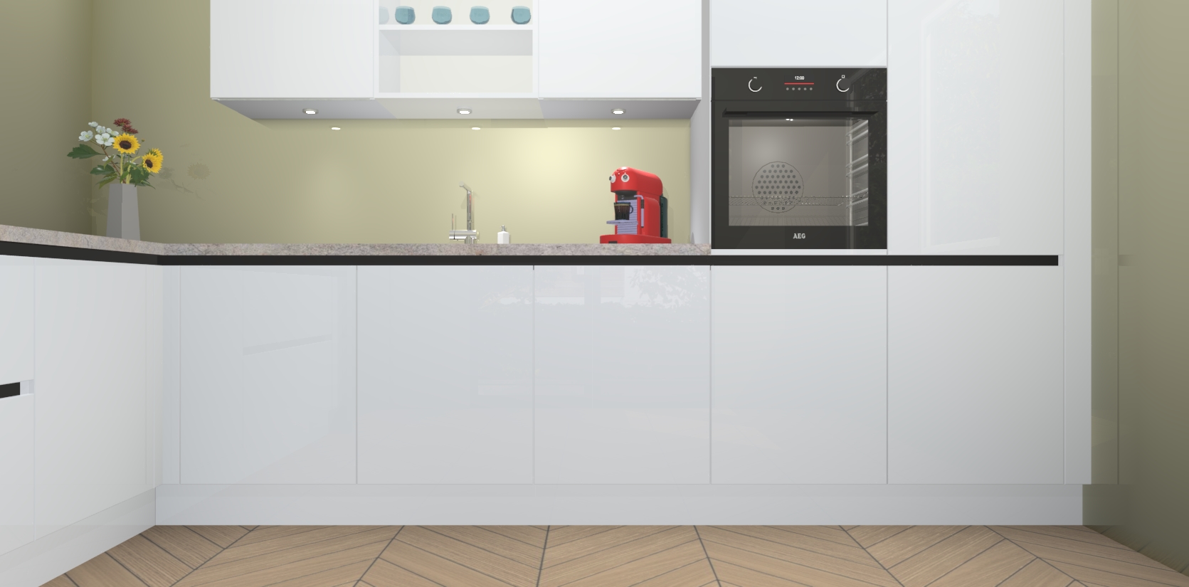 De Sneeuwwitte hoogglans greeploze keuken Gotenburg is zo ontworpen dat u alle mogelijke vormen van opslagruimte kunt genieten. Bovendien heeft u meteen toegang tot vijf ingebouwde apparaten: een oven, inductiekookplaat, afzuigkap, vaatwasser en koelkast. Gewoon upgraden naar AEG na bestelling? Dit kan heel gemakkelijk worden geregeld. De deuren sluiten zacht dankzij zachtsluitende scharnieren en ze houden warmte vast terwijl ze uitzonderlijk stil blijven wanneer ze worden geopend of gesloten.