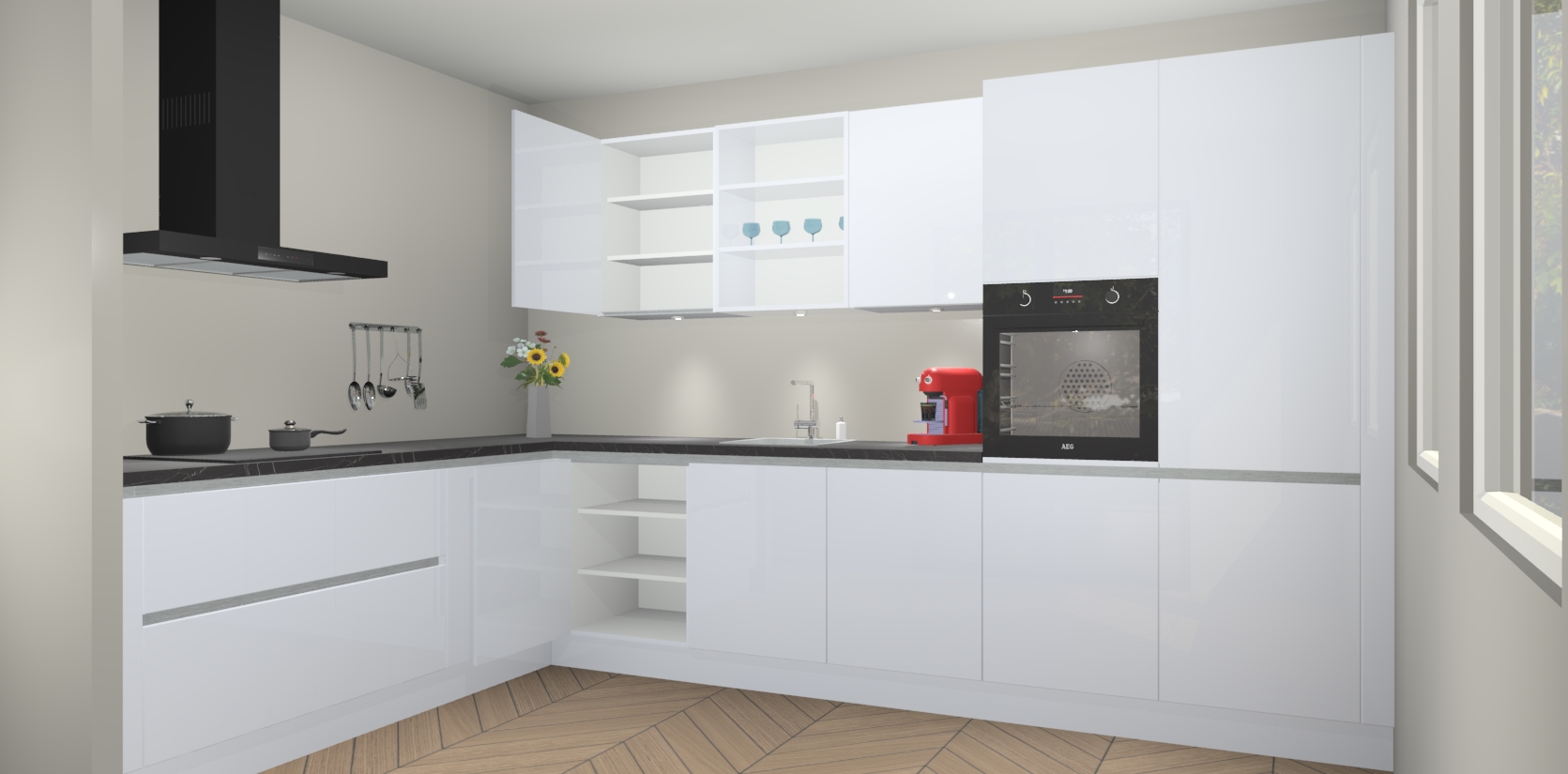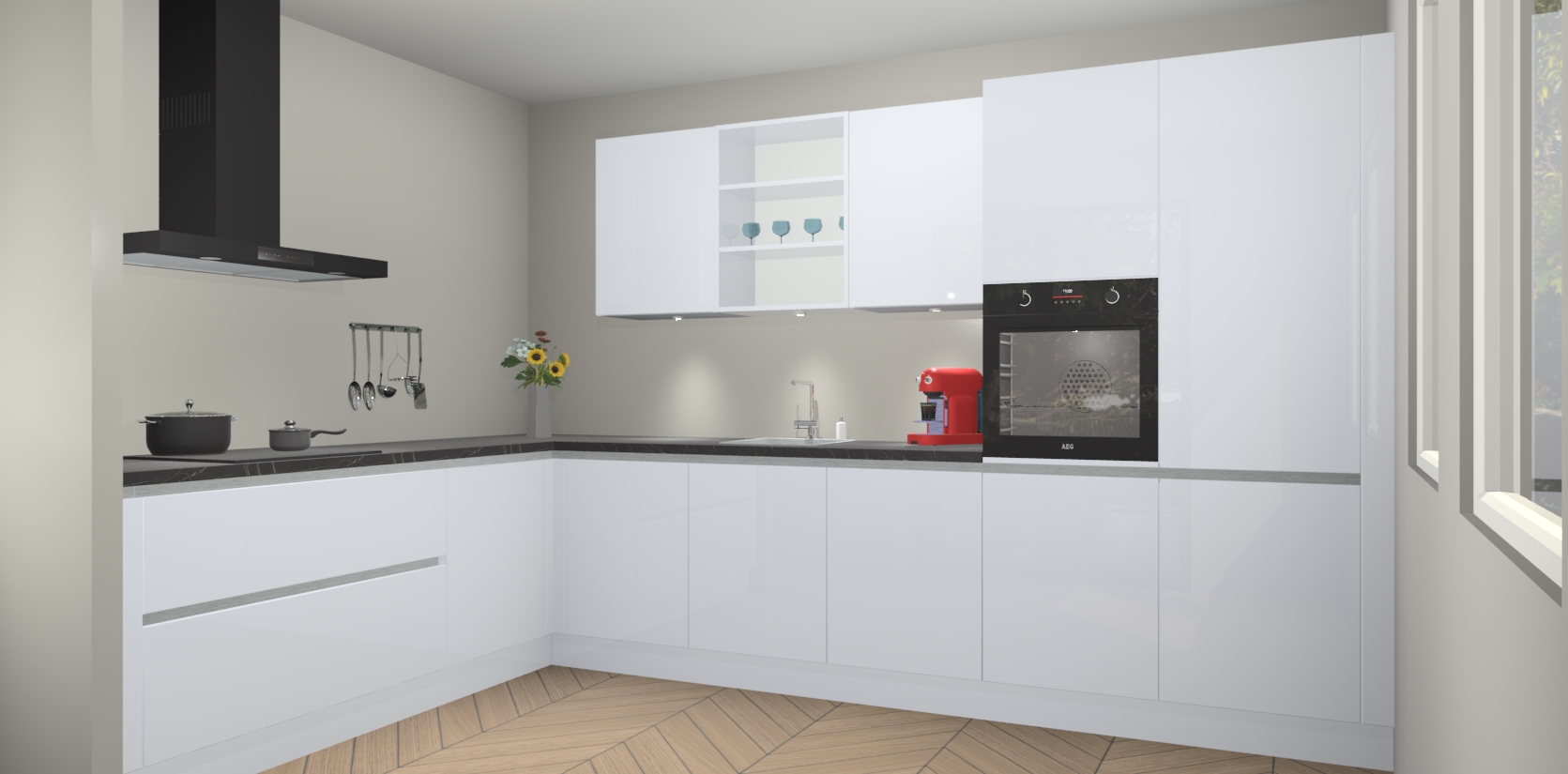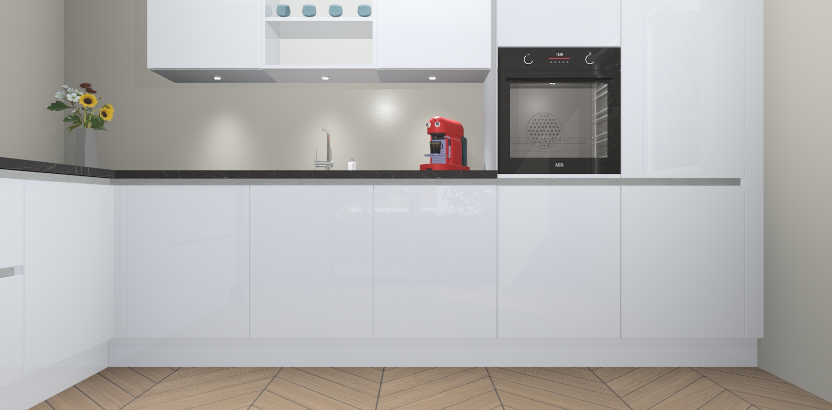 De Sneeuwwitte hoogglans greeploze keuken Gotenburg is zo ontworpen dat u alle mogelijke vormen van opslagruimte kunt genieten. Bovendien heeft u meteen toegang tot vijf ingebouwde apparaten: een oven, inductiekookplaat, afzuigkap, vaatwasser en koelkast. Gewoon upgraden naar AEG na bestelling? Dit kan heel gemakkelijk worden geregeld. De deuren sluiten zacht dankzij zachtsluitende scharnieren en ze houden warmte vast terwijl ze uitzonderlijk stil blijven wanneer ze worden geopend of gesloten.