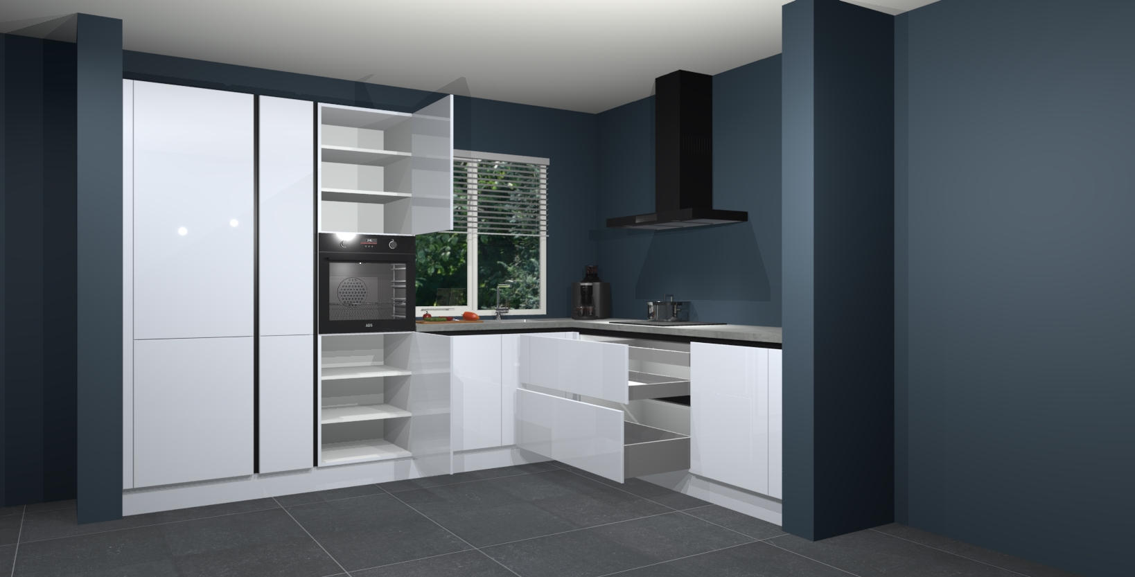 Met een modern, tijdloos design en ruime opslagruimte, zult u zich in no-time thuis voelen in uw nieuwe keuken. Uw leven wordt eenvoudiger met de soft-close deuren die voor het ultieme stille comfort zorgen - geen geluid dat u stoort terwijl u kookt. Ook is de keuken voorzien van 5 ingebouwde apparaten: een oven, inductie kookplaat, afzuigkap, vaatwasser en koelkast. Deze kunnen gemakkelijk na bestelling worden bijgewerkt naar AEG - waardoor uw luxe ervaring compleet is.