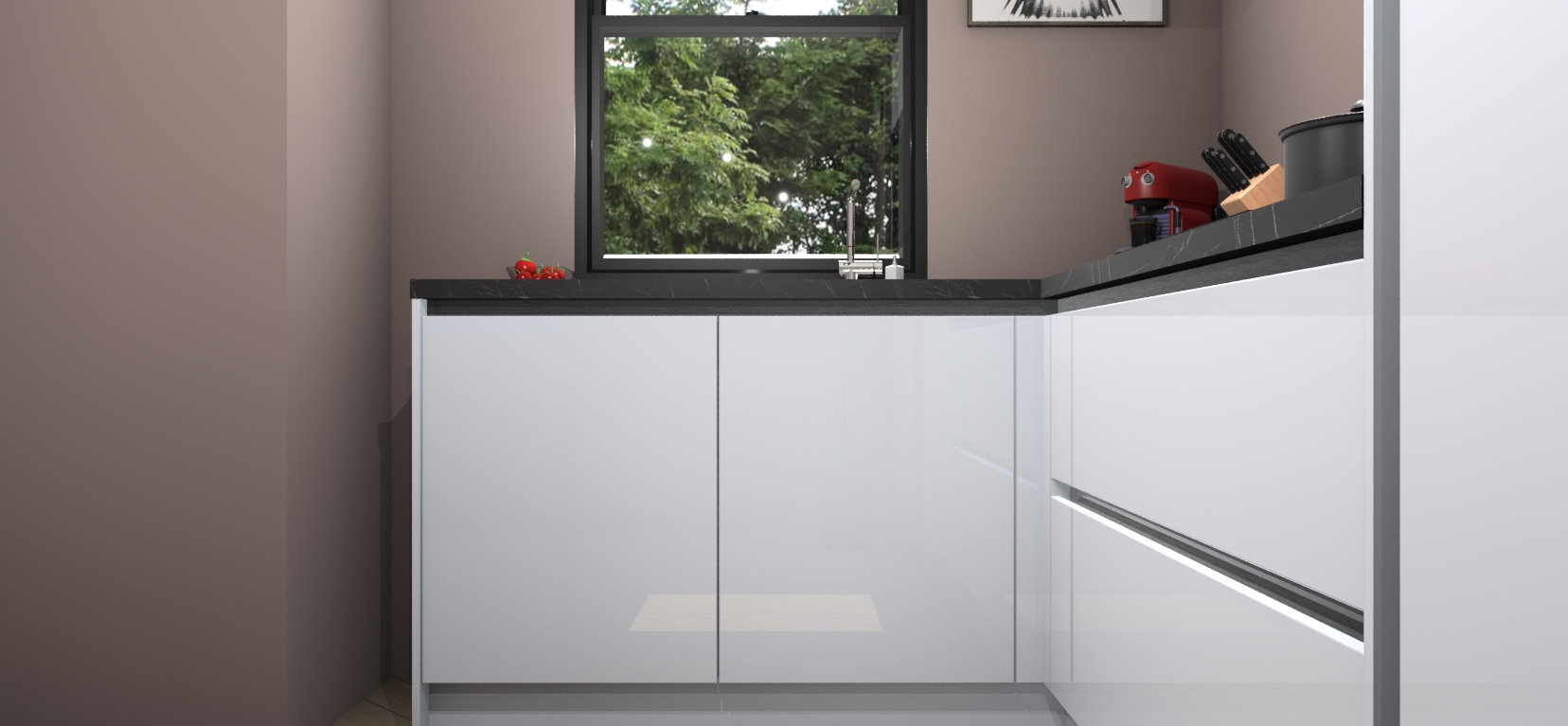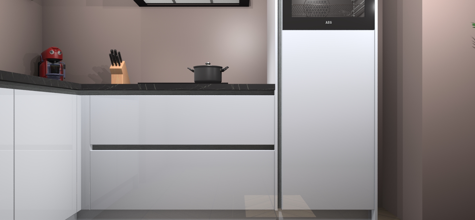 Moedige modernisten! De sneeuwwitte hoogglans greeploze keuken Kinshasa is het perfecte antwoord op al uw keukendromen. Dit geraffineerde, tijdloze ontwerp combineert strakke kasten met hoogglans details zodat u die dure look krijgt zonder het dure prijskaartje. We weten dat planning en uitvoering de sleutels zijn tot een geslaagde keukenrenovatie, dus hebben we ervoor gezorgd dat we vijf inbouwapparaten in ons pakket hebben: een oven, inductiekookplaat, afzuigkap, vaatwasser en koelkast. Deze kunnen na bestelling gemakkelijk worden uitgebreid voor nog meer gemak.
