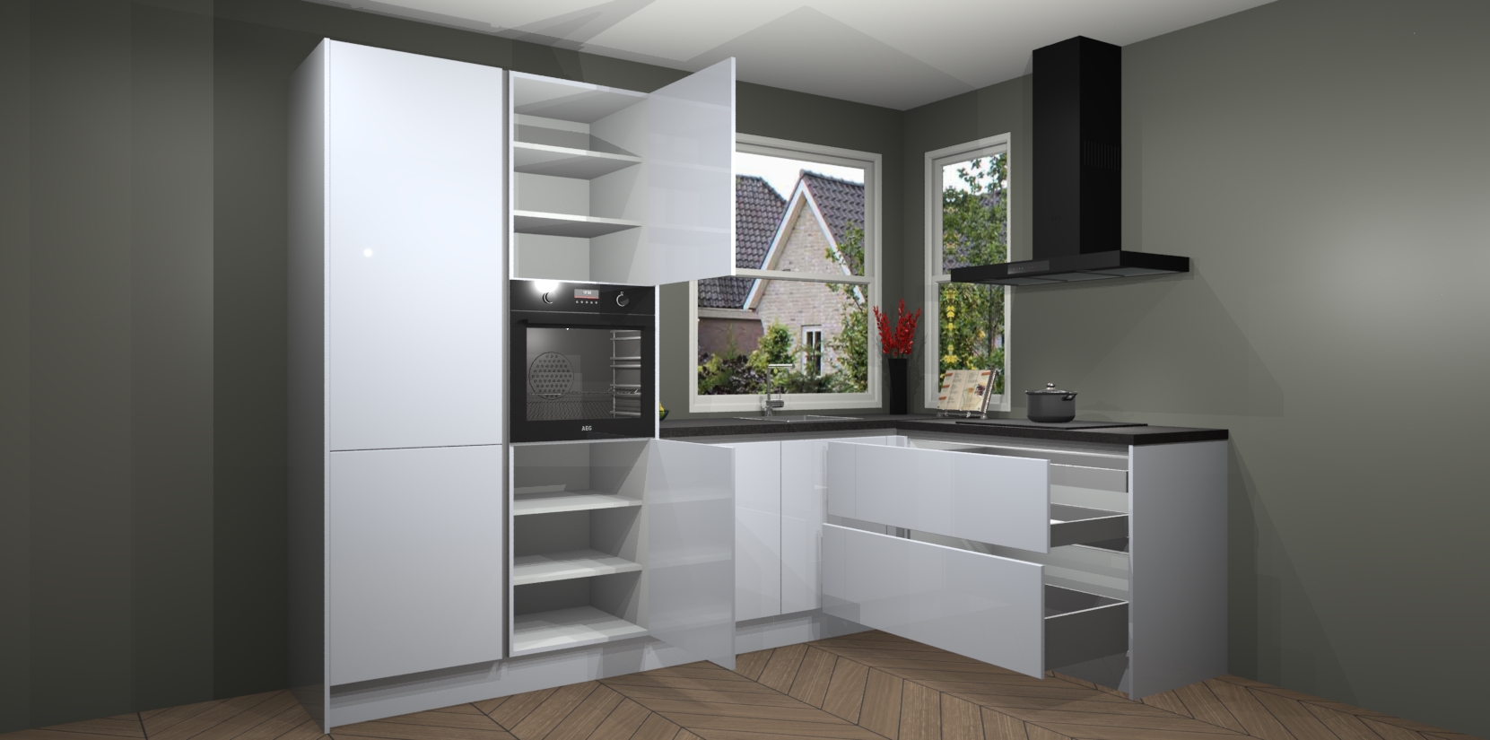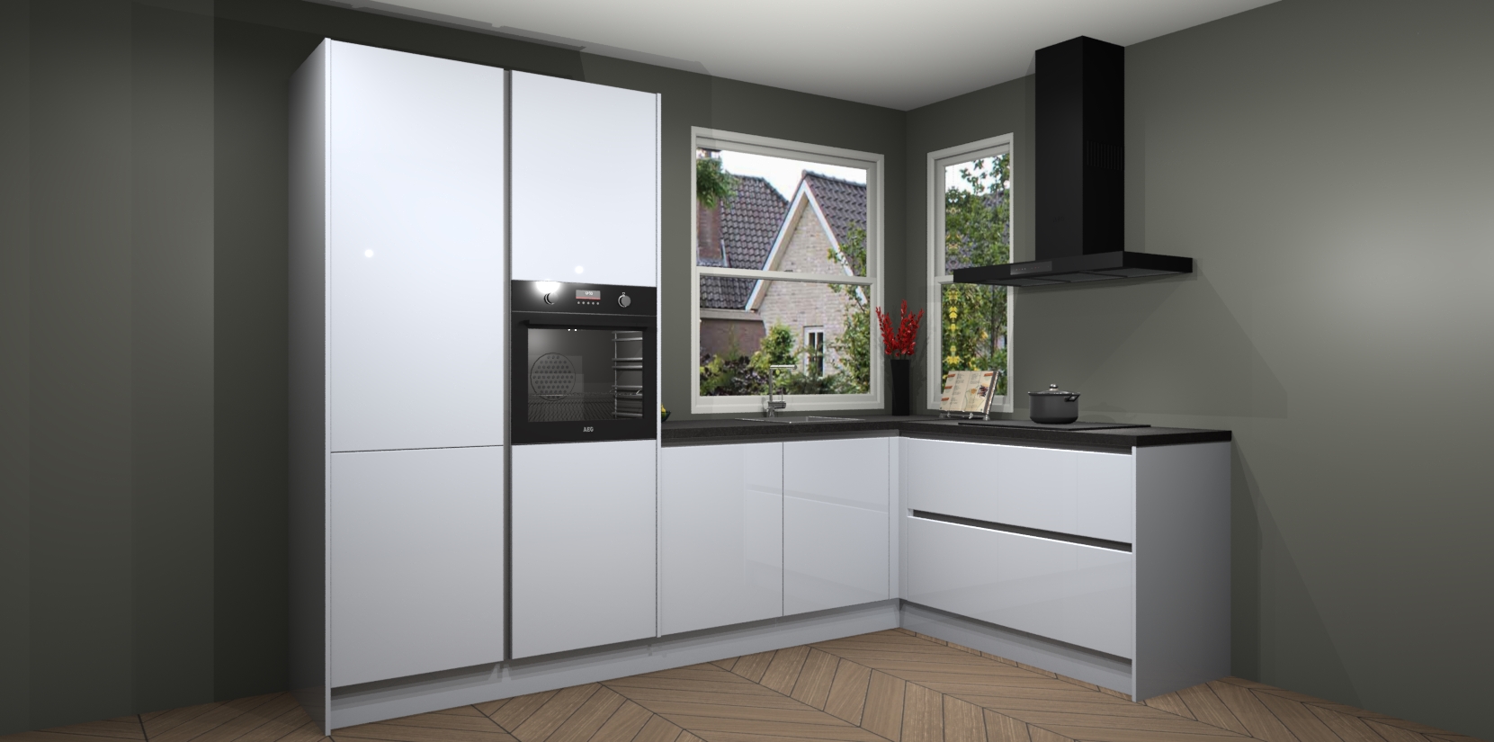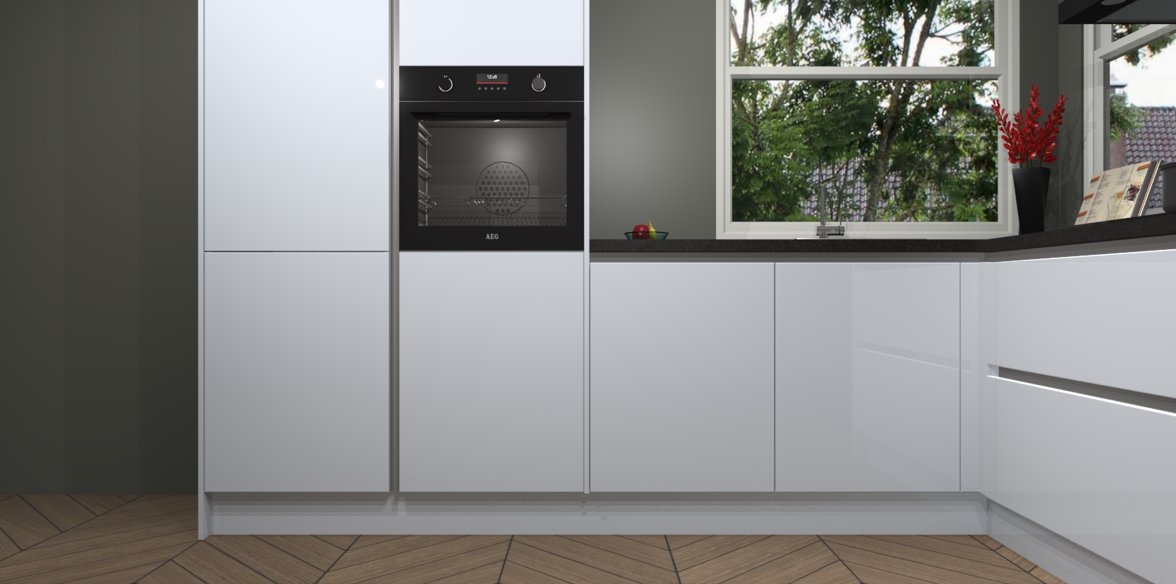 De Sneeuwwitte hoogglans greeploze keuken Kotor wordt geleverd met vijf inbouwapparaten, waaronder een oven, inductiekookplaat, afzuigkap, vaatwasser en koelkast. En als u uw apparatuur wilt upgraden, kunnen we u na bestelling eenvoudig helpen overstappen naar AEG. Bovendien heeft deze keuken soft close deuren, zodat lades en kastjes geruisloos en zonder klepperen sluiten!