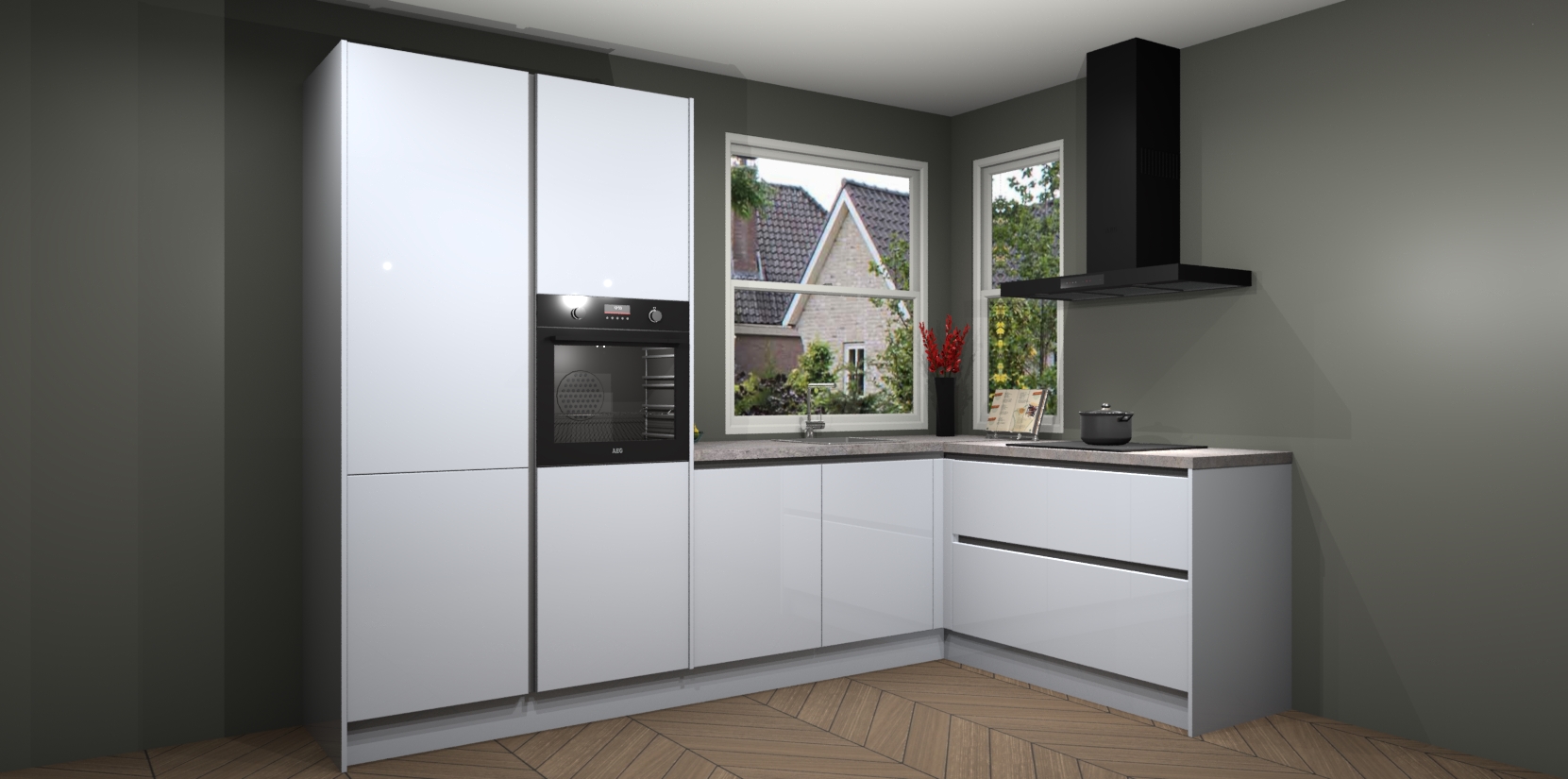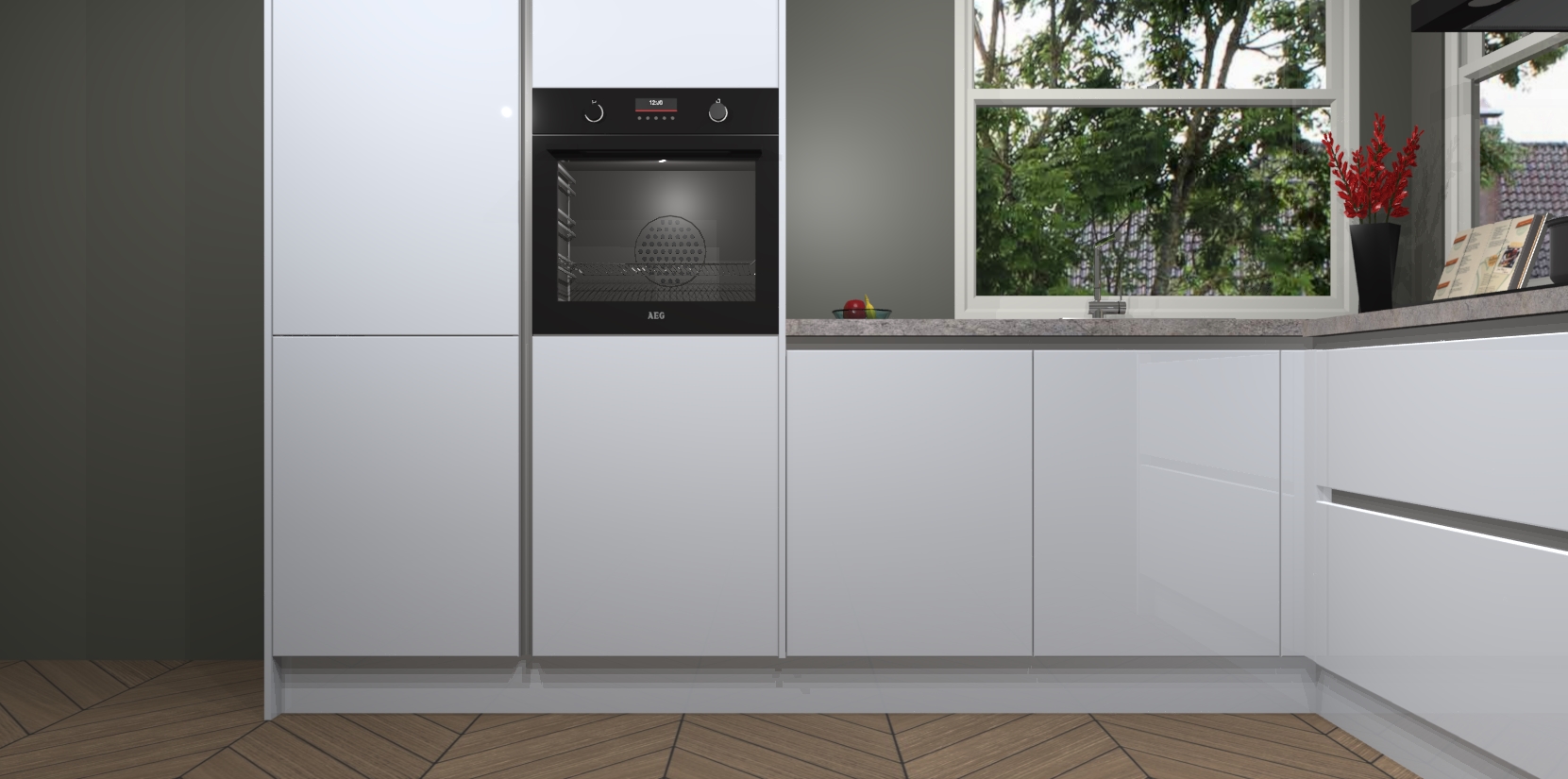 De Sneeuwwitte hoogglans greeploze keuken Kotor wordt geleverd met vijf inbouwapparaten, waaronder een oven, inductiekookplaat, afzuigkap, vaatwasser en koelkast. En als u uw apparatuur wilt upgraden, kunnen we u na bestelling eenvoudig helpen overstappen naar AEG. Bovendien heeft deze keuken soft close deuren, zodat lades en kastjes geruisloos en zonder klepperen sluiten!