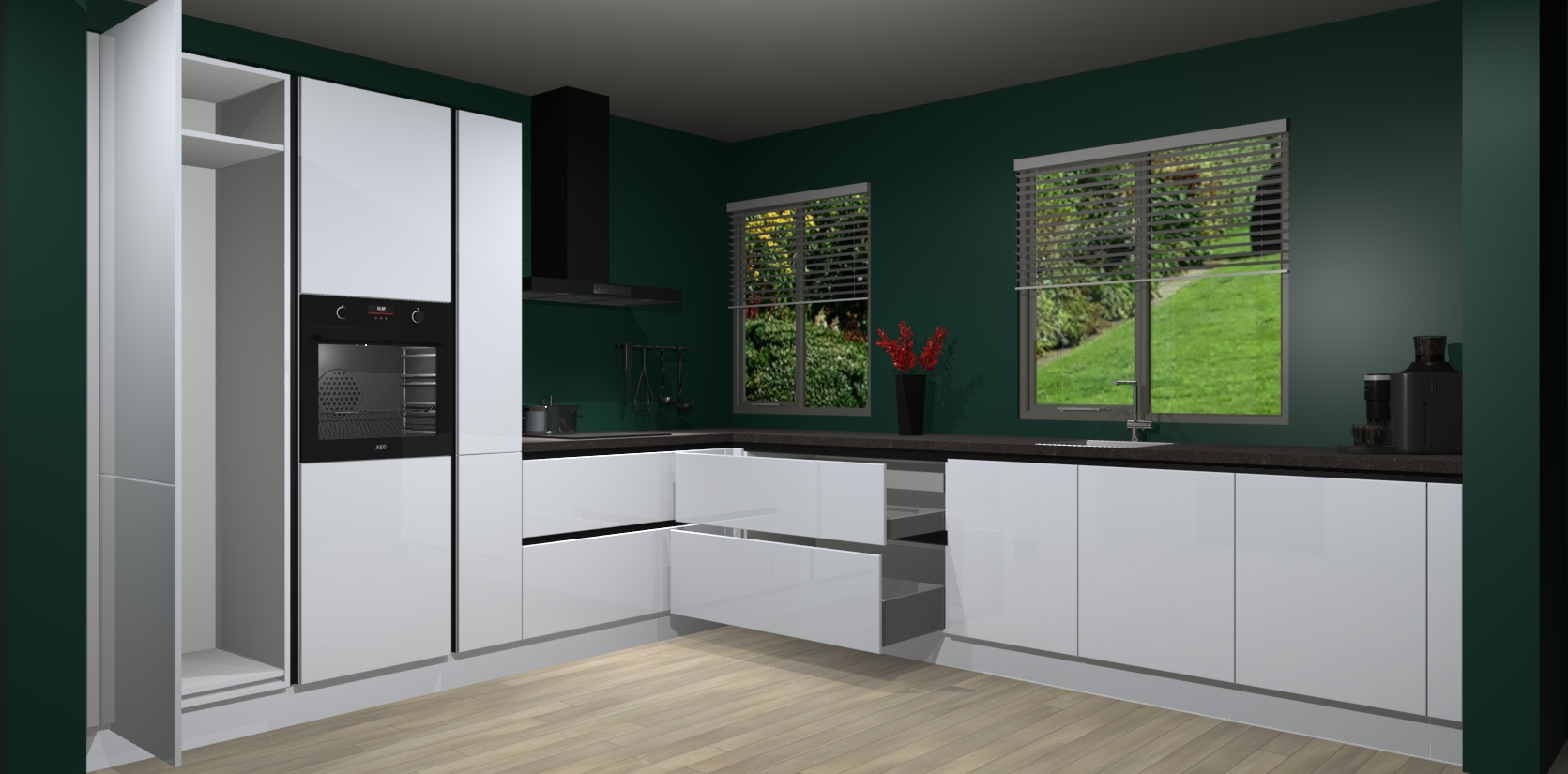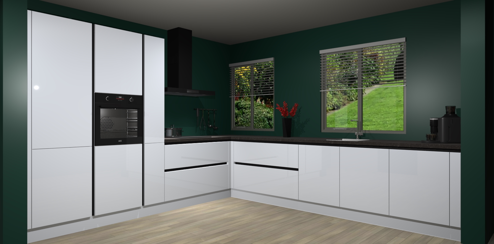 Welkom bij de Sneeuwwitte hoogglans keuken Palermo. Deze prachtige keuken zal de komende jaren het middelpunt van de belangstelling in uw huis zijn. Uitgerust met vijf inbouwapparaten komt u nooit kookgereedschap tekort. Bovendien geeft de warme houtlook elke ruimte een uitnodigende en tijdloze uitstraling.