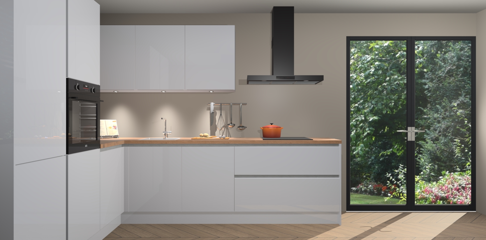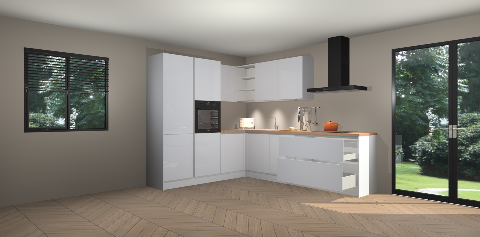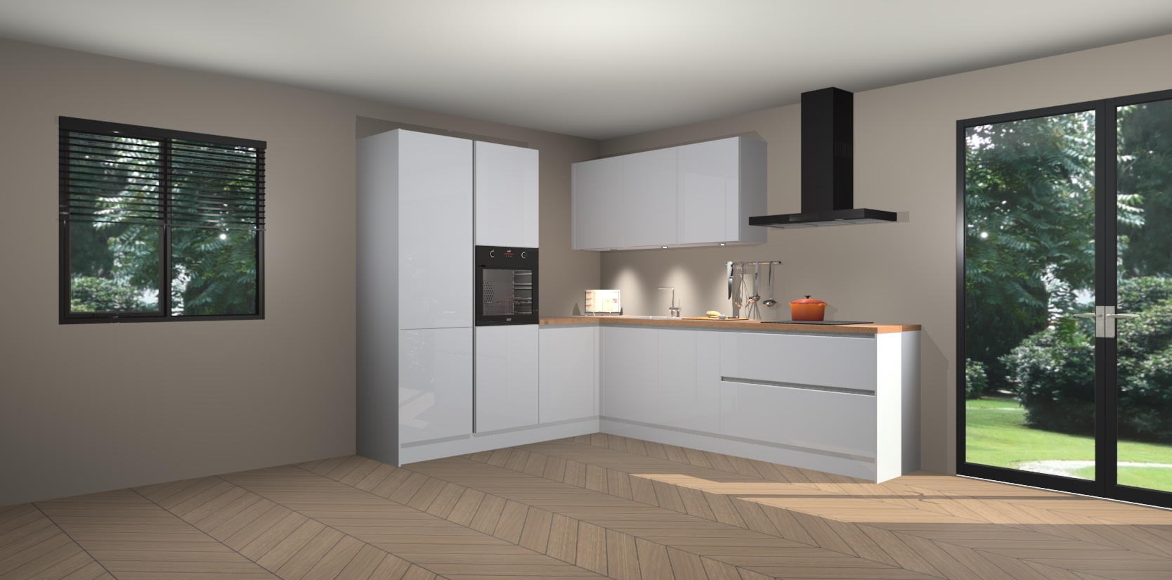Maak kennis met de sneeuwwitte hoogglans greeploze keuken Parla - de perfecte aanvulling voor uw moderne keuken! Ervaar tijdloos design, elegantie en een chique uitstraling met onze zwarte handgrepen, soft-close deuren en veel opbergruimte. Dit alles wordt aangeboden tegen een vaste lage prijs voor ongeëvenaarde Duitse keukenkwaliteit!