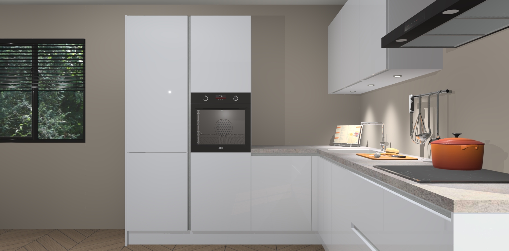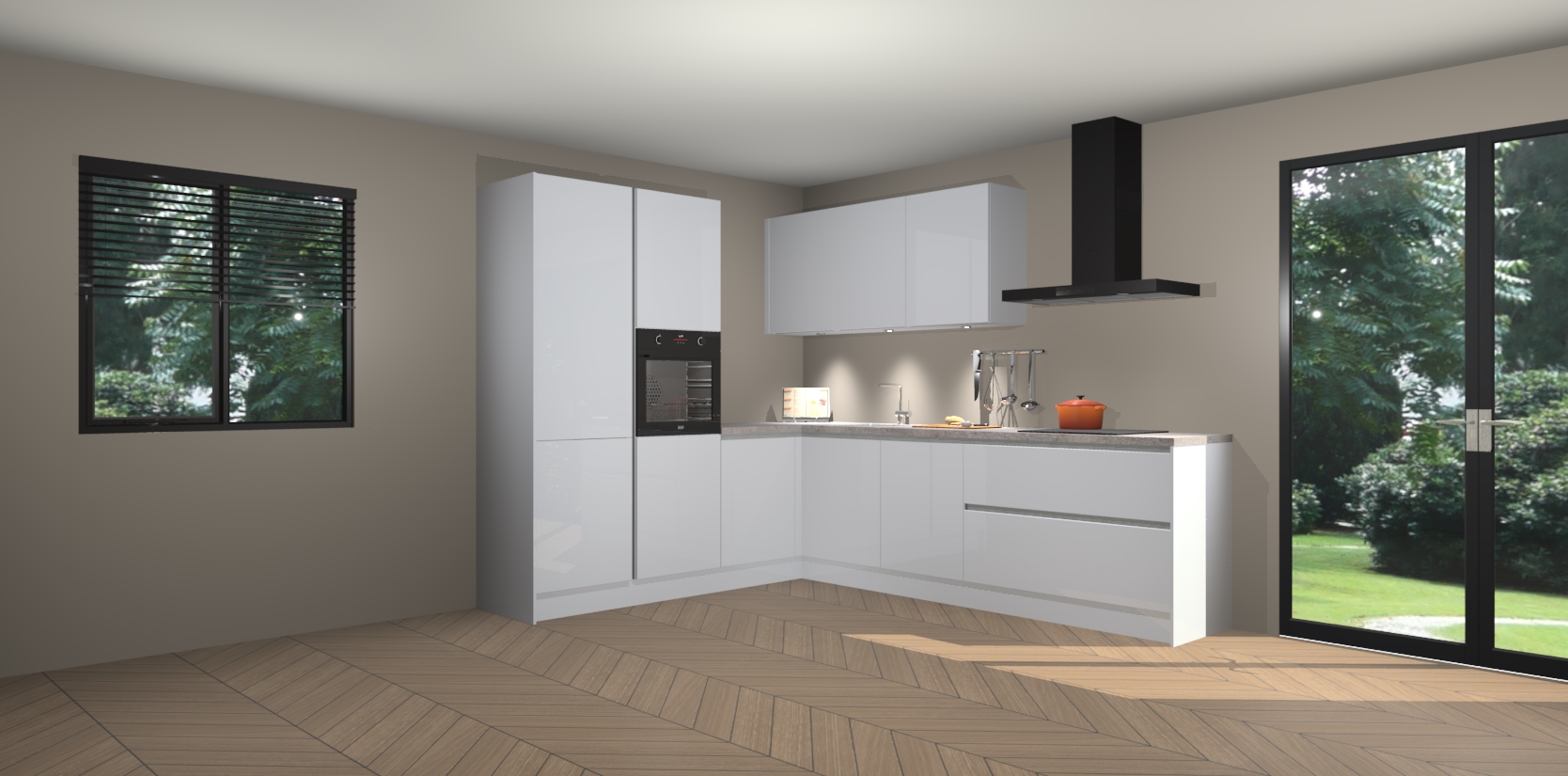 Maak kennis met de sneeuwwitte hoogglans greeploze keuken Parla - de perfecte aanvulling voor uw moderne keuken! Ervaar tijdloos design, elegantie en een chique uitstraling met onze zwarte handgrepen, soft-close deuren en veel opbergruimte. Dit alles wordt aangeboden tegen een vaste lage prijs voor ongeëvenaarde Duitse keukenkwaliteit!