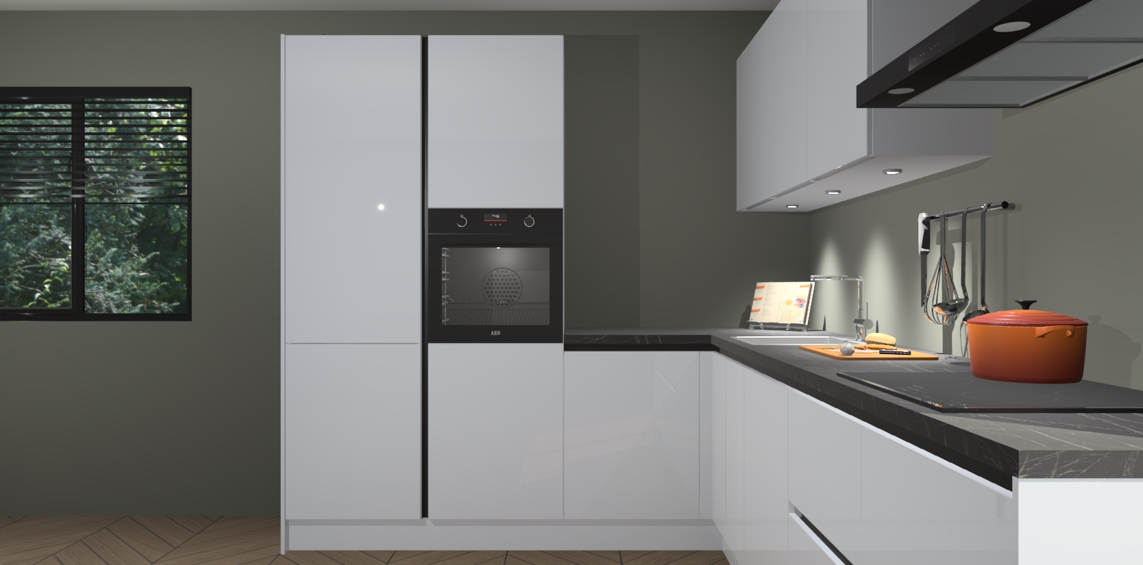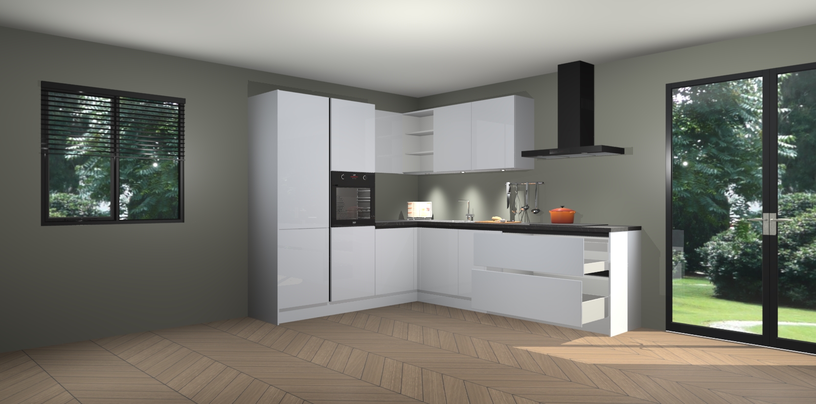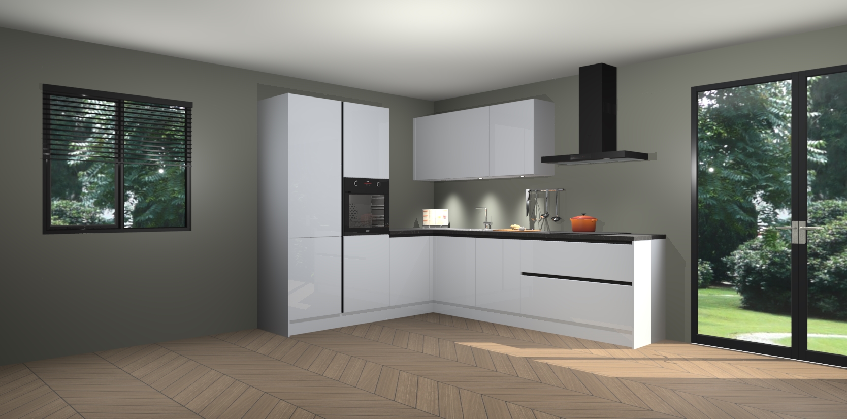 Maak kennis met de sneeuwwitte hoogglans greeploze keuken Parla - de perfecte aanvulling voor uw moderne keuken! Ervaar tijdloos design, elegantie en een chique uitstraling met onze zwarte handgrepen, soft-close deuren en veel opbergruimte. Dit alles wordt aangeboden tegen een vaste lage prijs voor ongeëvenaarde Duitse keukenkwaliteit!