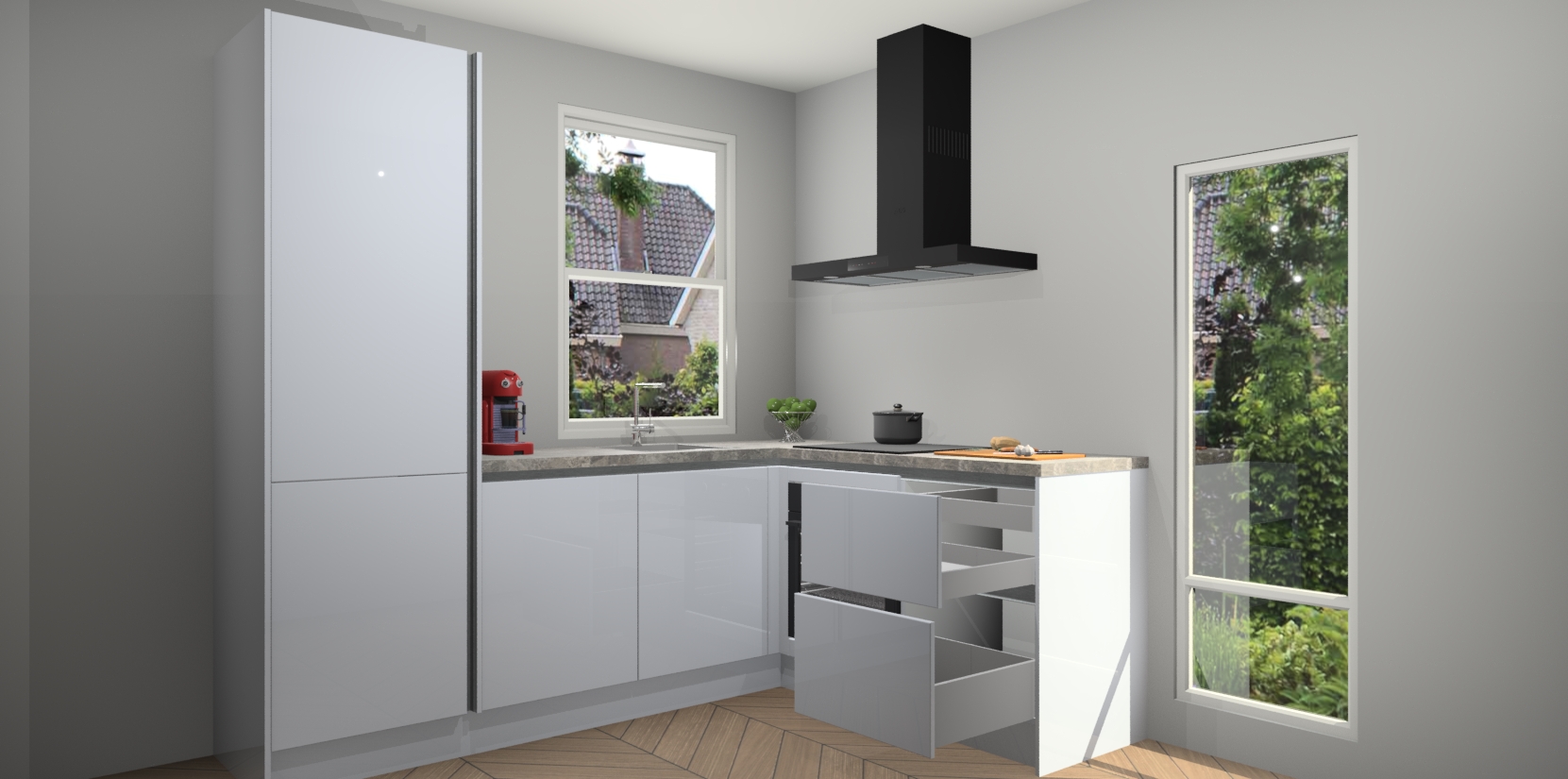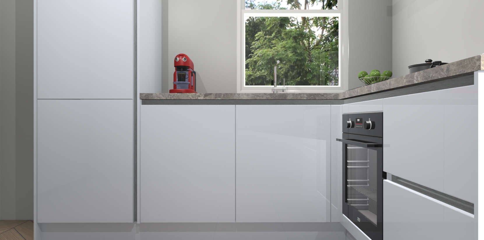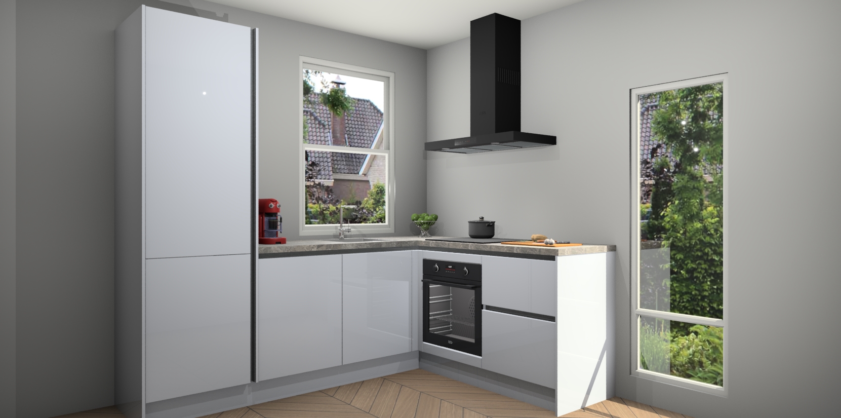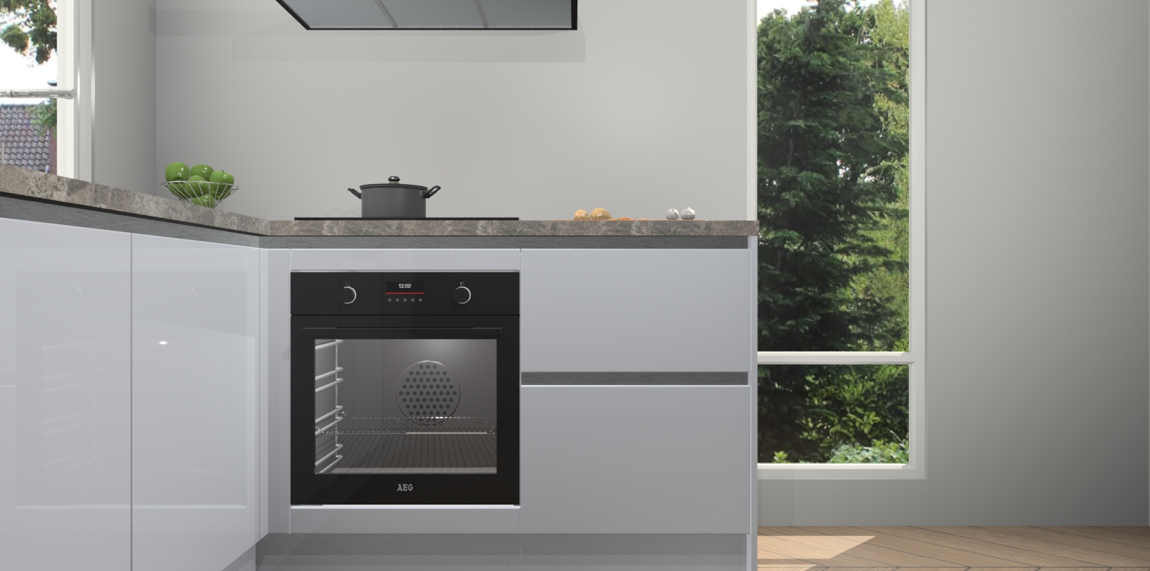 De Sneeuwwitte hoogglans greeploze keuken Phuket heeft alles wat u maar kunt wensen. Niet alleen zijn er softclose deuren, maar ook 5 ingebouwde apparaten: een oven, inductiekookplaat, afzuigkap, vaatwasser en koelkast - waarbij u later gemakkelijk naar het AEG merk, van inductiekookplaat naar kookplaat met geïntegreerde afzuiging of van oven naar combimagnetron kunt upgraden. Dat alles tegen een vast laag tarief! Bovendien geeft de Sneeuwwitte hoogglans greeploze keuken Phuket supersnelle levering van 7 weken. Echt iets voor u als u er niet op wilt wachten om het resultaat te zien in eigen keuken!