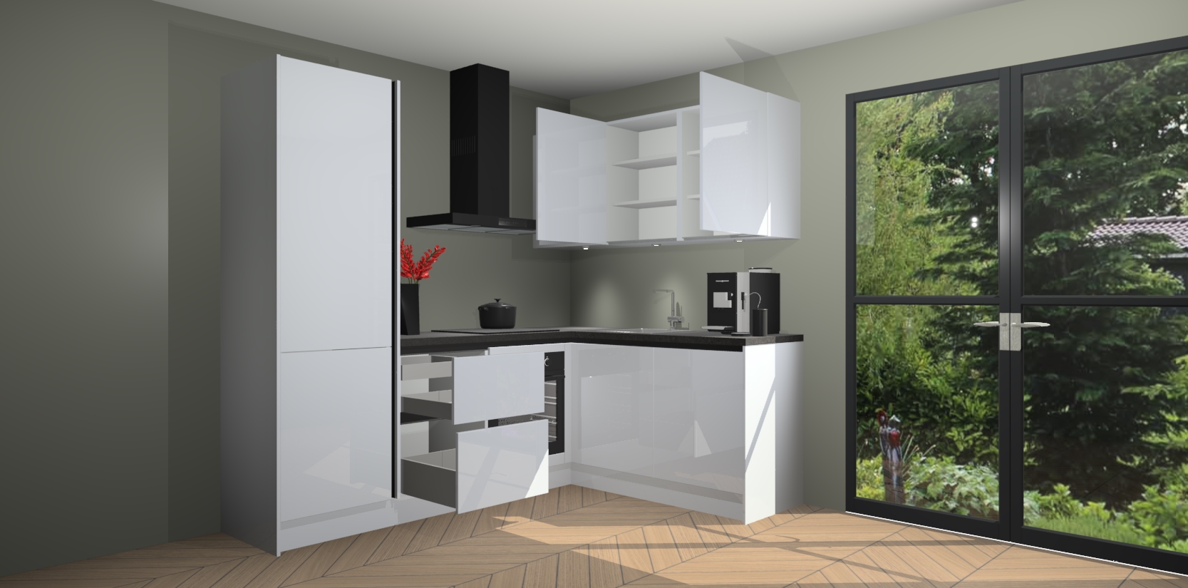 Wauw, dit is de Sneeuwwitte Hoogglans greeploze keuken Pilsen! U kunt gerust zeggen dat u elegantie combineert met functionaliteit met deze keuken. Met een modern en chique ontwerp is de keuken precies wat u nodig heeft om uw ruimte te verfraaien. De binnenzijde van de kasten is in dezelfde donkere kleur als de buitenzijde voor een uniforme look, compleet met softclose-kasten die stil sluiten.