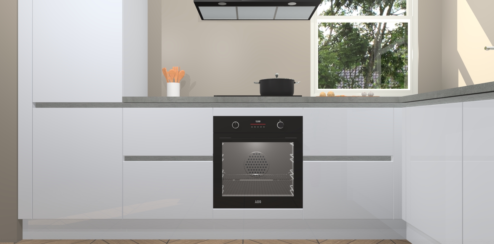 Wat maakt deze keuken zo bijzonder? Ten eerste geeft het houten werkblad uw ruimte een onmiskenbaar klassieke uitstraling. De natuurlijke afwerking roept warmte en elegantie op die nooit uit de mode zullen raken. Bovendien is het gemakkelijk schoon te houden en te onderhouden, zodat je er jarenlang plezier van kunt hebben. Als u op zoek bent naar extra gemak in uw keuken, dan heeft u bij het plaatsen van een bestelling bij ons ook de optie om uw toestellen te upgraden naar AEG-modellen - zo haalt u moderne innovatie van topmerken in apparatentechnologie rechtstreeks in huis.