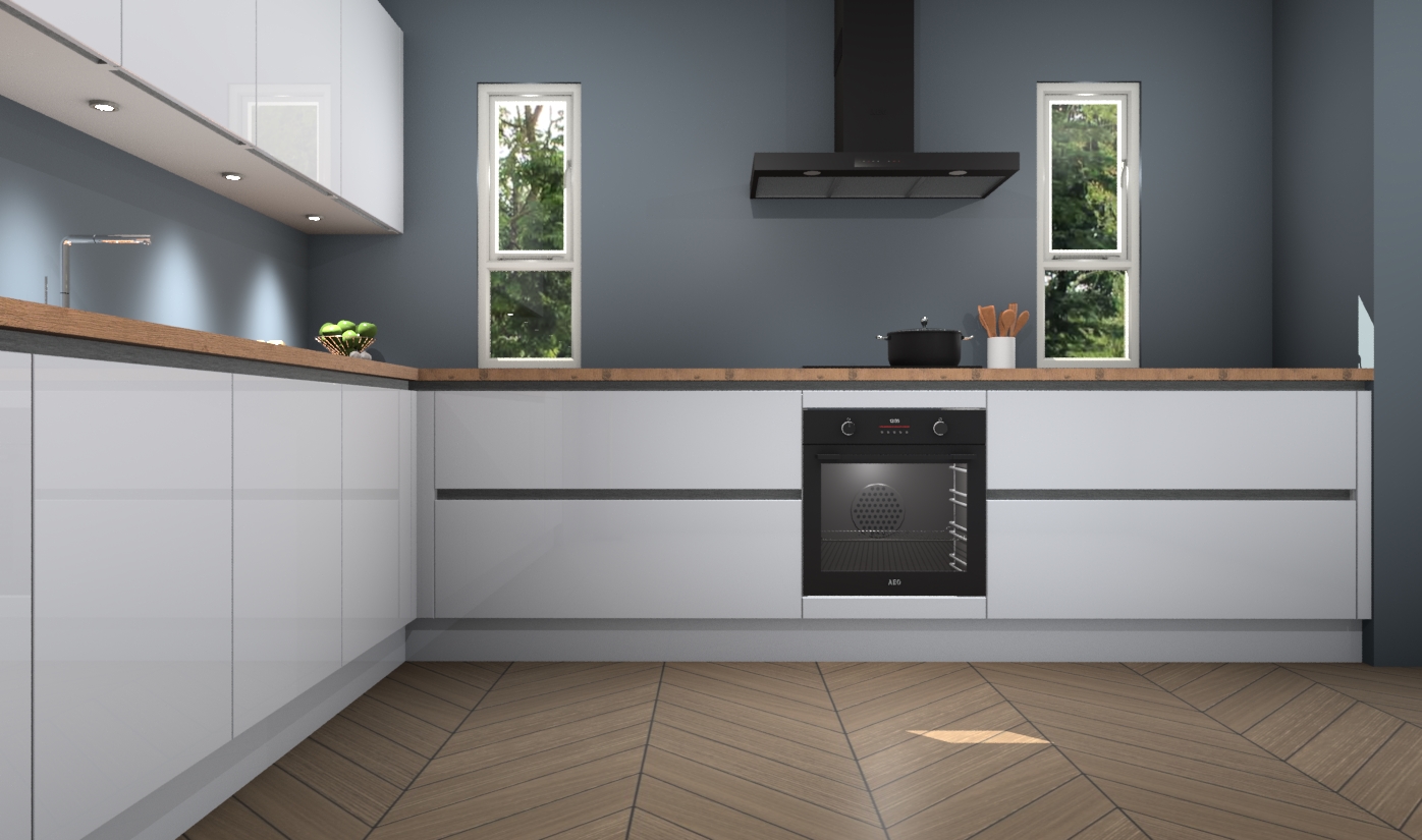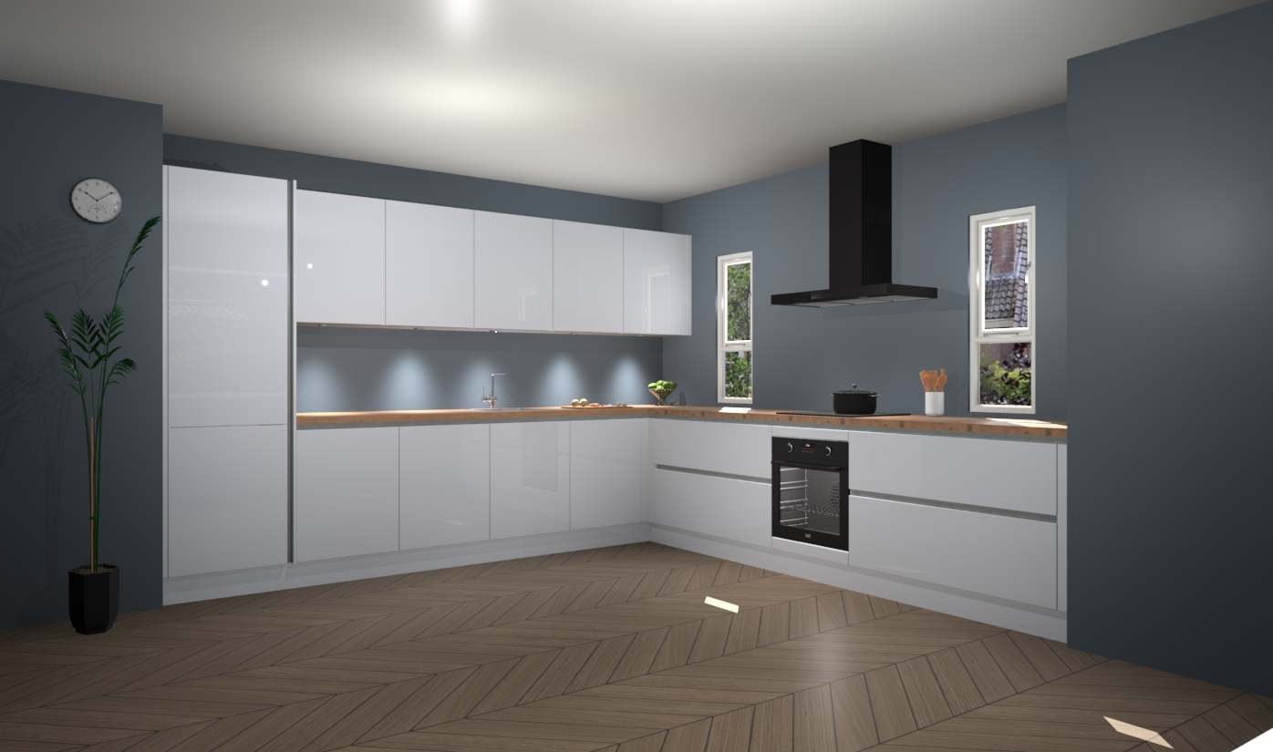 De sneeuwwitte hoogglans greeploze keuken is een ideale hoekkeuken en heeft alle functies en apparatuur die u maar nodig kunt hebben. Bij de bestelling krijgt u een oven, inductiekookplaat, afzuigkap, vaatwasser en koelkast - deze kunnen desgewenst eenvoudig worden uitgebreid naar AEG na bestellen. Elke kast wordt ook voor gemonteerd geleverd met soft close deuren die jarenlang gebruik beloven. Stelt u zich voor dat u geen gedoe heeft met vervelende montage - vanaf het moment dat u uw bestelling plaats, duurt het slechts 7 weken voor het bij u thuis geleverd wordt.