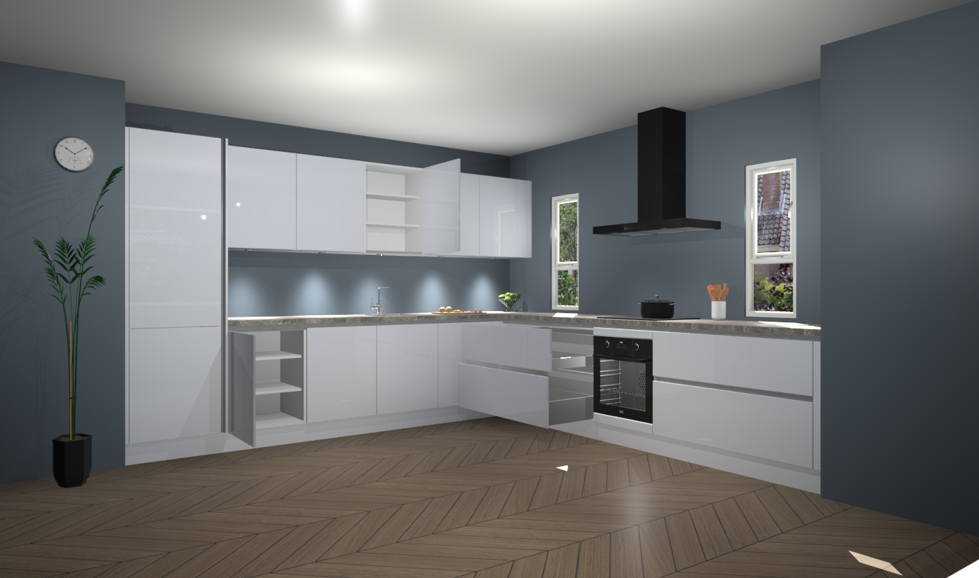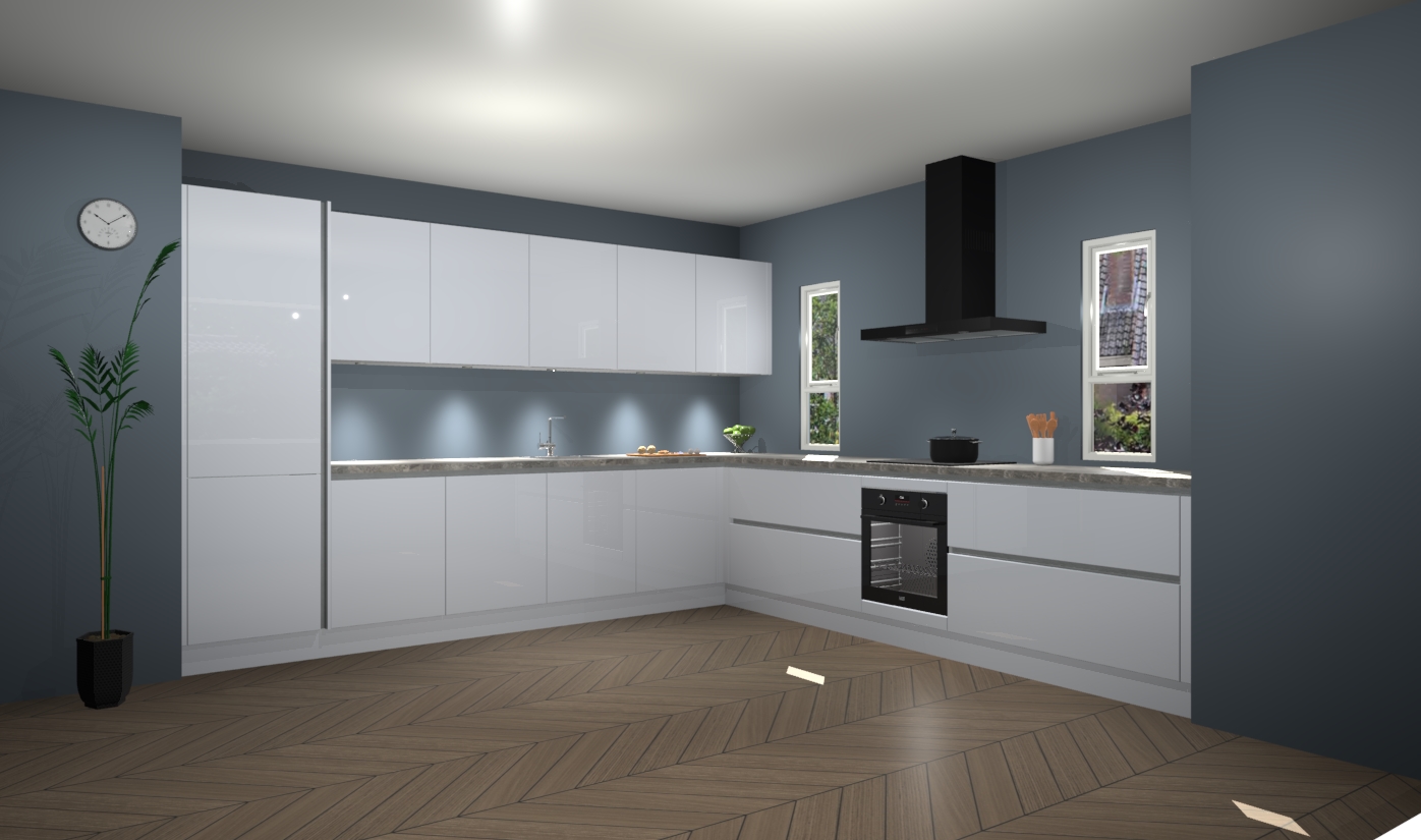 De sneeuwwitte hoogglans greeploze keuken is een ideale hoekkeuken en heeft alle functies en apparatuur die u maar nodig kunt hebben. Bij de bestelling krijgt u een oven, inductiekookplaat, afzuigkap, vaatwasser en koelkast - deze kunnen desgewenst eenvoudig worden uitgebreid naar AEG na bestellen. Elke kast wordt ook voor gemonteerd geleverd met soft close deuren die jarenlang gebruik beloven. Stelt u zich voor dat u geen gedoe heeft met vervelende montage - vanaf het moment dat u uw bestelling plaats, duurt het slechts 7 weken voor het bij u thuis geleverd wordt.