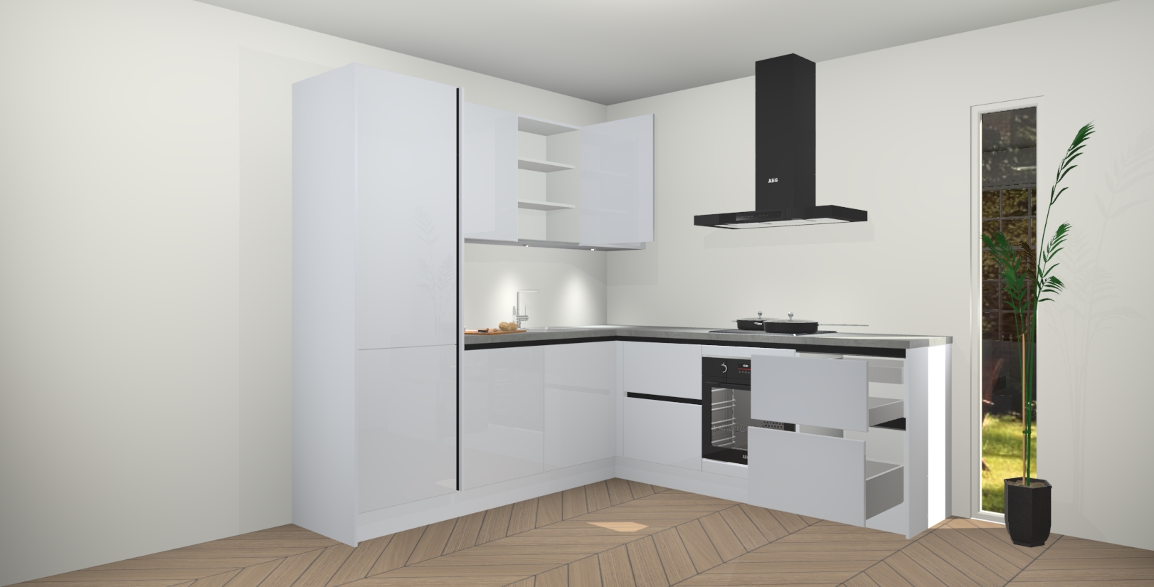 Met zijn moderne design en aantrekkelijke hoekopstelling biedt deze keuken een unieke look die zelfs de meest veeleisende huiseigenaar zal bevallen. En omdat de binnenkant van de kasten dezelfde kleur heeft als de buitenkant, heeft uw keuken een consistente afwerking. Bovenop de geweldige look is opbergruimte ook geen probleem, met voldoende kast- en laderuimte achter zelfs de mooiste buitenkant.