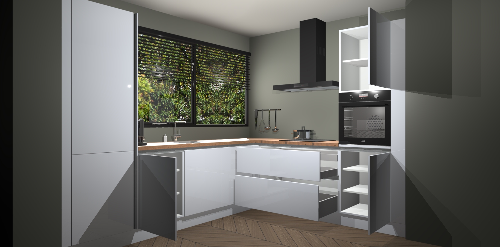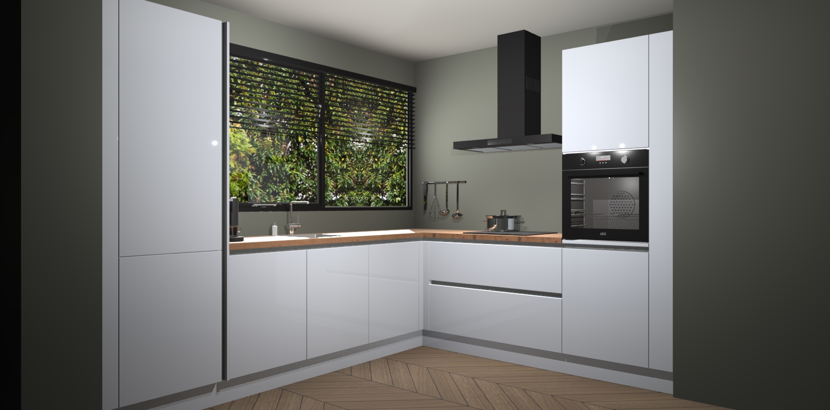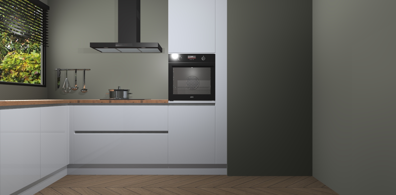 Met een modern, tijdloos design en ruime opslagruimte, zult u zich in no-time thuis voelen in uw nieuwe keuken. Uw leven wordt eenvoudiger met de soft-close deuren die voor het ultieme stille comfort zorgen - geen geluid dat u stoort terwijl u kookt. Ook is de keuken voorzien van 5 ingebouwde apparaten: een oven, inductie kookplaat, afzuigkap, vaatwasser en koelkast. Deze kunnen gemakkelijk na bestelling worden bijgewerkt naar AEG - waardoor uw luxe ervaring compleet is.