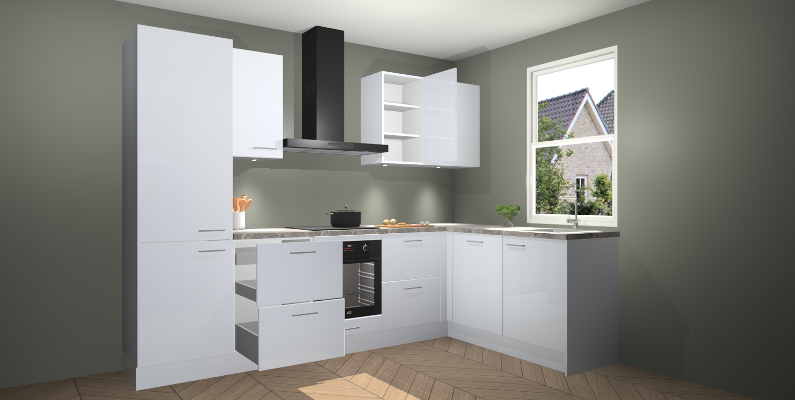 Maak kennis met de trendsettende en luxe Sneeuwwitte hoogglans keuken Bazel! Deze uitzonderlijke keuken van Duitse kwaliteit is stijlvol, modern en perfect om elk huis mee op te fleuren. De binnenkant van de kasten worden meegenomen in een bijpassende kleur om een samenhangende eigentijdse esthetiek te voltooien. U zult dol zijn op hoe uw pas gerenoveerde keuken eruitziet met de Sneeuwwitte hoogglans editie!