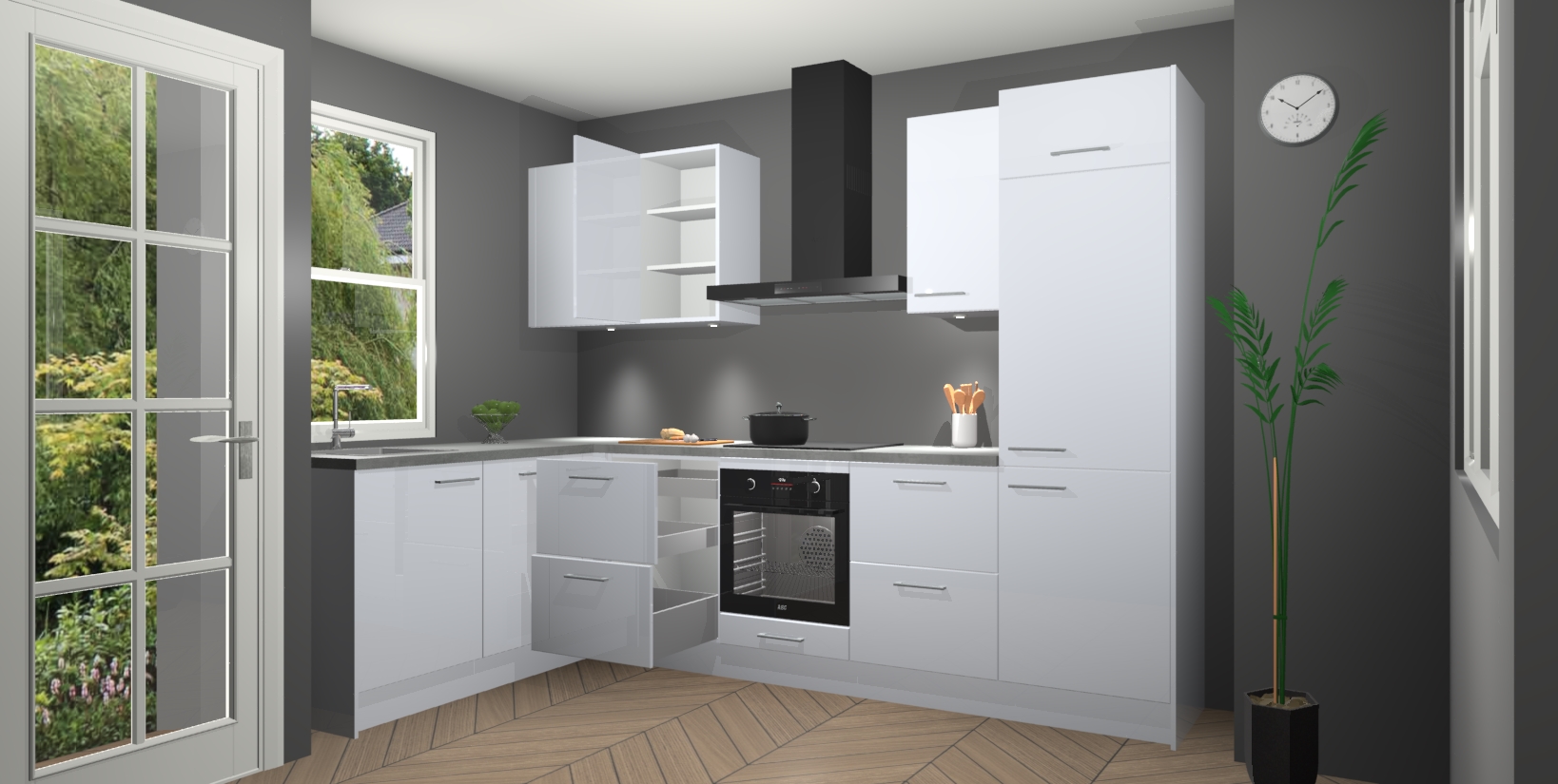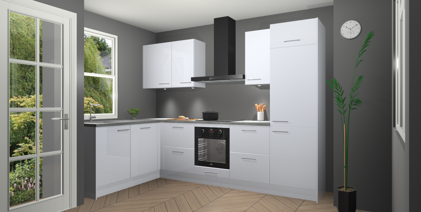 U hoeft zich ook geen zorgen te maken over een gebrek aan opbergruimte, want deze keuken heeft voldoende opbergmogelijkheden zowel boven als onder het aanrecht. Om het leven nog makkelijker te maken, wordt deze moderne hoekkeuken geleverd met 5 ingebouwde apparaten, waaronder een oven, inductiekookplaat, afzuigkap, vaatwasser en koelkast, zodat u in een mum van tijd klaar bent voor actie!