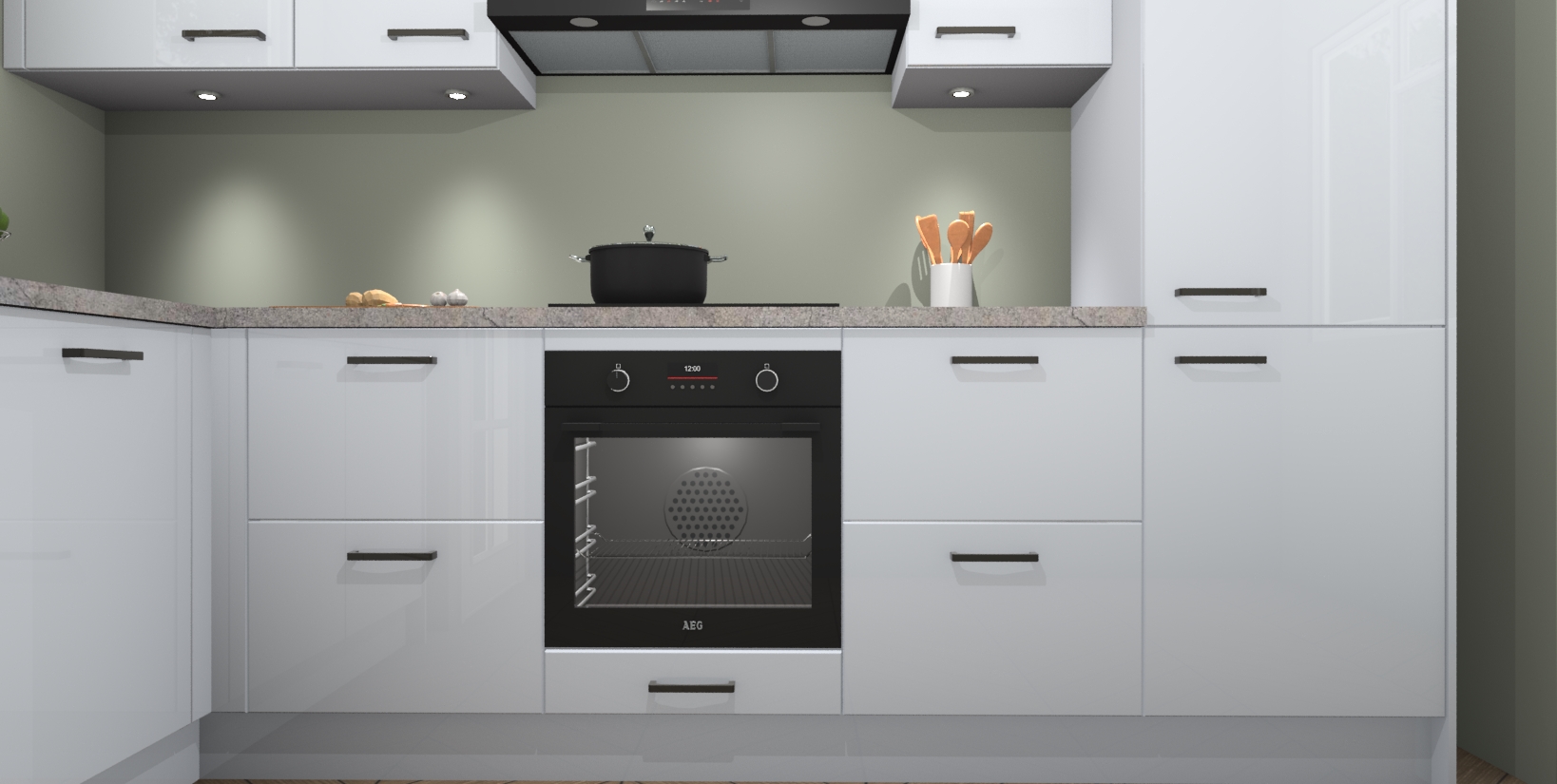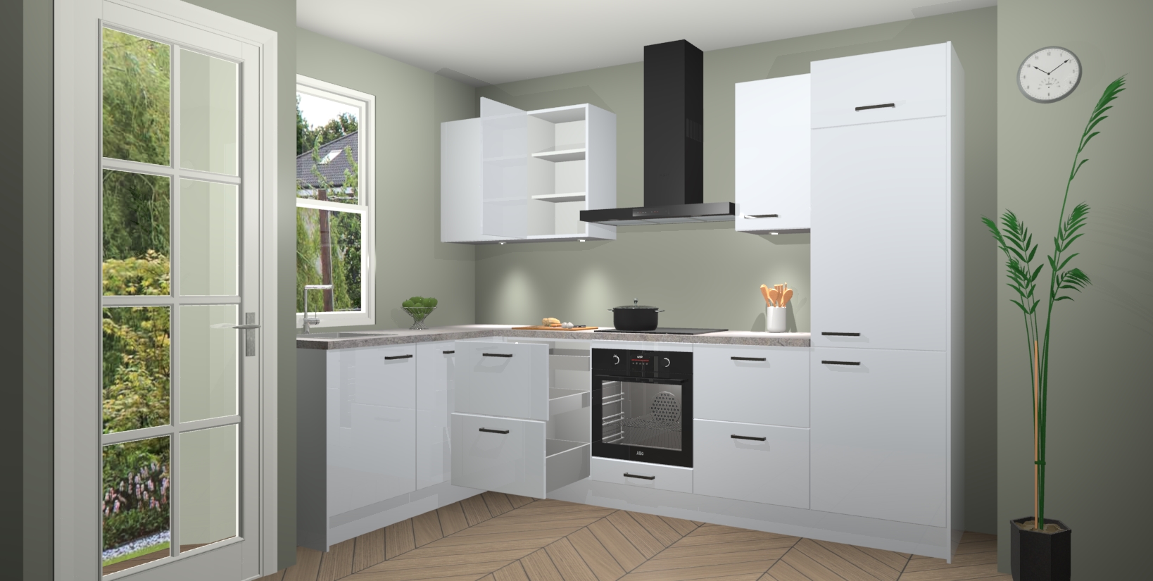 U hoeft zich ook geen zorgen te maken over een gebrek aan opbergruimte, want deze keuken heeft voldoende opbergmogelijkheden zowel boven als onder het aanrecht. Om het leven nog makkelijker te maken, wordt deze moderne hoekkeuken geleverd met 5 ingebouwde apparaten, waaronder een oven, inductiekookplaat, afzuigkap, vaatwasser en koelkast, zodat u in een mum van tijd klaar bent voor actie!