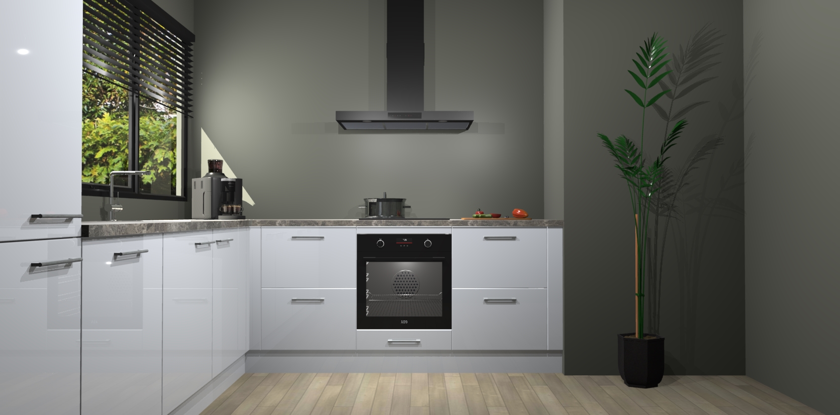 Met een modern, tijdloos design en ruime opslagruimte, zult u zich in no-time thuis voelen in uw nieuwe keuken. Uw leven wordt eenvoudiger met de soft-close deuren die voor het ultieme stille comfort zorgen - geen geluid dat u stoort terwijl u kookt. Ook is de keuken voorzien van 5 ingebouwde apparaten: een oven, inductie kookplaat, afzuigkap, vaatwasser en koelkast. Deze kunnen gemakkelijk na bestelling worden bijgewerkt naar AEG - waardoor uw luxe ervaring compleet is.