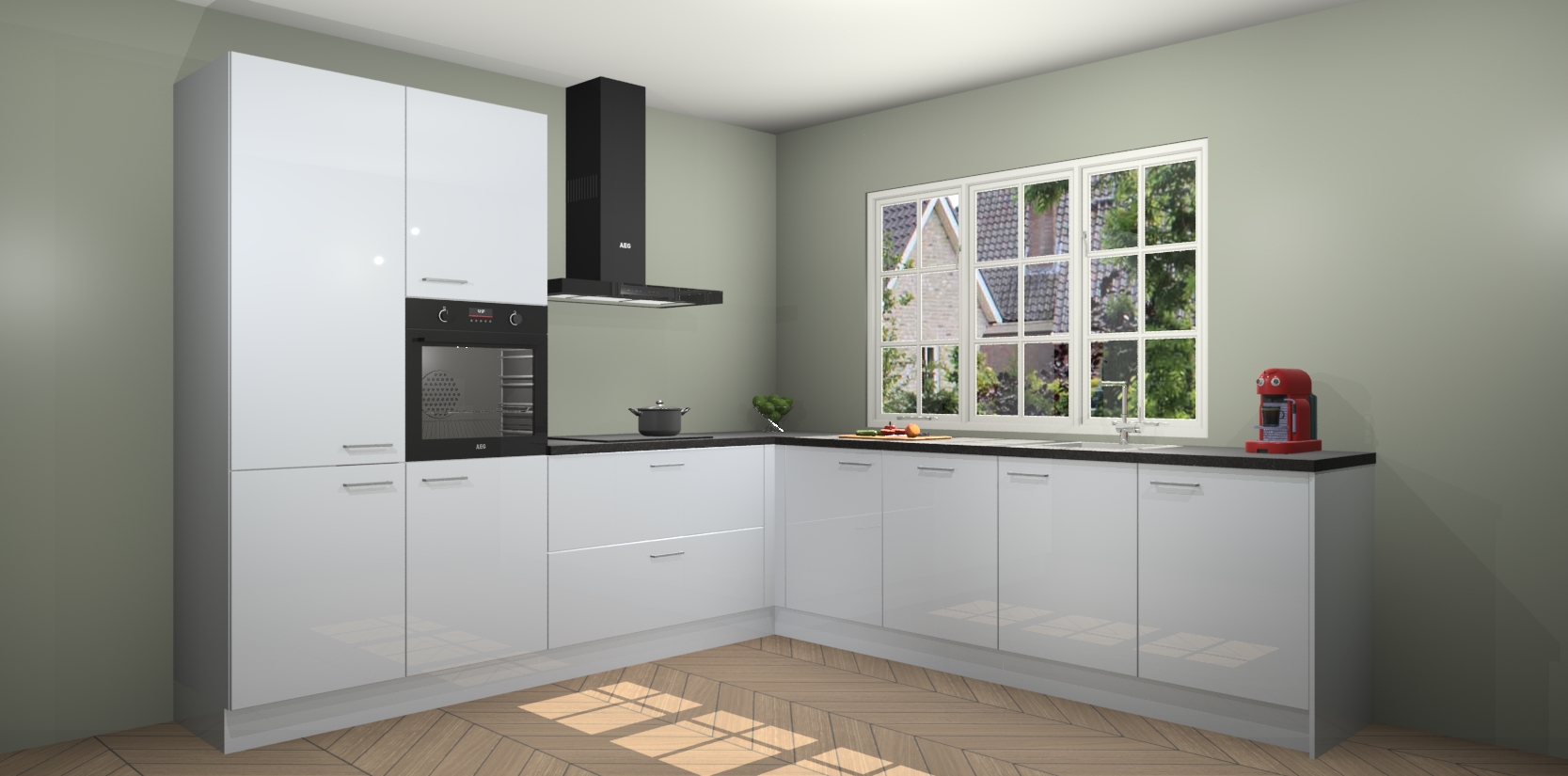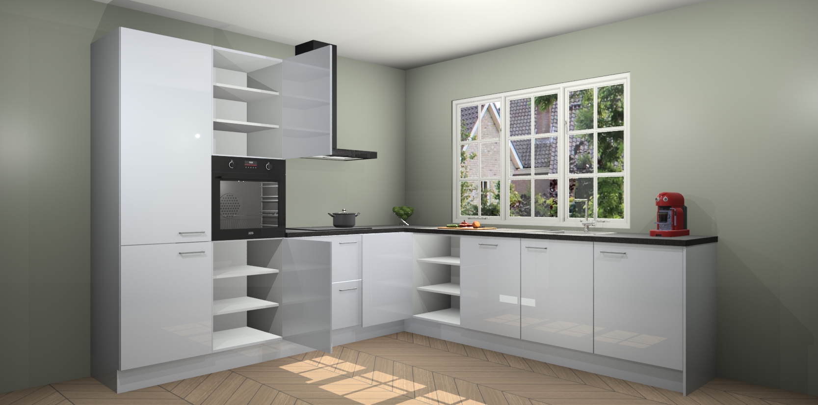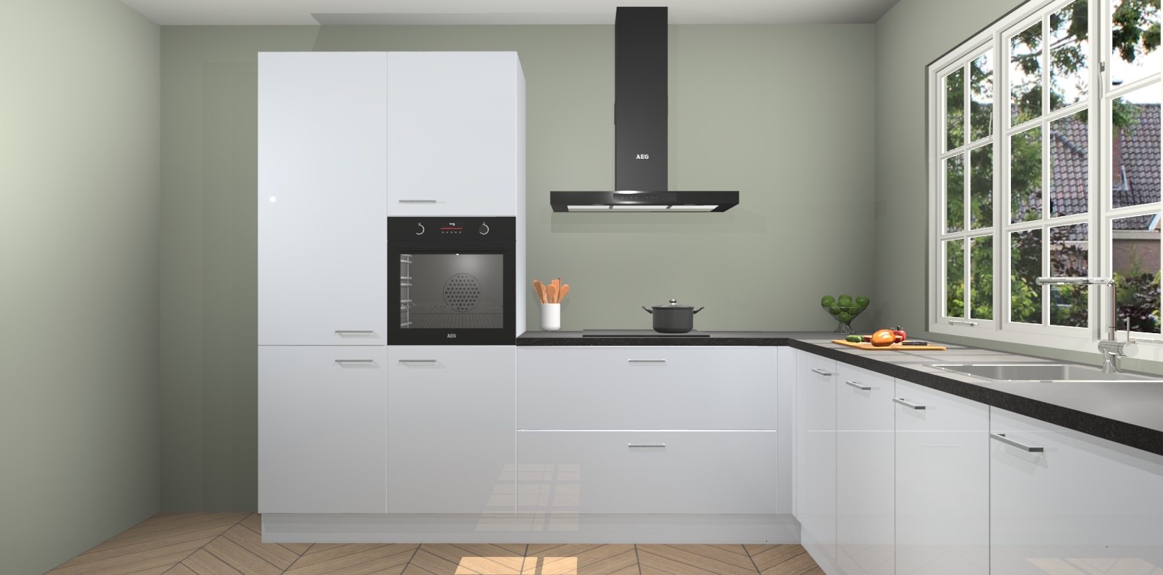De keuken heeft veel opbergruimte, waardoor u alle ingrediënten gemakkelijk bereikbaar hebt staan. En daarnaast bevat deze volledig uitgeruste keuken ook 5 ingebouwde apparaten: een oven, inductiekookplaat, afzuigkap, vaatwasser en koelkast. Deze zijn heel eenvoudig na bestellen te upgraden naar AEG als u dit wilt. Bovendien zijn de softclose-kastdeuren ideaal; geef ze gewoon even een tikje en ze sluiten automatisch met geruisloze precisie.
