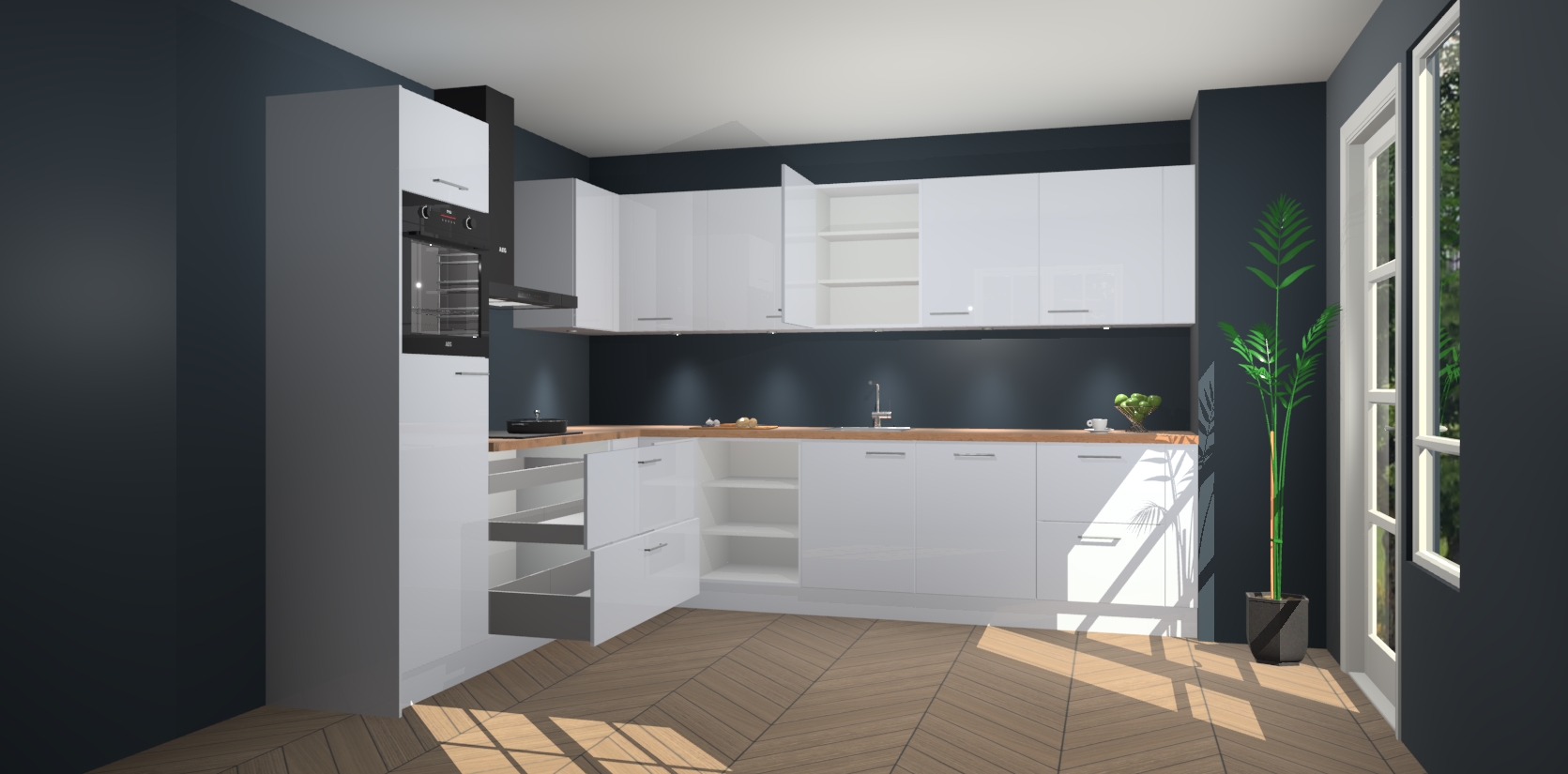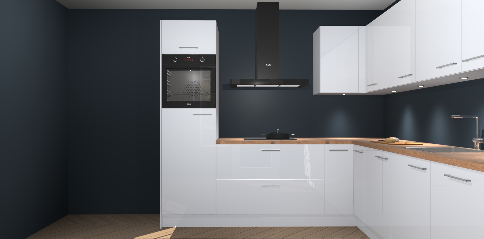 De Sneeuwwitte hoogglans keuken Debar is uitgerust met vijf inbouwapparaten die elke kooktaak handig en efficiënt maken. Een oven, inductiekookplaat, afzuigkap, vaatwasser en koelkast zijn standaard, maar kunnen na bestelling eenvoudig worden geupgrade naar AEG. Profiteer vervolgens van de softclose deuren voor snelle toegang en geruisloze toegang.