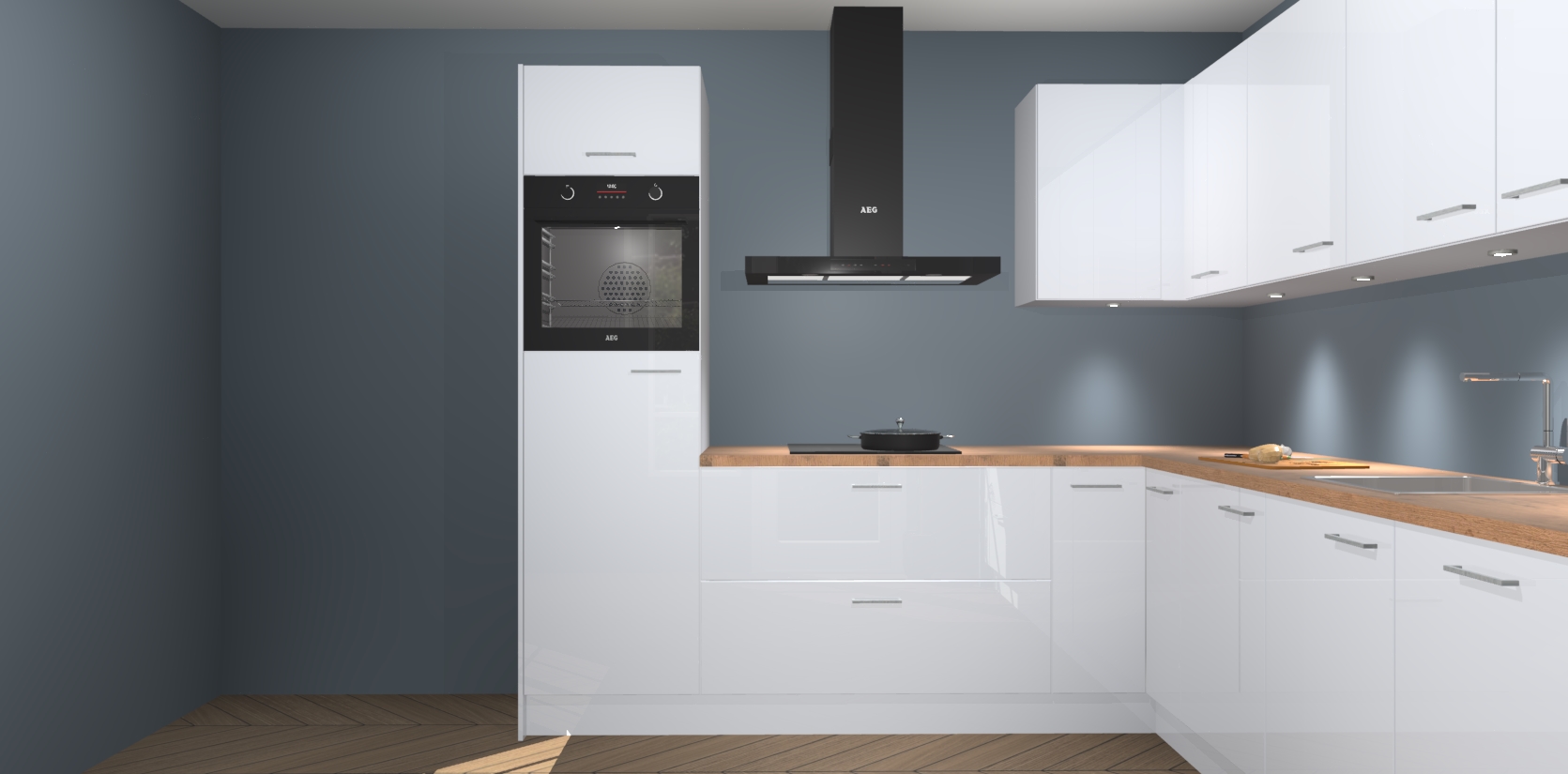 De Sneeuwwitte hoogglans keuken Debar is uitgerust met vijf inbouwapparaten die elke kooktaak handig en efficiënt maken. Een oven, inductiekookplaat, afzuigkap, vaatwasser en koelkast zijn standaard, maar kunnen na bestelling eenvoudig worden geupgrade naar AEG. Profiteer vervolgens van de softclose deuren voor snelle toegang en geruisloze toegang.