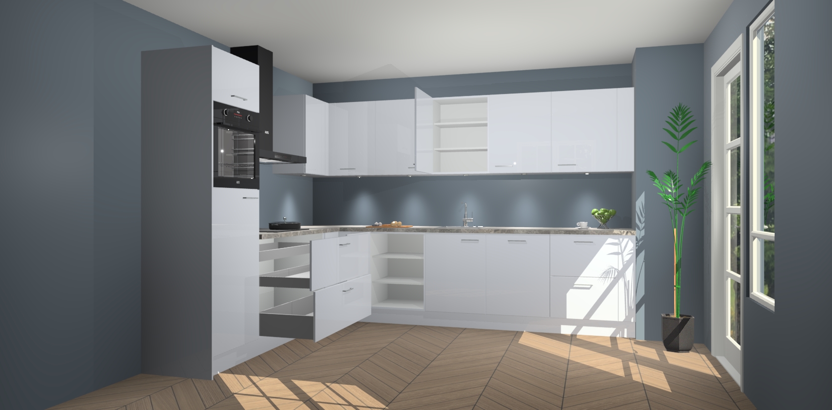 De Sneeuwwitte hoogglans keuken Debar is uitgerust met vijf inbouwapparaten die elke kooktaak handig en efficiënt maken. Een oven, inductiekookplaat, afzuigkap, vaatwasser en koelkast zijn standaard, maar kunnen na bestelling eenvoudig worden geupgrade naar AEG. Profiteer vervolgens van de softclose deuren voor snelle toegang en geruisloze toegang.