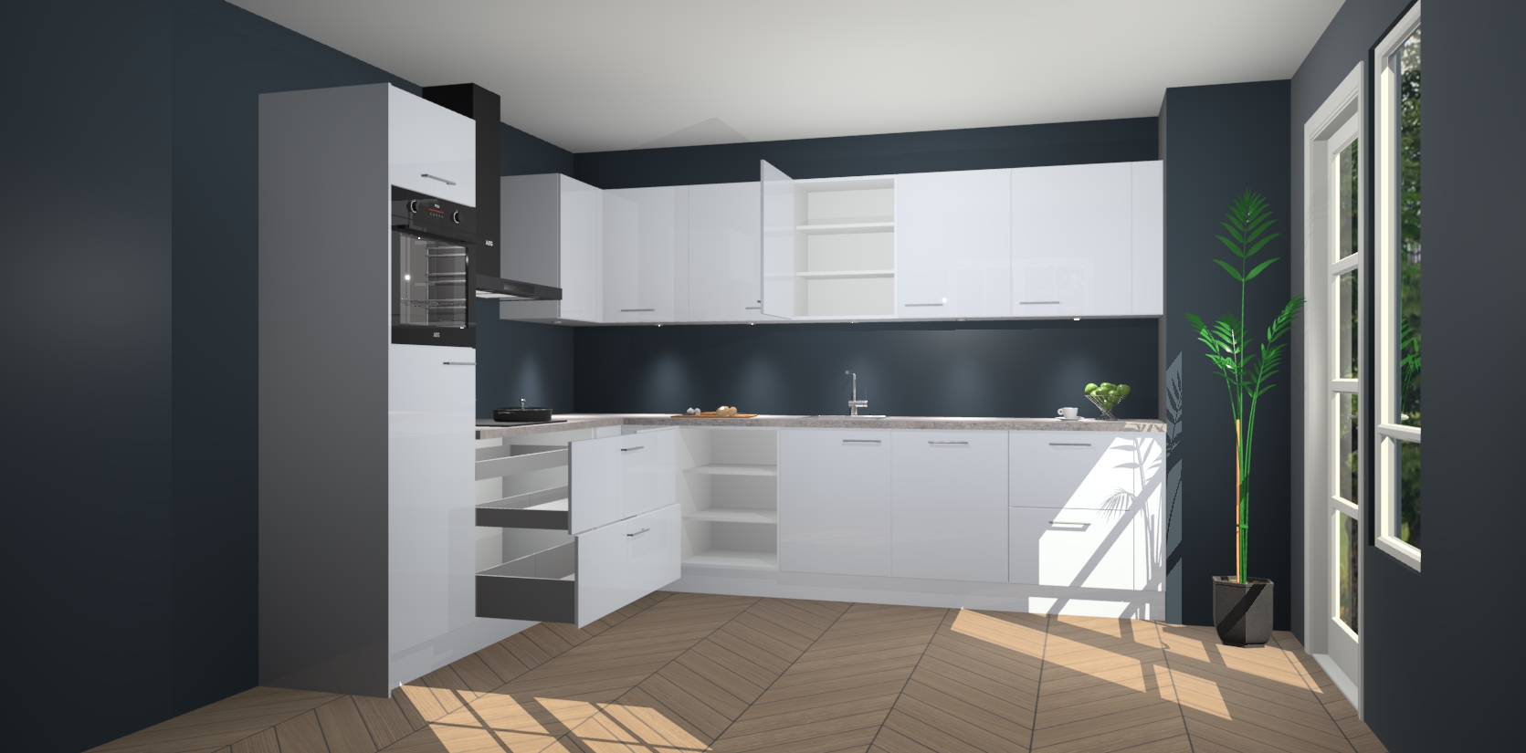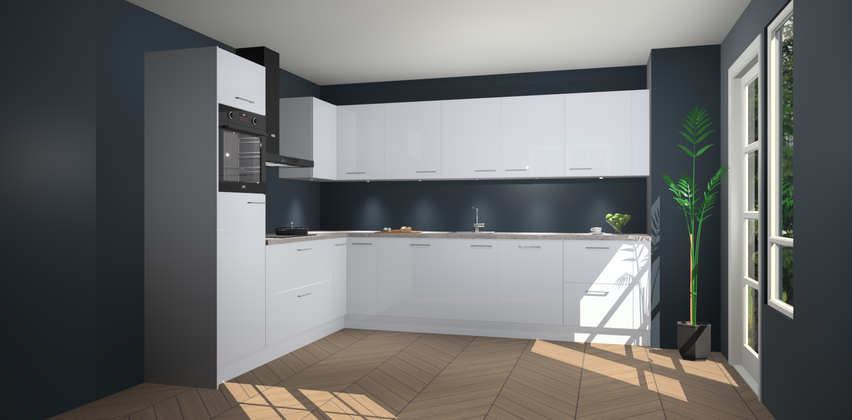 De Sneeuwwitte hoogglans keuken Debar is uitgerust met vijf inbouwapparaten die elke kooktaak handig en efficiënt maken. Een oven, inductiekookplaat, afzuigkap, vaatwasser en koelkast zijn standaard, maar kunnen na bestelling eenvoudig worden geupgrade naar AEG. Profiteer vervolgens van de softclose deuren voor snelle toegang en geruisloze toegang.