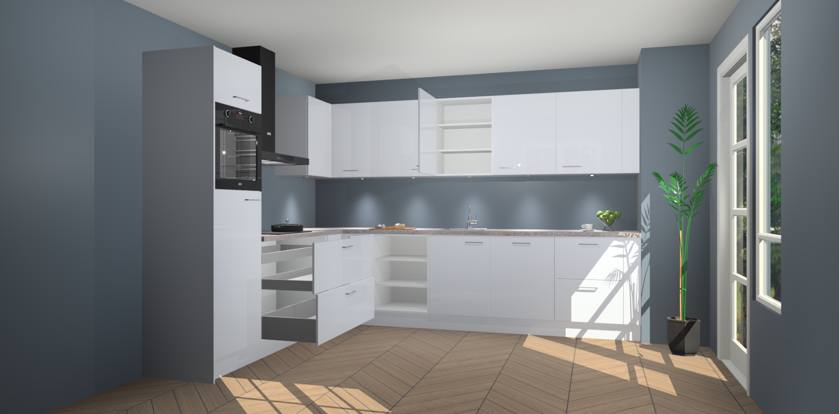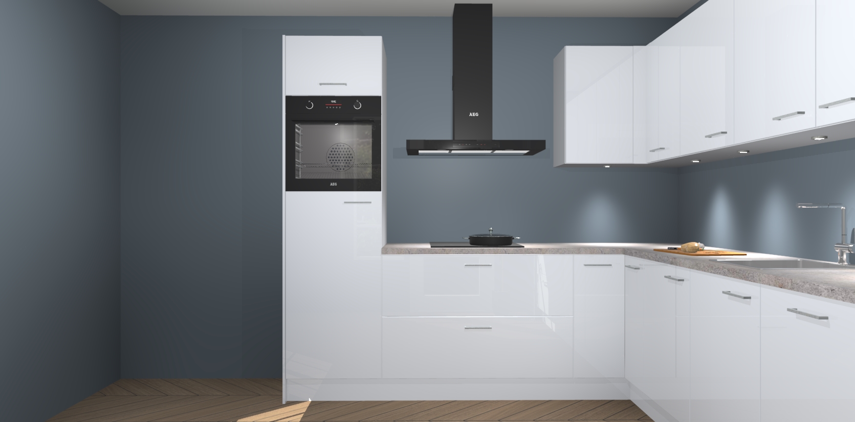 De Sneeuwwitte hoogglans keuken Debar is uitgerust met vijf inbouwapparaten die elke kooktaak handig en efficiënt maken. Een oven, inductiekookplaat, afzuigkap, vaatwasser en koelkast zijn standaard, maar kunnen na bestelling eenvoudig worden geupgrade naar AEG. Profiteer vervolgens van de softclose deuren voor snelle toegang en geruisloze toegang.
