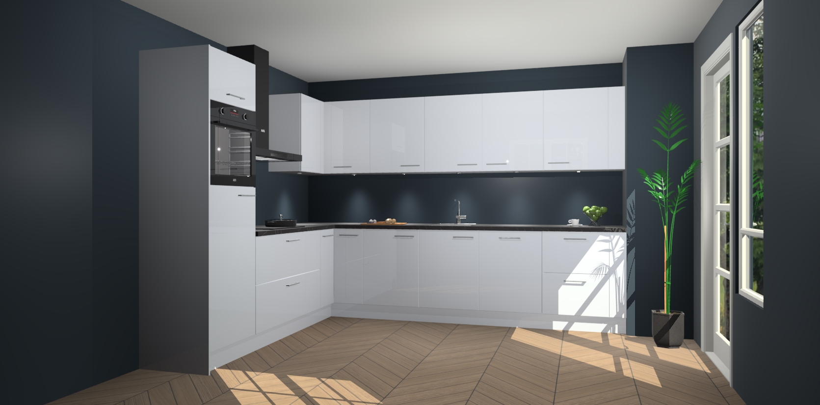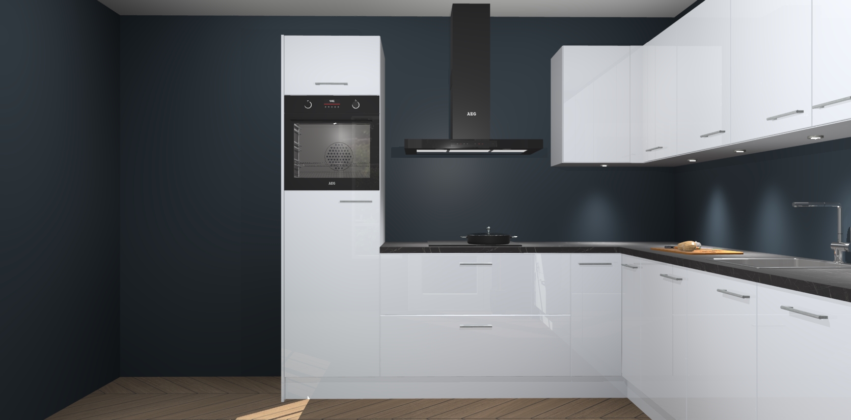 De Sneeuwwitte hoogglans keuken Debar is uitgerust met vijf inbouwapparaten die elke kooktaak handig en efficiënt maken. Een oven, inductiekookplaat, afzuigkap, vaatwasser en koelkast zijn standaard, maar kunnen na bestelling eenvoudig worden geupgrade naar AEG. Profiteer vervolgens van de softclose deuren voor snelle toegang en geruisloze toegang.