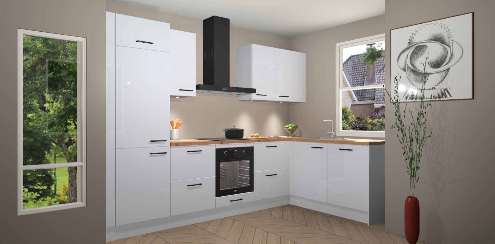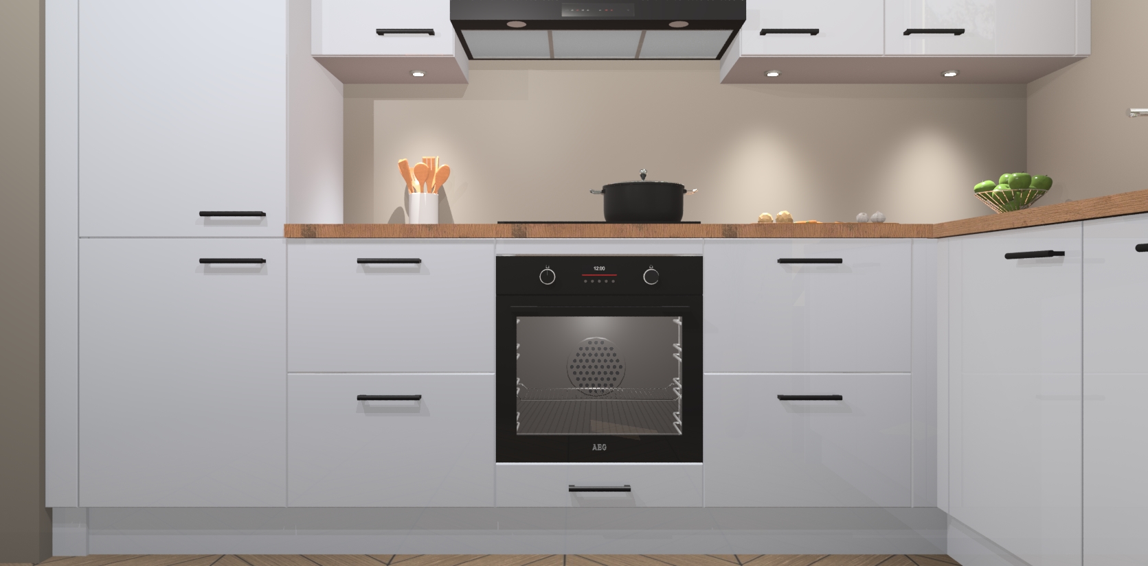 De Sneeuwwitte hoogglans keuken Geneve is uitgerust met 5 inbouwapparaten - een oven, inductiekookplaat, afzuigkap, vaatwasser en koelkast - voor al uw kook- en bewaarbehoeftes. U kunt deze apparaten desgewenst eenvoudig upgraden naar AEG of de oven omruilen voor een combimagnetron na het plaatsen van uw bestelling. En met de soft close deuren, voldoende opbergruimte en kasten die voorgemonteerd worden geleverd, bent u in een mum van tijd klaar om heerlijke maaltijden te bereiden!