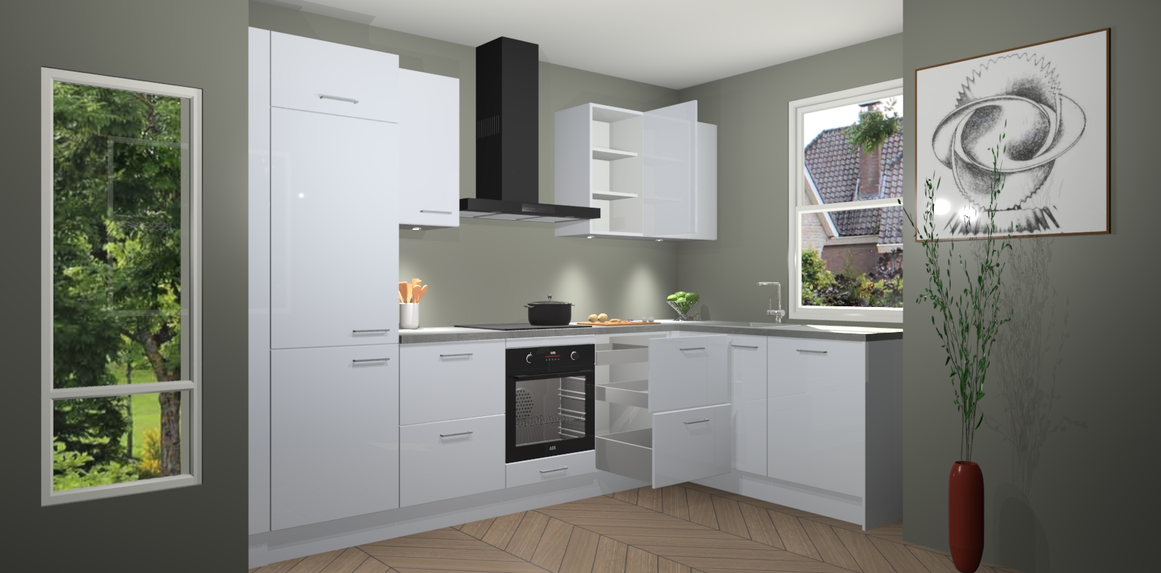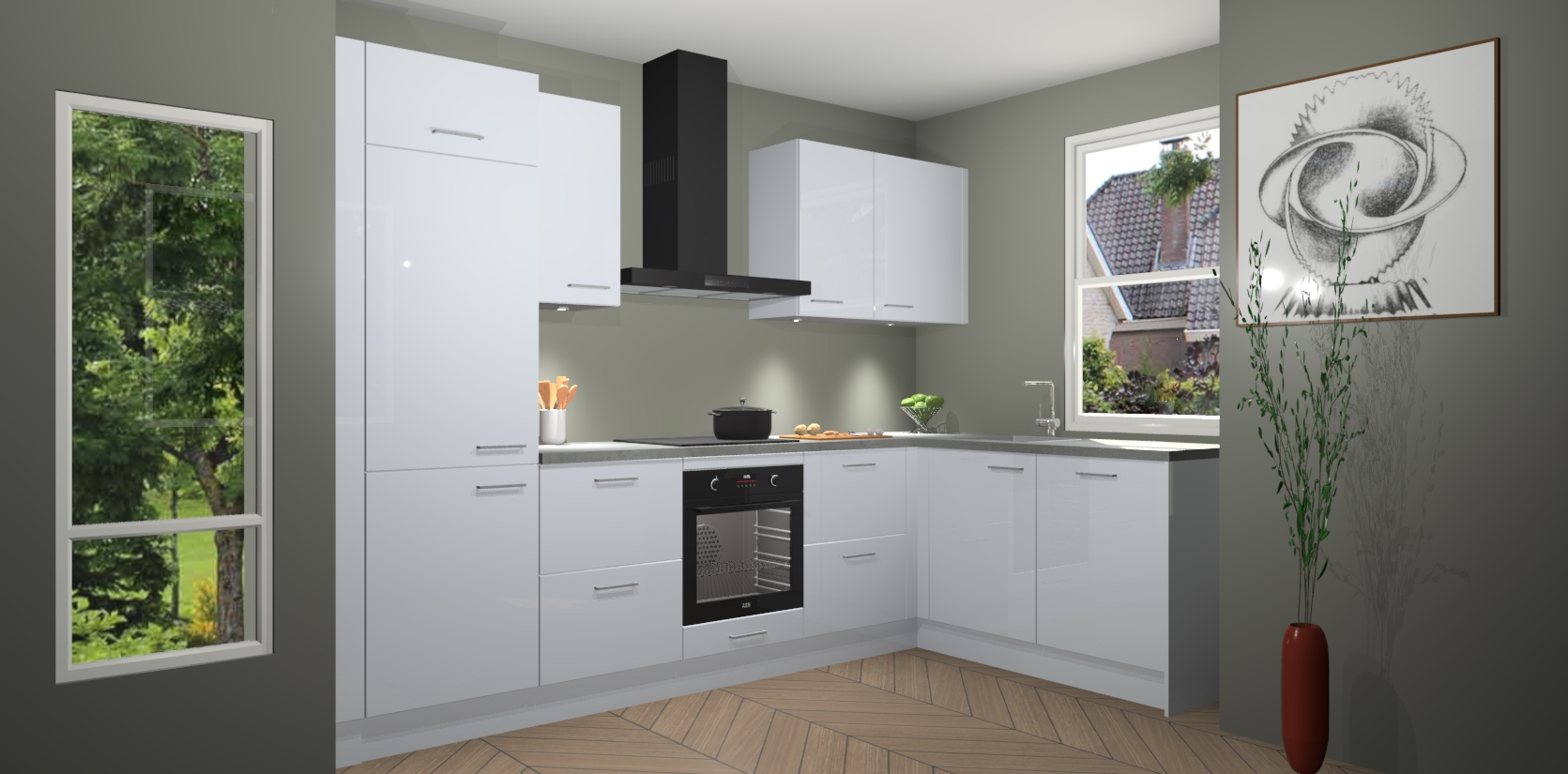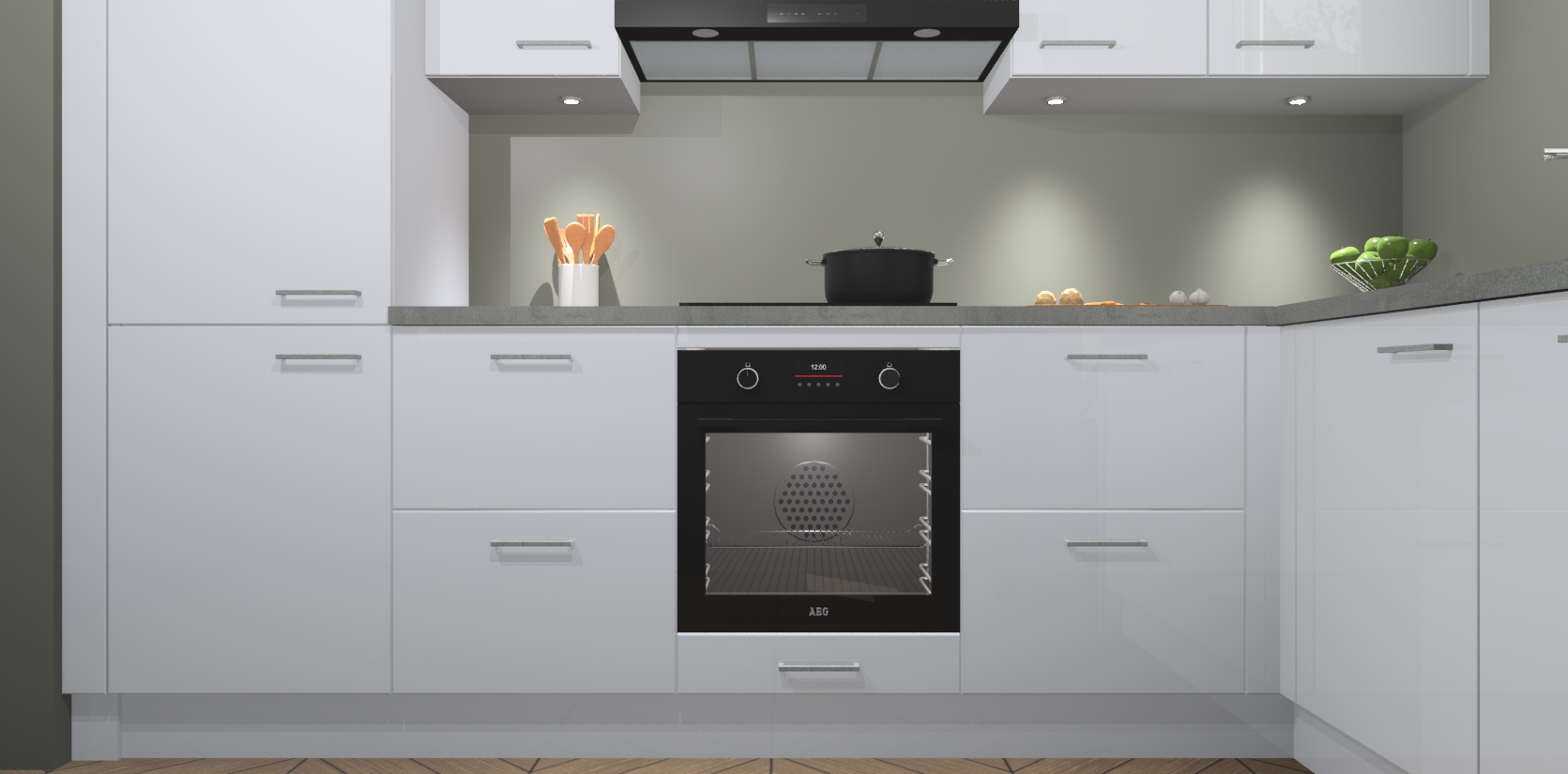 De Sneeuwwitte hoogglans keuken Geneve is uitgerust met 5 inbouwapparaten - een oven, inductiekookplaat, afzuigkap, vaatwasser en koelkast - voor al uw kook- en bewaarbehoeftes. U kunt deze apparaten desgewenst eenvoudig upgraden naar AEG of de oven omruilen voor een combimagnetron na het plaatsen van uw bestelling. En met de soft close deuren, voldoende opbergruimte en kasten die voorgemonteerd worden geleverd, bent u in een mum van tijd klaar om heerlijke maaltijden te bereiden!