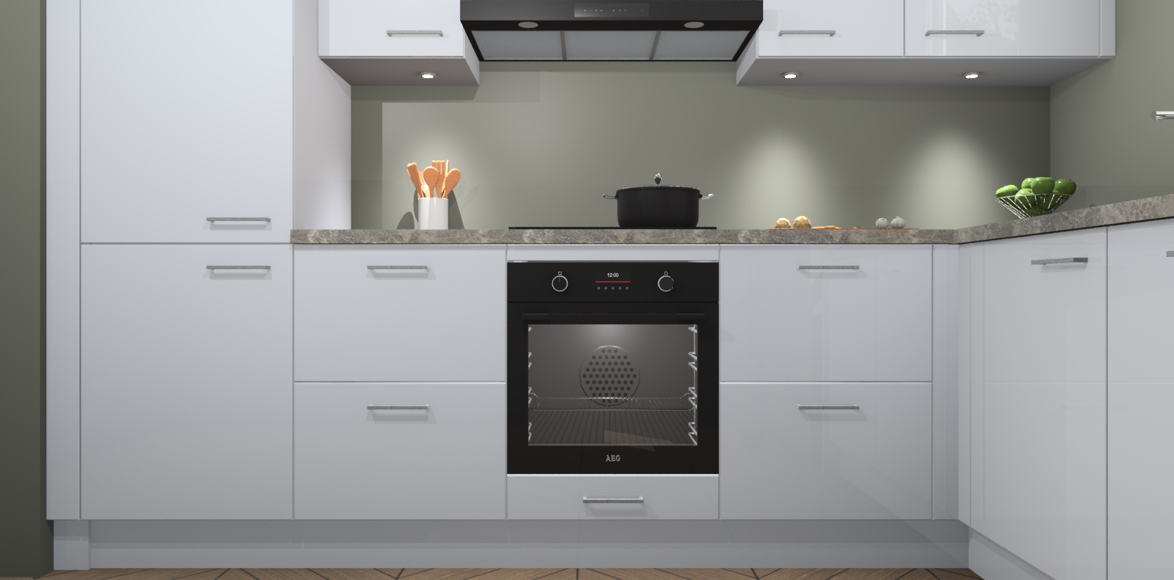 De Sneeuwwitte hoogglans keuken Geneve is uitgerust met 5 inbouwapparaten - een oven, inductiekookplaat, afzuigkap, vaatwasser en koelkast - voor al uw kook- en bewaarbehoeftes. U kunt deze apparaten desgewenst eenvoudig upgraden naar AEG of de oven omruilen voor een combimagnetron na het plaatsen van uw bestelling. En met de soft close deuren, voldoende opbergruimte en kasten die voorgemonteerd worden geleverd, bent u in een mum van tijd klaar om heerlijke maaltijden te bereiden!
