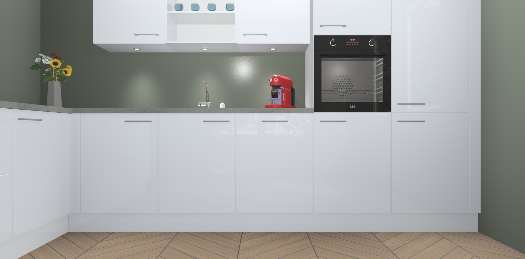De Sneeuwwitte hoogglans keuken Gotenburg is zo ontworpen dat u alle mogelijke vormen van opslagruimte kunt genieten. Bovendien heeft u meteen toegang tot vijf ingebouwde apparaten: een oven, inductiekookplaat, afzuigkap, vaatwasser en koelkast. Gewoon upgraden naar AEG na bestelling? Dit kan heel gemakkelijk worden geregeld. De deuren sluiten zacht dankzij zachtsluitende scharnieren en ze houden warmte vast terwijl ze uitzonderlijk stil blijven wanneer ze worden geopend of gesloten.