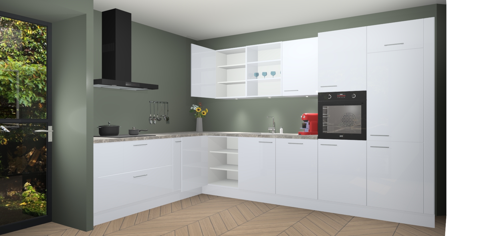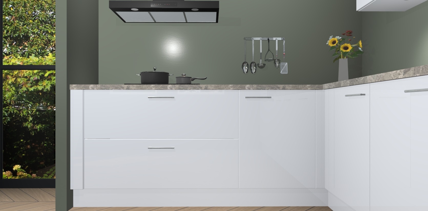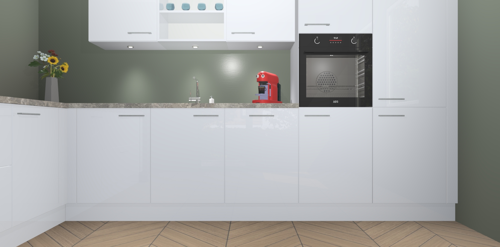 De Sneeuwwitte hoogglans keuken Gotenburg is zo ontworpen dat u alle mogelijke vormen van opslagruimte kunt genieten. Bovendien heeft u meteen toegang tot vijf ingebouwde apparaten: een oven, inductiekookplaat, afzuigkap, vaatwasser en koelkast. Gewoon upgraden naar AEG na bestelling? Dit kan heel gemakkelijk worden geregeld. De deuren sluiten zacht dankzij zachtsluitende scharnieren en ze houden warmte vast terwijl ze uitzonderlijk stil blijven wanneer ze worden geopend of gesloten.