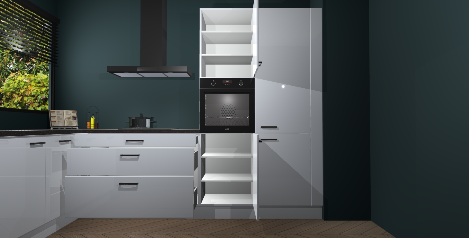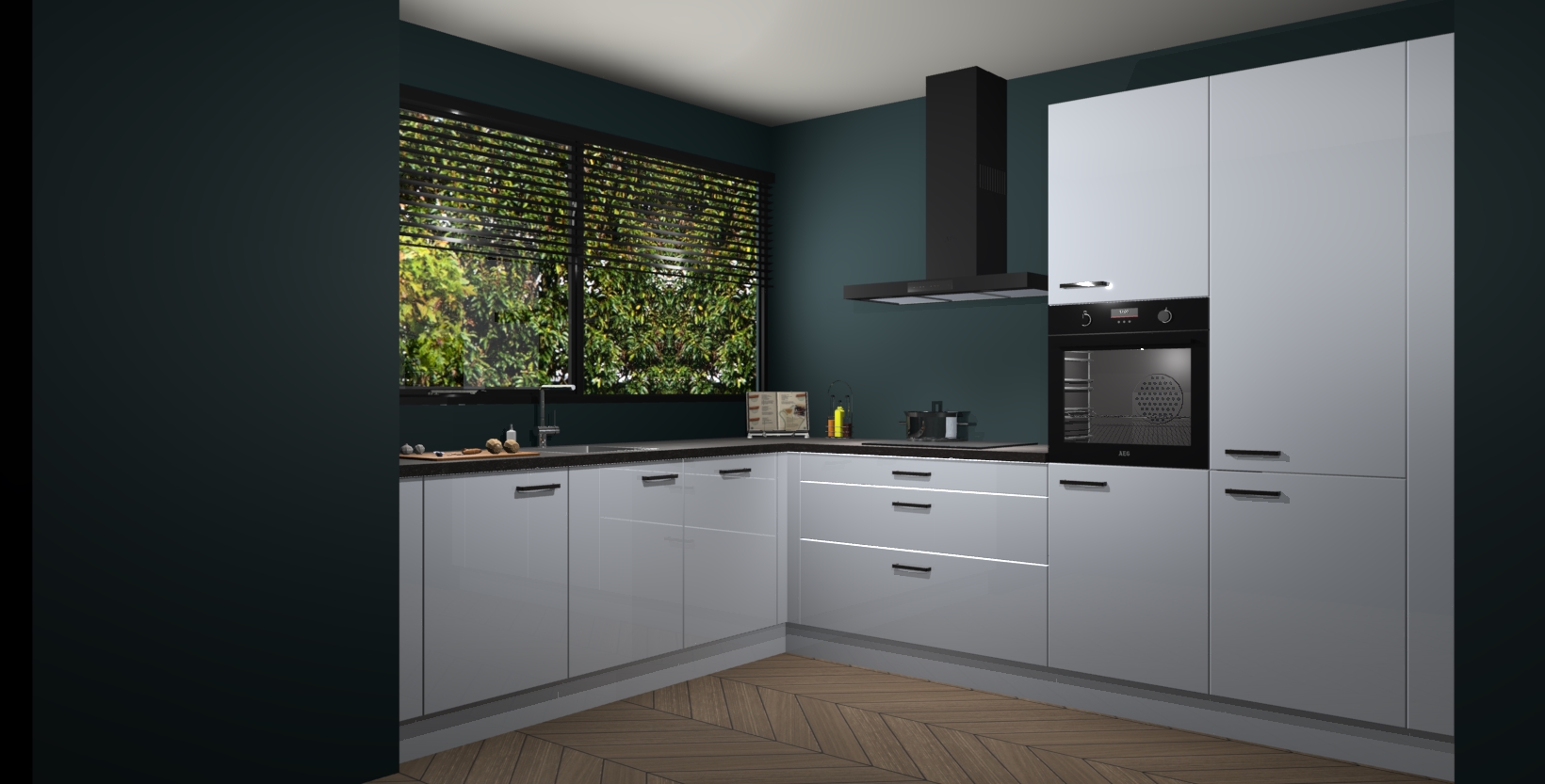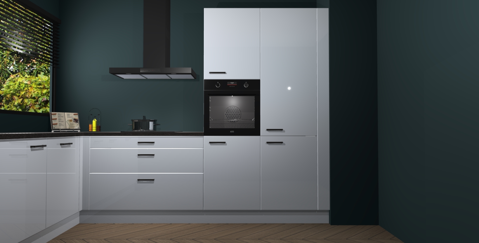 Met een modern, tijdloos design en ruime opslagruimte, zult u zich in no-time thuis voelen in uw nieuwe keuken. Uw leven wordt eenvoudiger met de soft-close deuren die voor het ultieme stille comfort zorgen - geen geluid dat u stoort terwijl u kookt. Ook is de keuken voorzien van 5 ingebouwde apparaten: een oven, inductie kookplaat, afzuigkap, vaatwasser en koelkast. Deze kunnen gemakkelijk na bestelling worden bijgewerkt naar AEG - waardoor uw luxe ervaring compleet is.