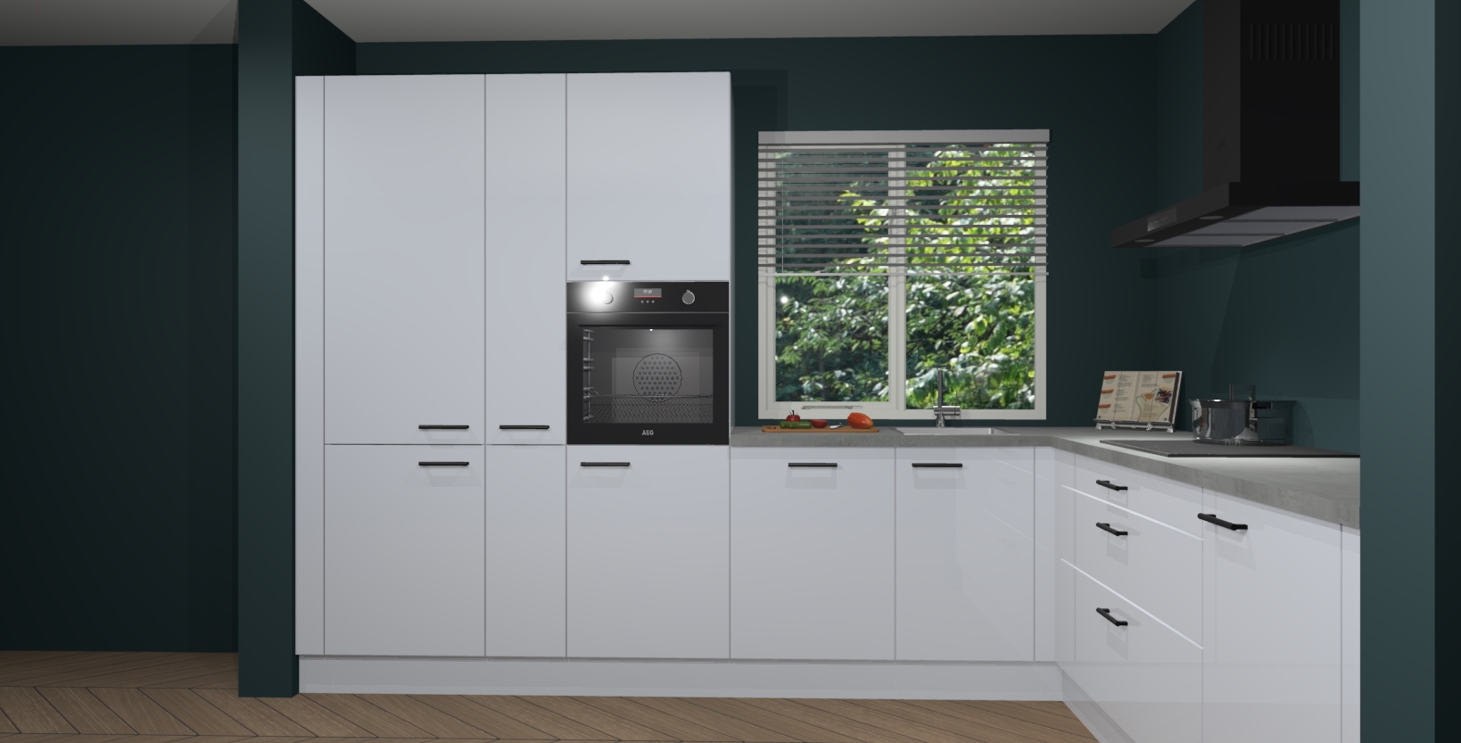 Met een modern, tijdloos design en ruime opslagruimte, zult u zich in no-time thuis voelen in uw nieuwe keuken. Uw leven wordt eenvoudiger met de soft-close deuren die voor het ultieme stille comfort zorgen - geen geluid dat u stoort terwijl u kookt. Ook is de keuken voorzien van 5 ingebouwde apparaten: een oven, inductie kookplaat, afzuigkap, vaatwasser en koelkast. Deze kunnen gemakkelijk na bestelling worden bijgewerkt naar AEG - waardoor uw luxe ervaring compleet is.