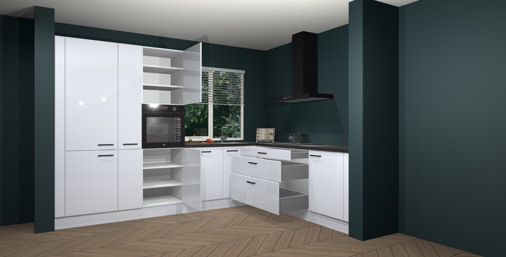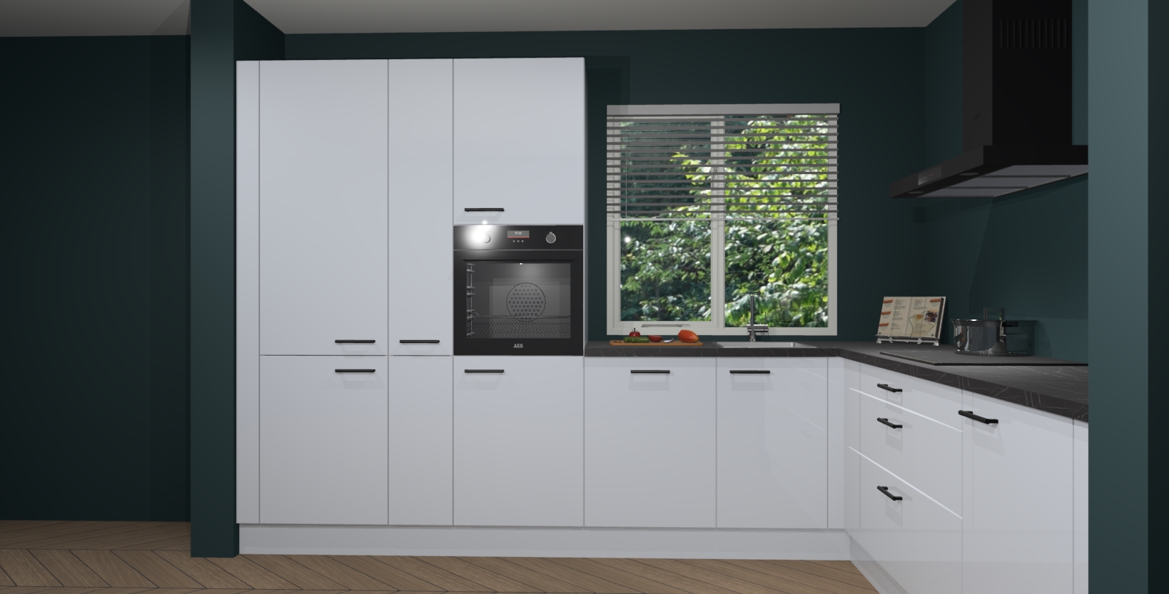 Met een modern, tijdloos design en ruime opslagruimte, zult u zich in no-time thuis voelen in uw nieuwe keuken. Uw leven wordt eenvoudiger met de soft-close deuren die voor het ultieme stille comfort zorgen - geen geluid dat u stoort terwijl u kookt. Ook is de keuken voorzien van 5 ingebouwde apparaten: een oven, inductie kookplaat, afzuigkap, vaatwasser en koelkast. Deze kunnen gemakkelijk na bestelling worden bijgewerkt naar AEG - waardoor uw luxe ervaring compleet is.