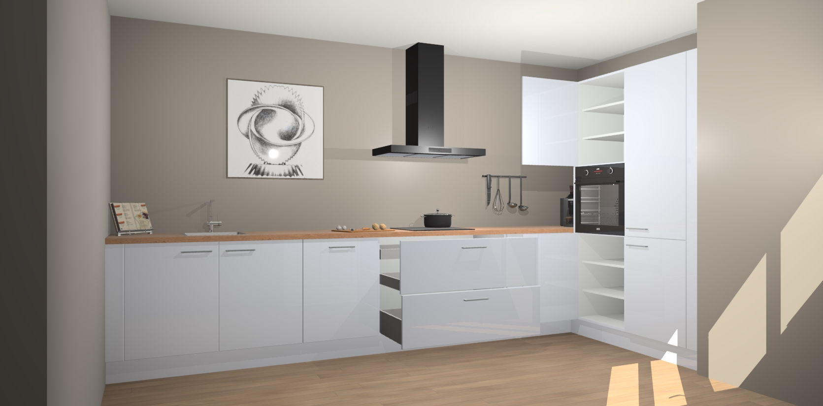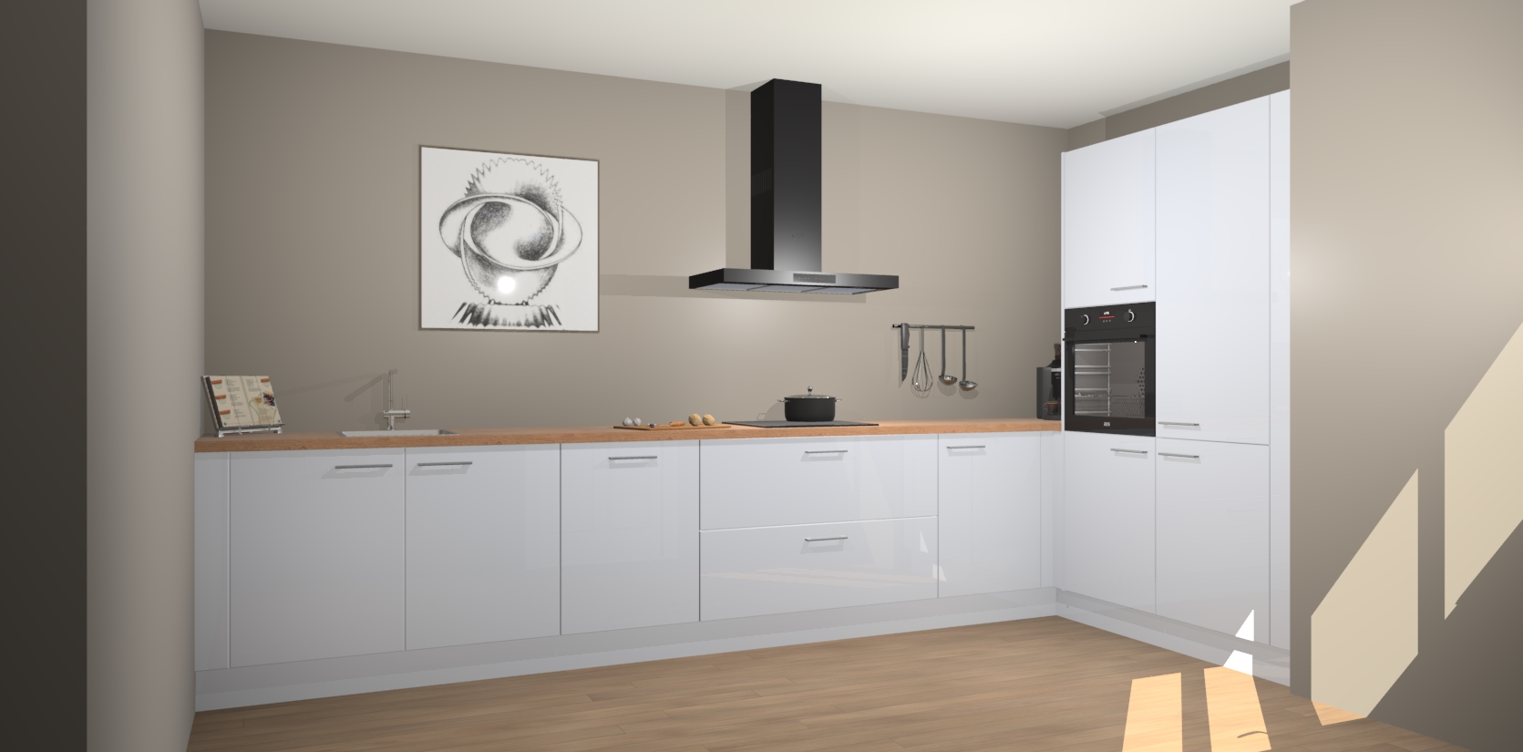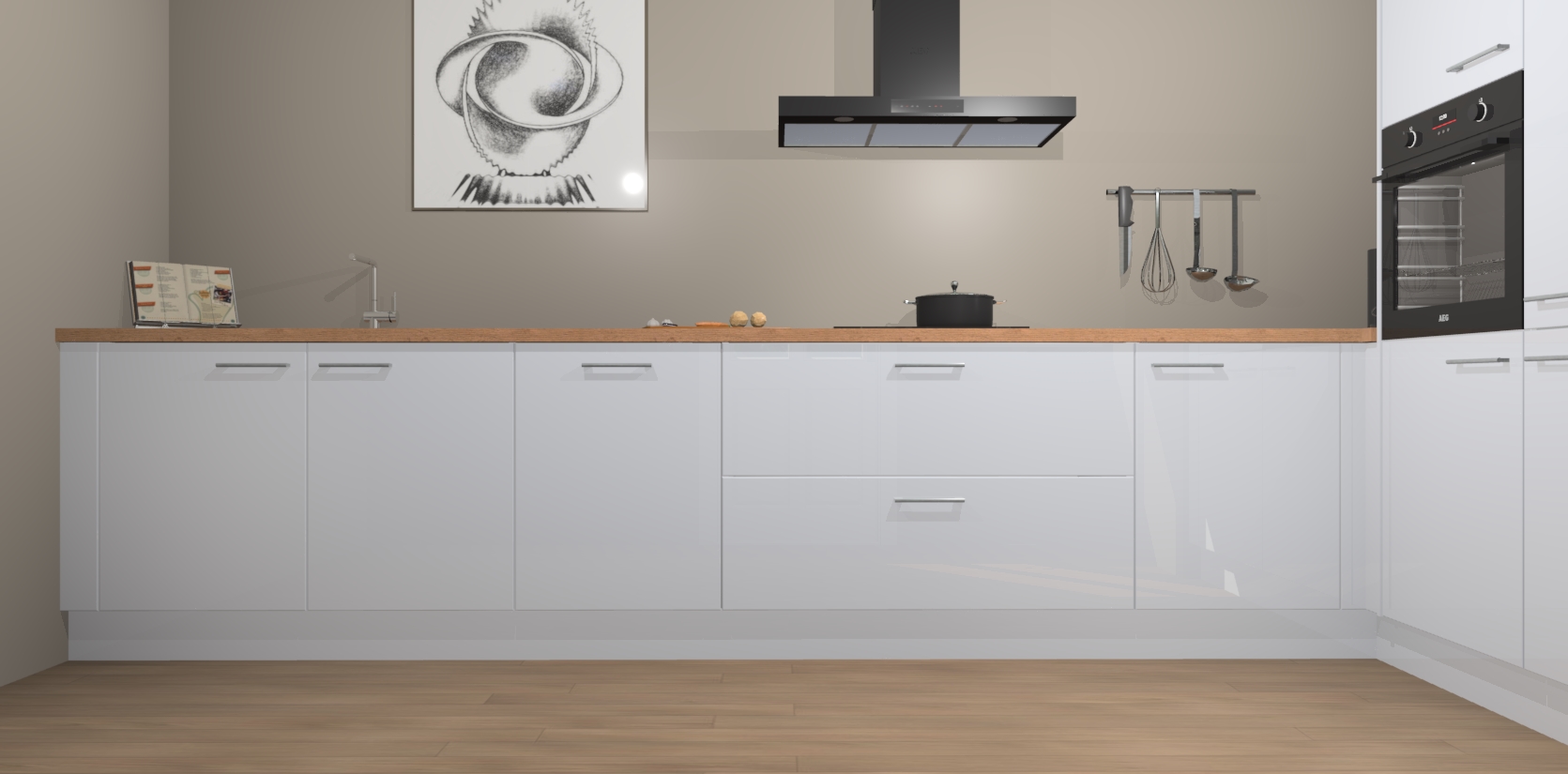 Welkom bij de Sneeuwwitte hoogglans keuken Khao Lak. Deze prachtige keuken zal de komende jaren het middelpunt van de belangstelling in uw huis zijn. Uitgerust met vijf inbouwapparaten komt u nooit kookgereedschap tekort. Bovendien geeft de warme houtlook elke ruimte een uitnodigende en tijdloze uitstraling.