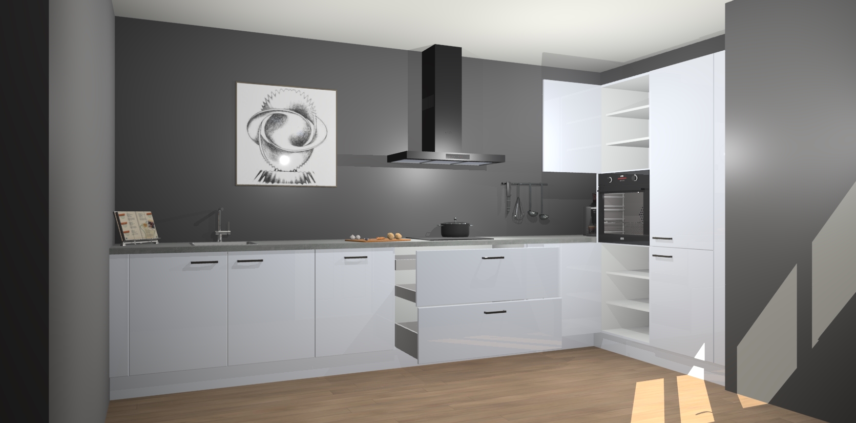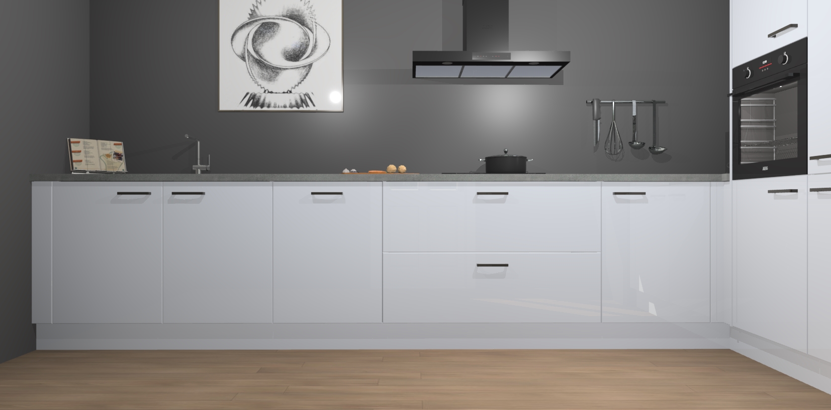 Welkom bij de Sneeuwwitte hoogglans keuken Khao Lak. Deze prachtige keuken zal de komende jaren het middelpunt van de belangstelling in uw huis zijn. Uitgerust met vijf inbouwapparaten komt u nooit kookgereedschap tekort. Bovendien geeft de warme houtlook elke ruimte een uitnodigende en tijdloze uitstraling.