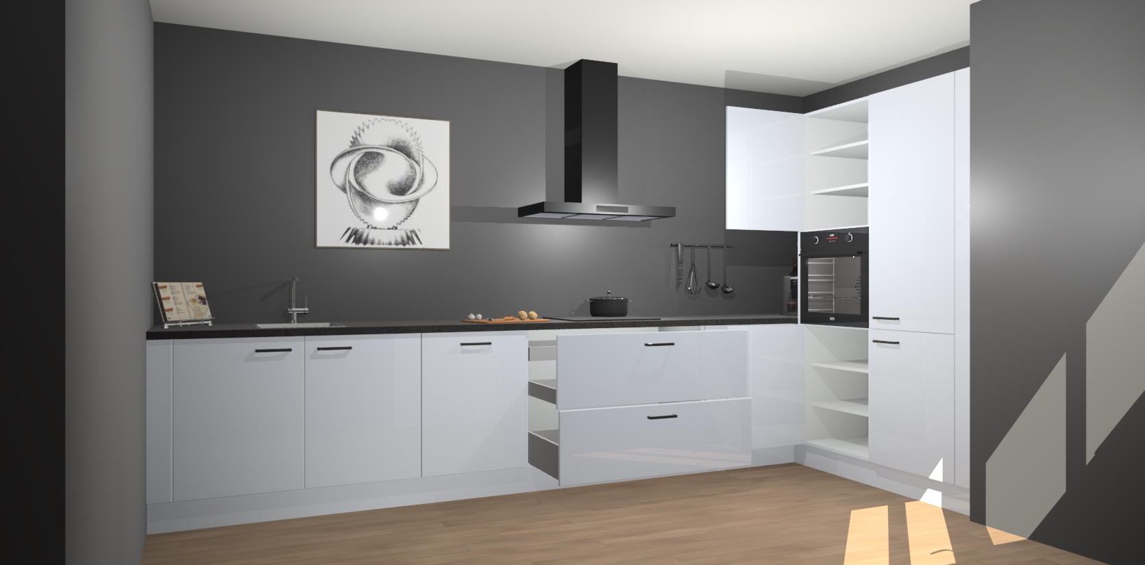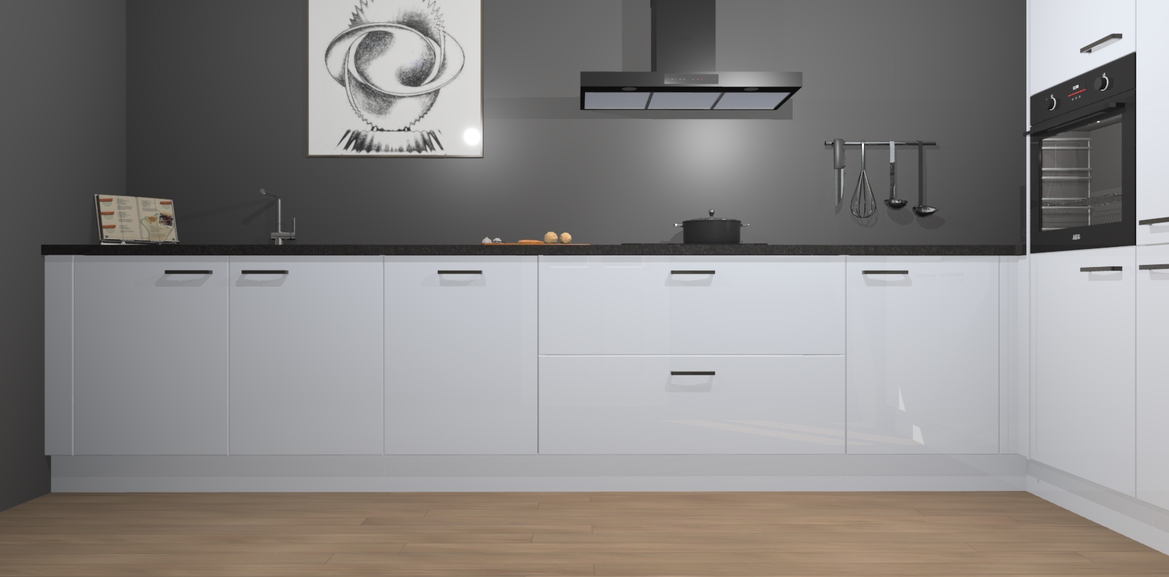 Welkom bij de Sneeuwwitte hoogglans keuken Khao Lak. Deze prachtige keuken zal de komende jaren het middelpunt van de belangstelling in uw huis zijn. Uitgerust met vijf inbouwapparaten komt u nooit kookgereedschap tekort. Bovendien geeft de warme houtlook elke ruimte een uitnodigende en tijdloze uitstraling.