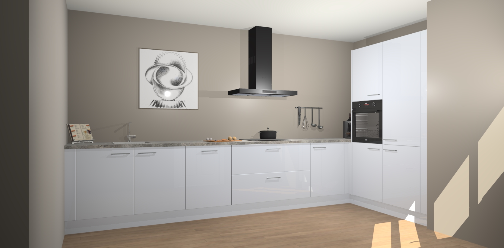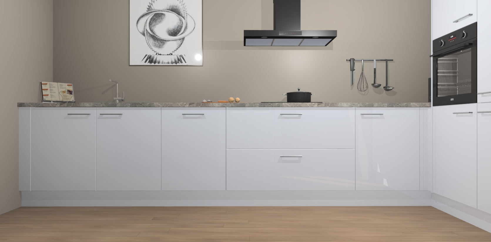 Welkom bij de Sneeuwwitte hoogglans keuken Khao Lak. Deze prachtige keuken zal de komende jaren het middelpunt van de belangstelling in uw huis zijn. Uitgerust met vijf inbouwapparaten komt u nooit kookgereedschap tekort. Bovendien geeft de warme houtlook elke ruimte een uitnodigende en tijdloze uitstraling.