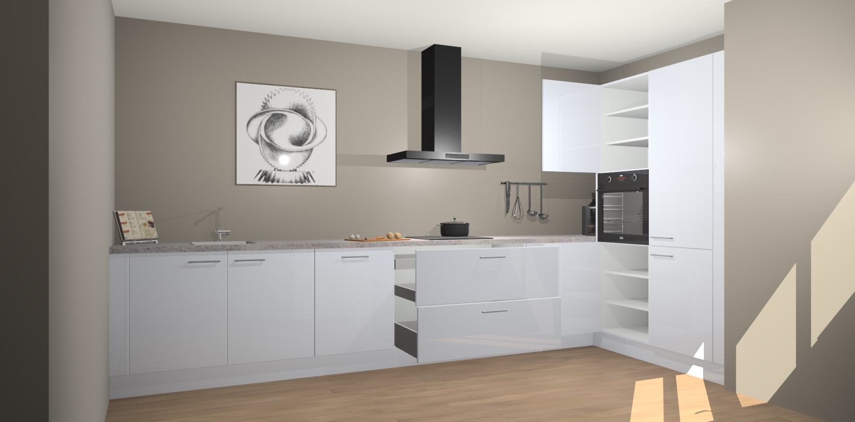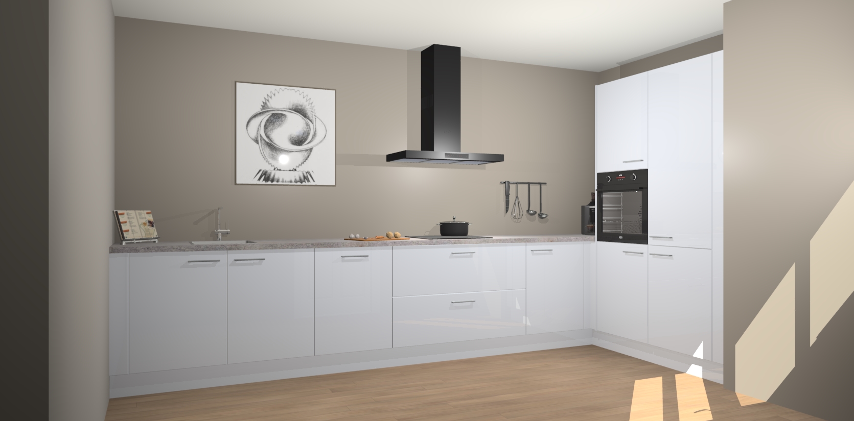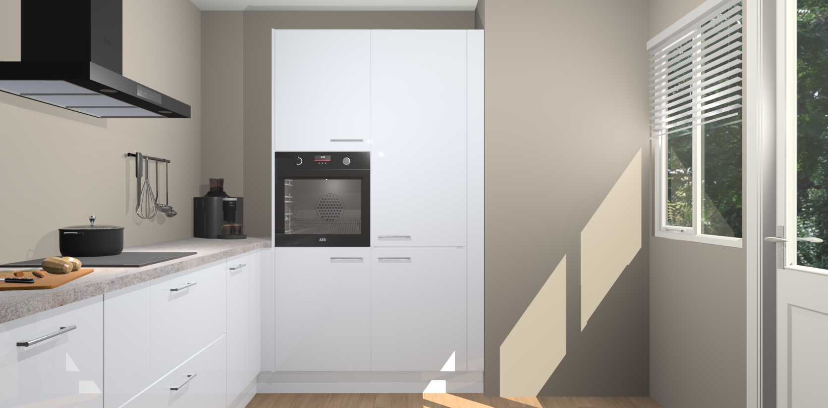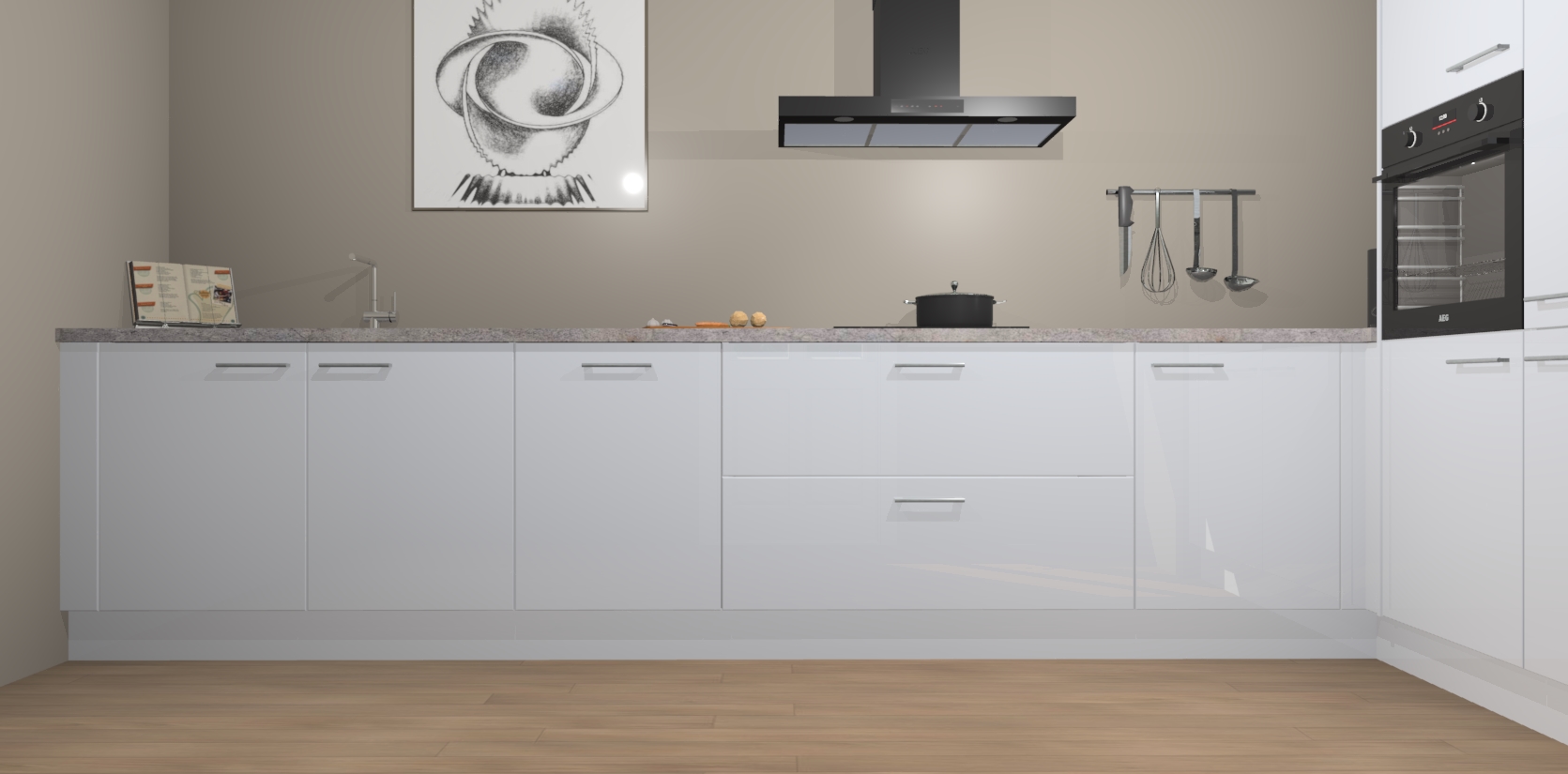 Welkom bij de Sneeuwwitte hoogglans keuken Khao Lak. Deze prachtige keuken zal de komende jaren het middelpunt van de belangstelling in uw huis zijn. Uitgerust met vijf inbouwapparaten komt u nooit kookgereedschap tekort. Bovendien geeft de warme houtlook elke ruimte een uitnodigende en tijdloze uitstraling.