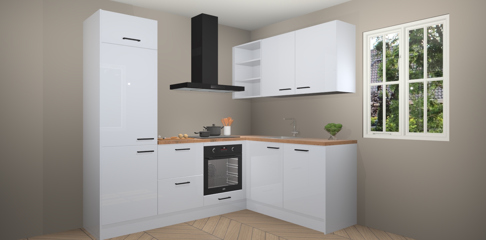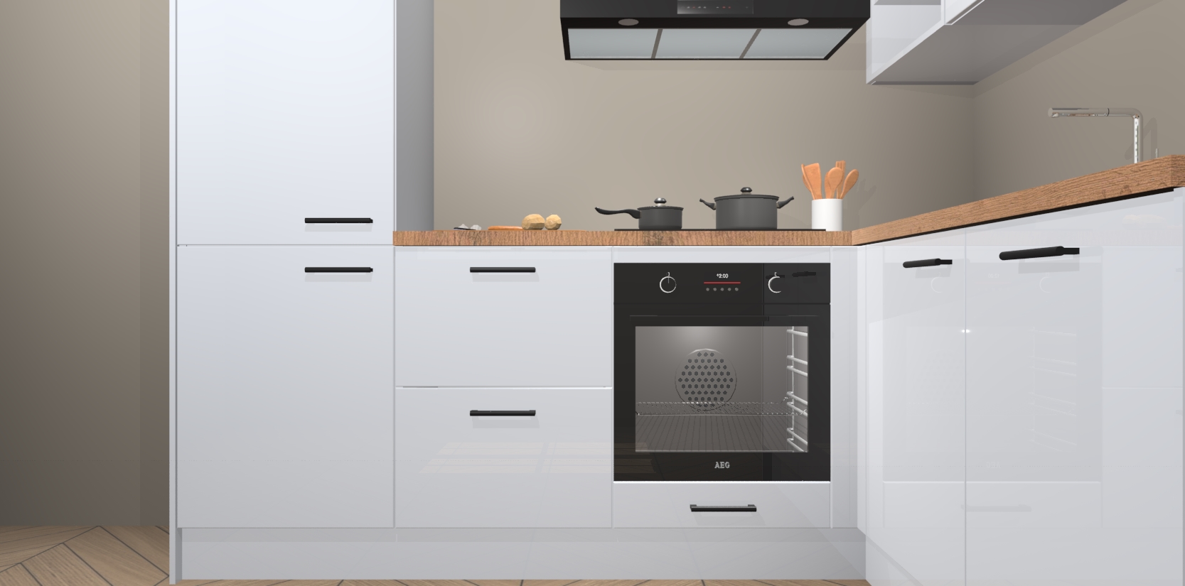Dit model biedt u voldoende opbergruimte en vijf ingebouwde apparaten: een oven, inductiekookplaat, afzuigkap, vaatwasser en koelkast. Deze apparaten kunnen gemakkelijk worden geüpgrade naar AEG nadat u besteld heeft. De verschillende laden en kastjes bevatten softclose-deuren waardoor ze gezellig dichtvallen met een geruststellend helemaal geruisloos geluid. En dat is nog niet alles! We garanderen ook dat de prijs altijd laag blijft - dus haal nu uw Sneeuwwitte hoogglans keuken Krakau terwijl het kan.