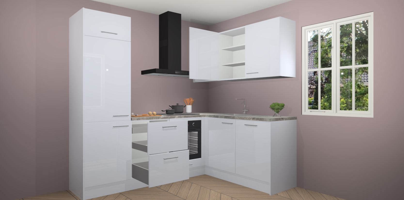 Dit model biedt u voldoende opbergruimte en vijf ingebouwde apparaten: een oven, inductiekookplaat, afzuigkap, vaatwasser en koelkast. Deze apparaten kunnen gemakkelijk worden geüpgrade naar AEG nadat u besteld heeft. De verschillende laden en kastjes bevatten softclose-deuren waardoor ze gezellig dichtvallen met een geruststellend helemaal geruisloos geluid. En dat is nog niet alles! We garanderen ook dat de prijs altijd laag blijft - dus haal nu uw Sneeuwwitte hoogglans keuken Krakau terwijl het kan.
