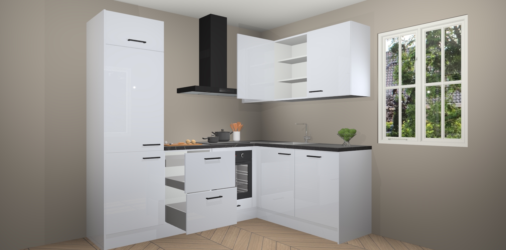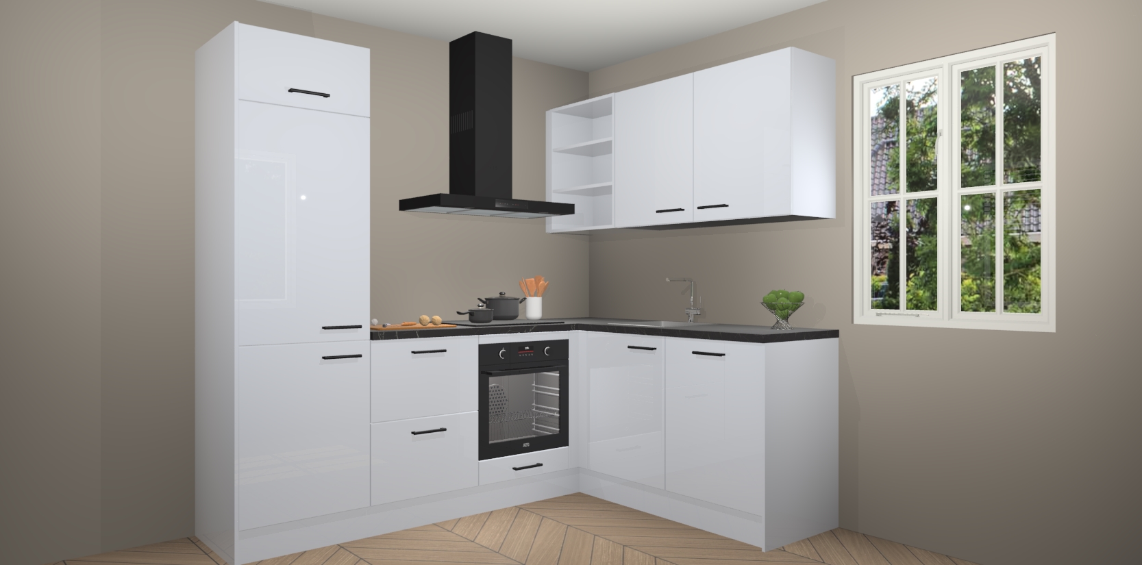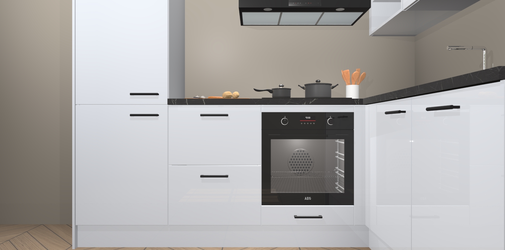 Dit model biedt u voldoende opbergruimte en vijf ingebouwde apparaten: een oven, inductiekookplaat, afzuigkap, vaatwasser en koelkast. Deze apparaten kunnen gemakkelijk worden geüpgrade naar AEG nadat u besteld heeft. De verschillende laden en kastjes bevatten softclose-deuren waardoor ze gezellig dichtvallen met een geruststellend helemaal geruisloos geluid. En dat is nog niet alles! We garanderen ook dat de prijs altijd laag blijft - dus haal nu uw Sneeuwwitte hoogglans keuken Krakau terwijl het kan.