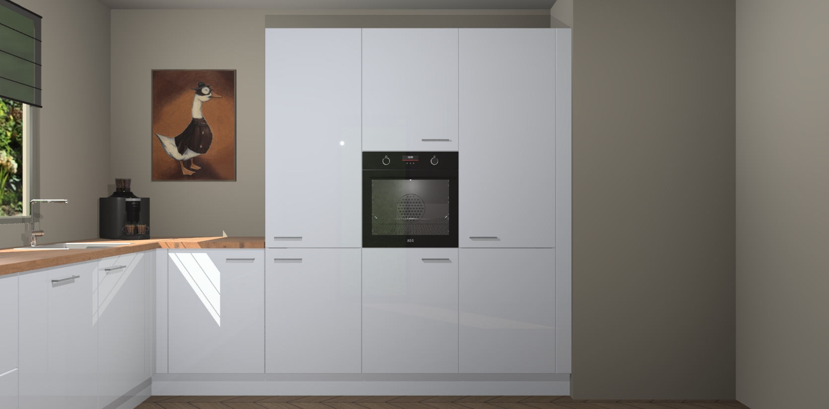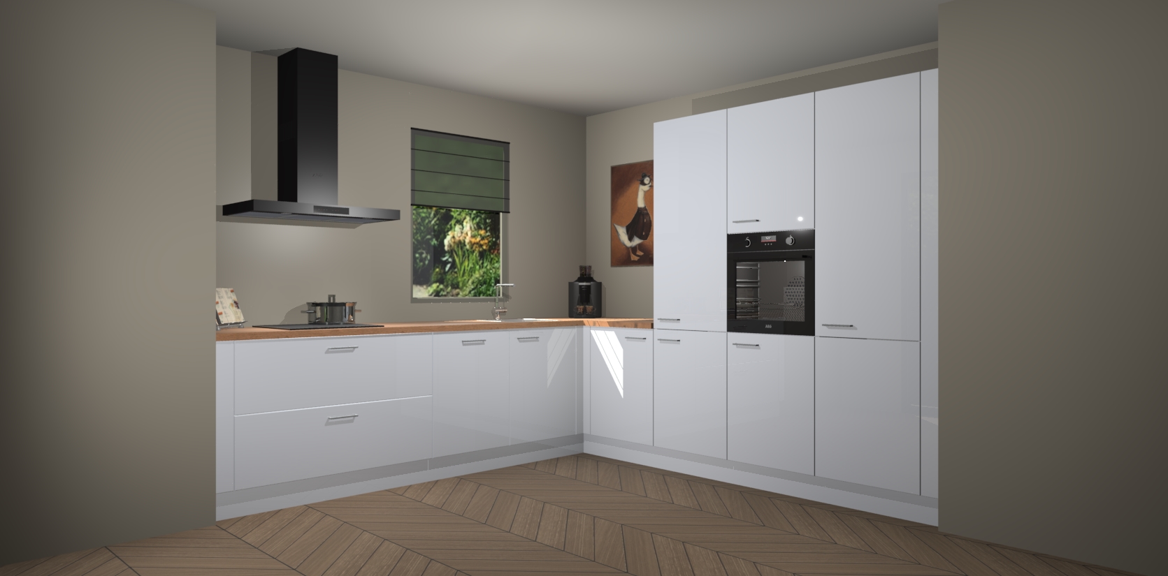 Welkom bij de Sneeuwwitte hoogglans keuken Laos. Deze prachtige keuken zal de komende jaren het middelpunt van de belangstelling in uw huis zijn. Uitgerust met vijf inbouwapparaten komt u nooit kookgereedschap tekort. Bovendien geeft de warme houtlook elke ruimte een uitnodigende en tijdloze uitstraling.
