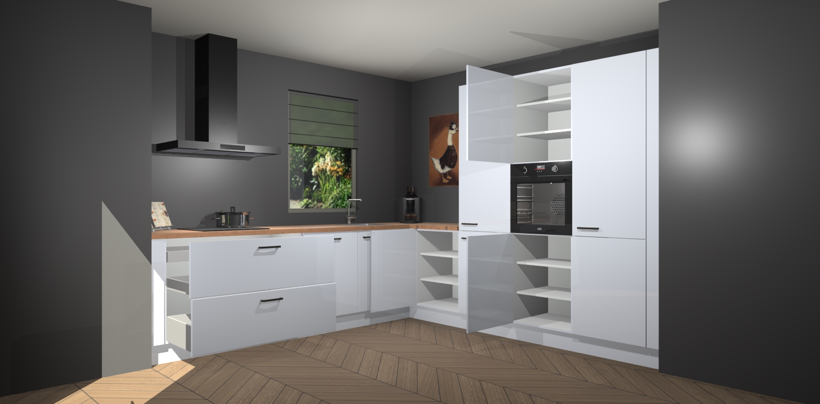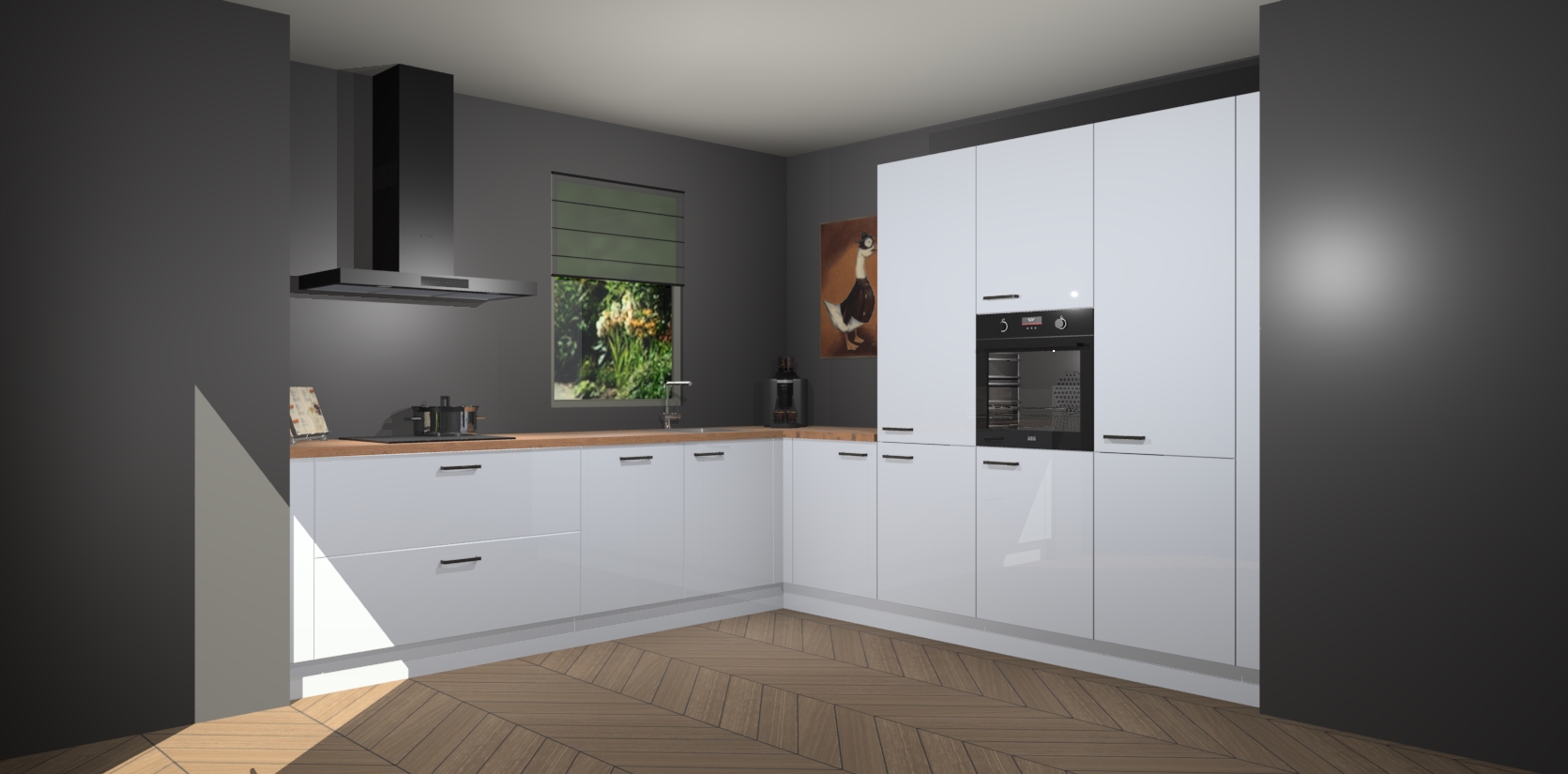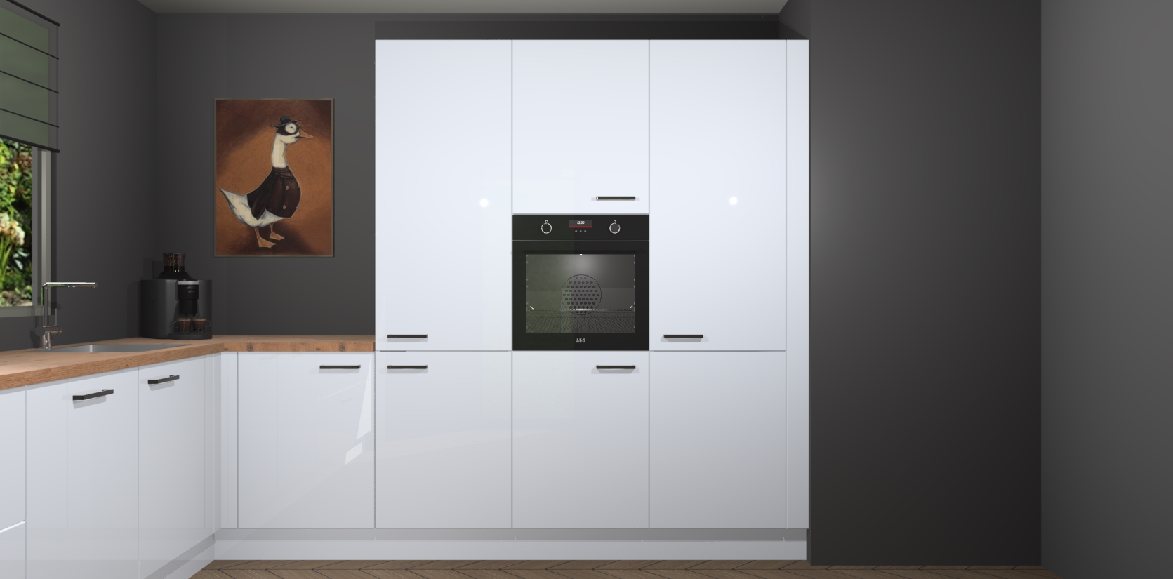 Welkom bij de Sneeuwwitte hoogglans keuken Laos. Deze prachtige keuken zal de komende jaren het middelpunt van de belangstelling in uw huis zijn. Uitgerust met vijf inbouwapparaten komt u nooit kookgereedschap tekort. Bovendien geeft de warme houtlook elke ruimte een uitnodigende en tijdloze uitstraling.
