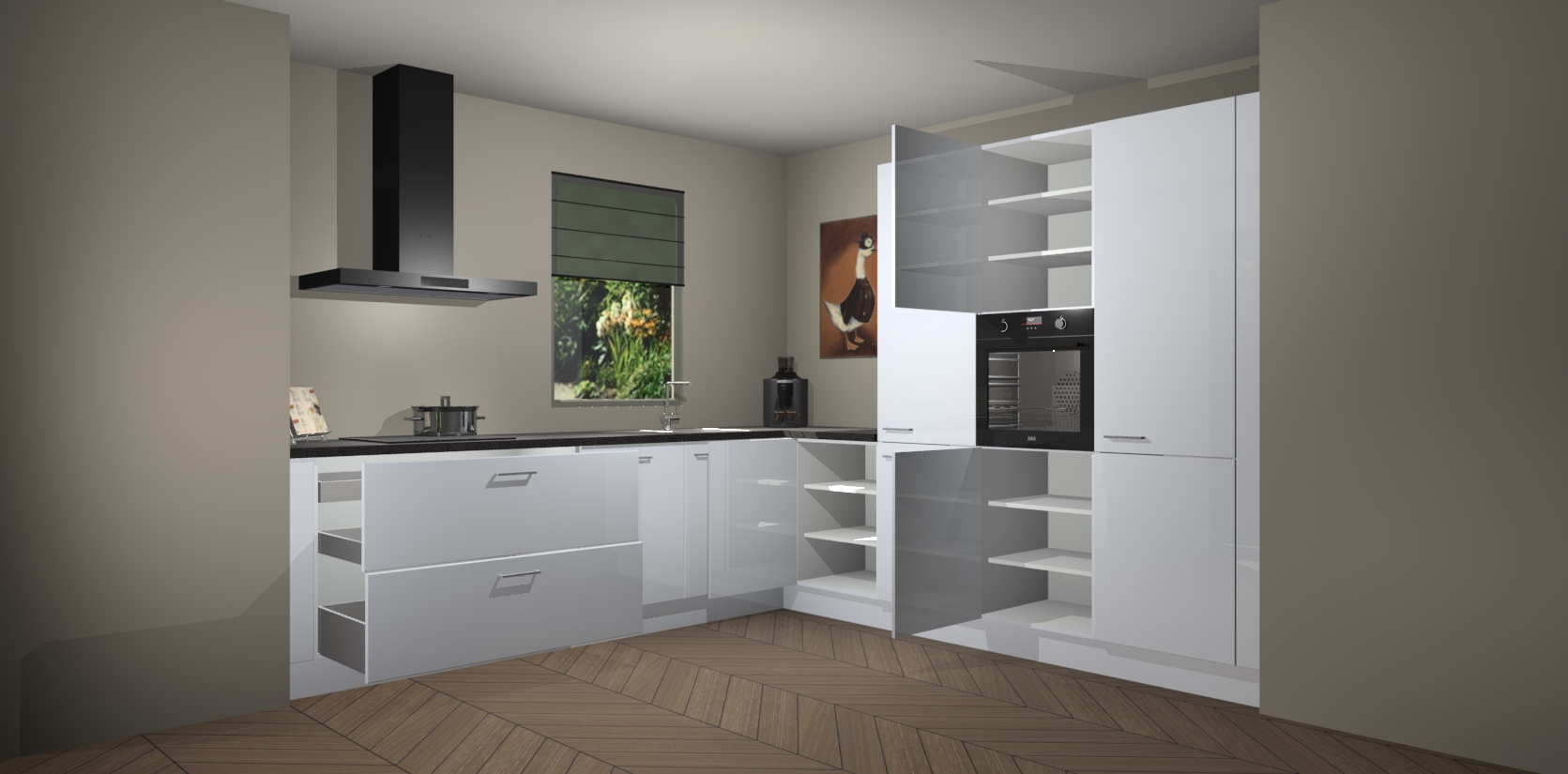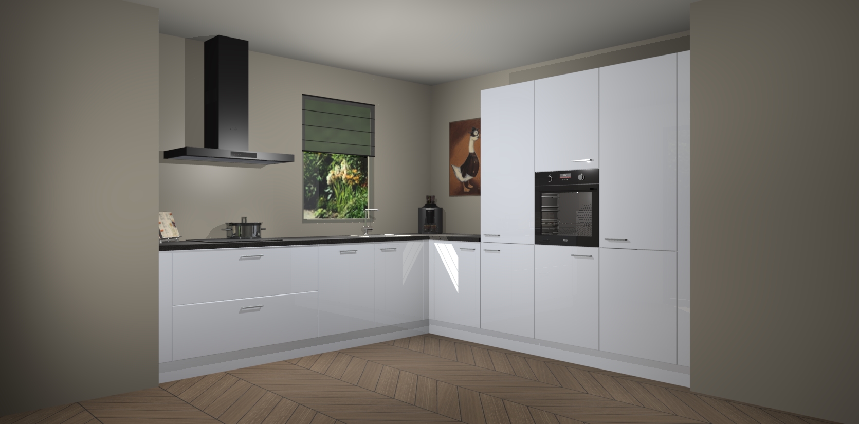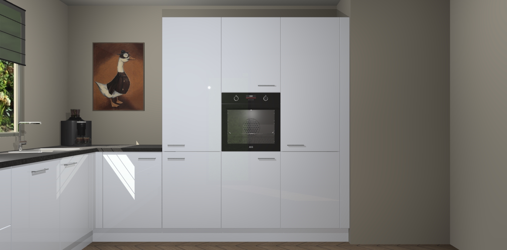 Welkom bij de Sneeuwwitte hoogglans keuken Laos. Deze prachtige keuken zal de komende jaren het middelpunt van de belangstelling in uw huis zijn. Uitgerust met vijf inbouwapparaten komt u nooit kookgereedschap tekort. Bovendien geeft de warme houtlook elke ruimte een uitnodigende en tijdloze uitstraling.